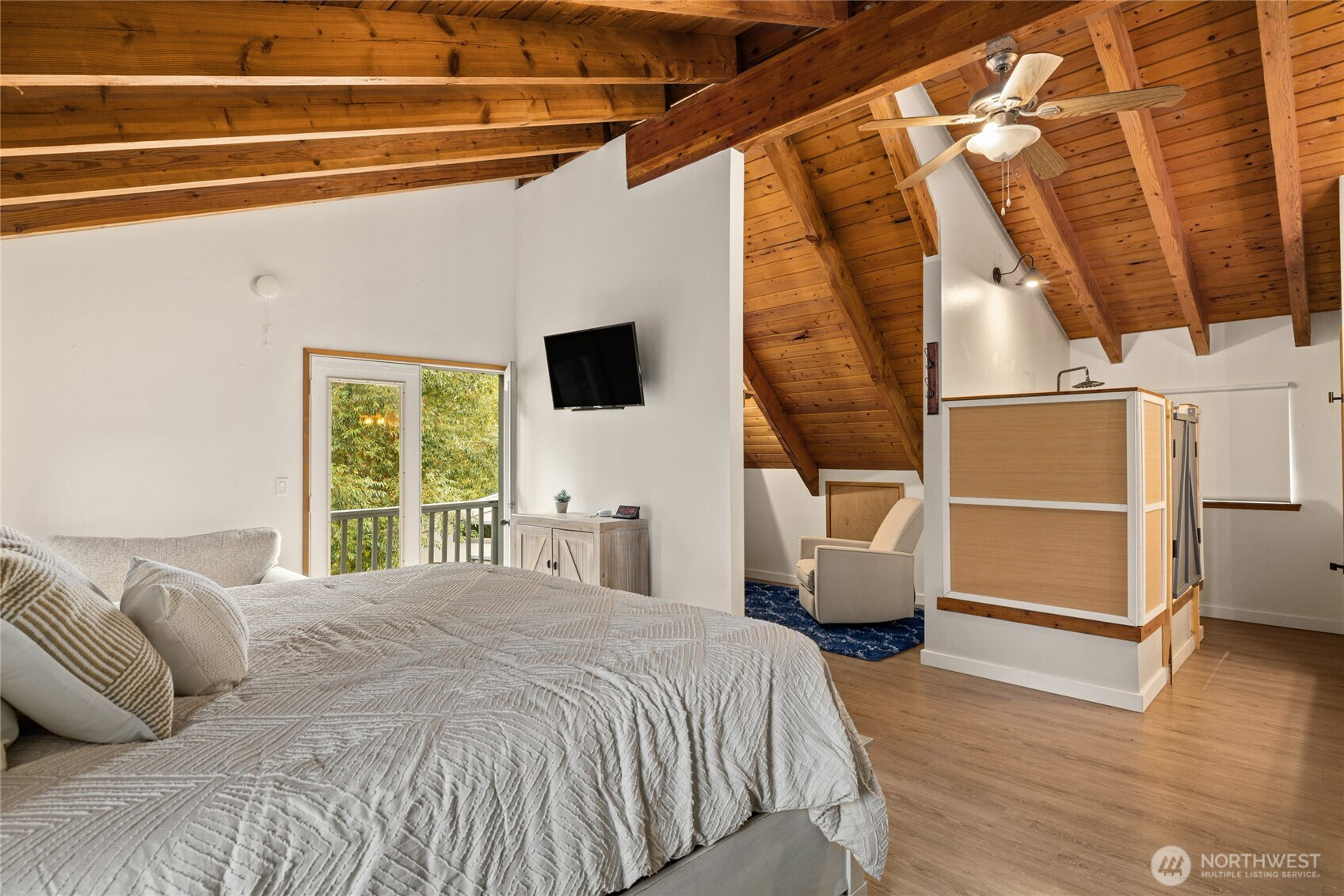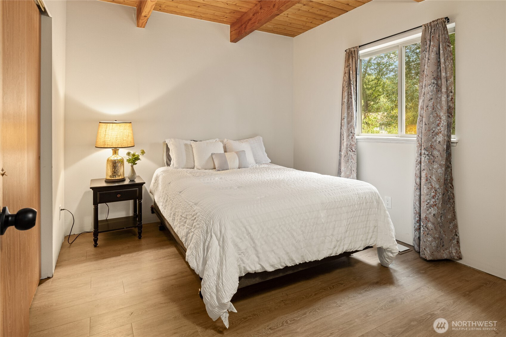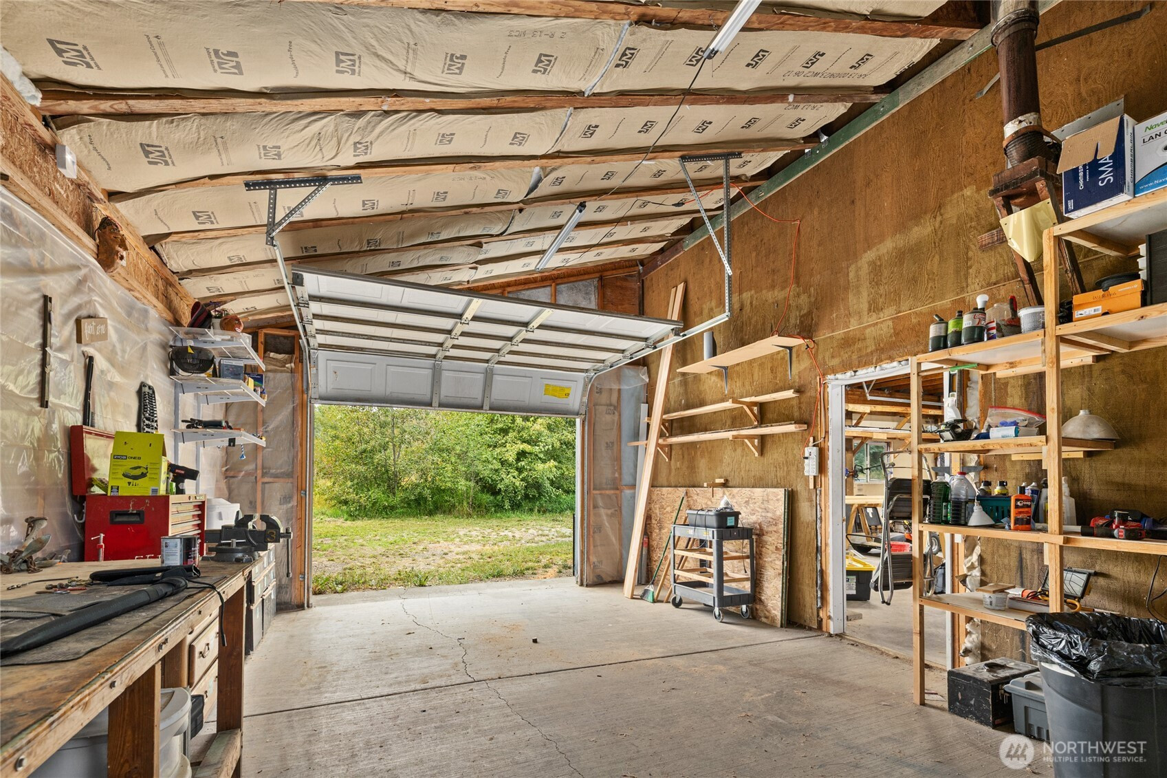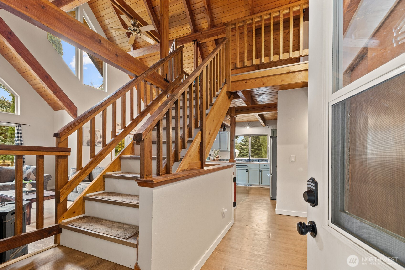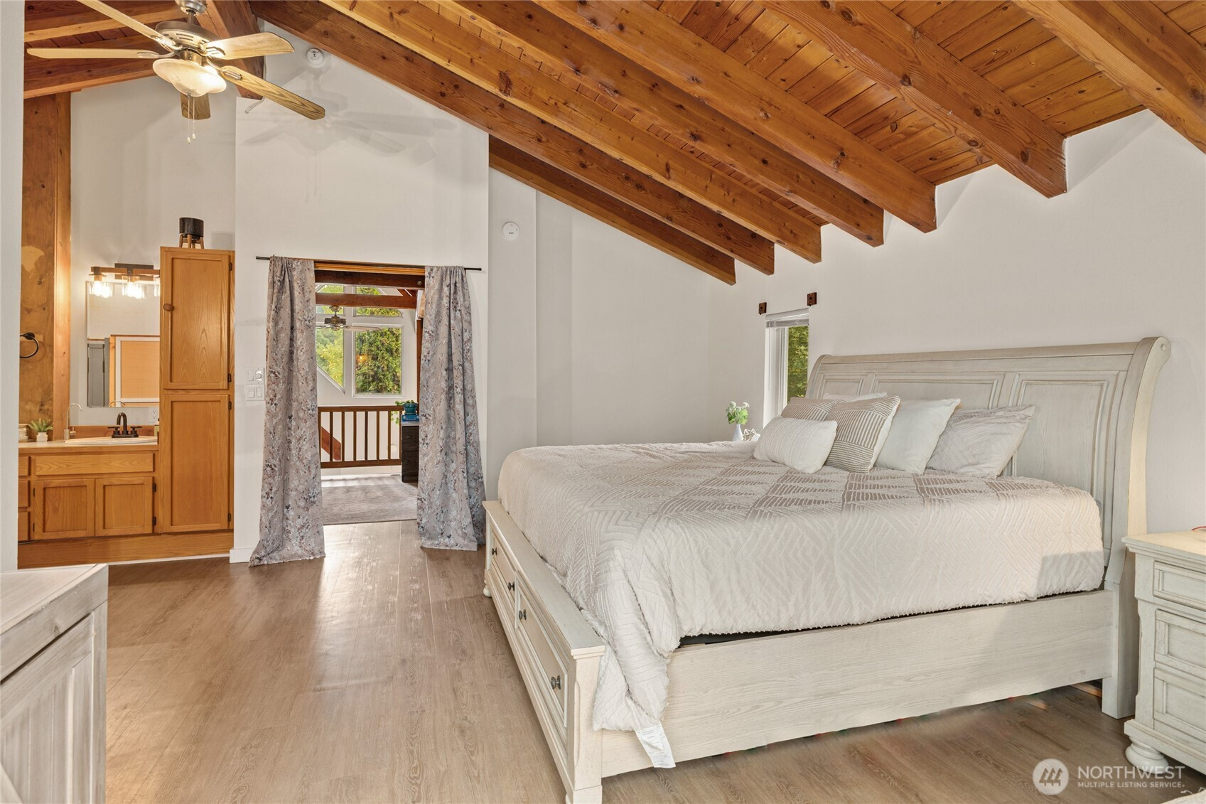 This private, cozy 1,620 sq ft cabin-inspired home offers a tranquil escape on a sprawling 3.38-acre lot. Discover the Great Room with vaulted ceilings & natural wood beams and tongue and groove ceiling, providing a warm, rustic elegance. The home features 3 bedrooms, including 2 comfortable guest rooms. The upper-level primary suite is a true sanctuary, featuring a walk-in closet and an ensuite w/ dual vanity and large tub+shower. The property's privacy is enhanced by a spacious deck for entertaining & large private pond & lush open pasture. Outside, a large shop w/ a dedicated workshop provides utility/storage + multiple sheds/outbuildings & fruit trees. The partially fenced acreage, complete with a dog run, awaits your outdoor lifestyle.