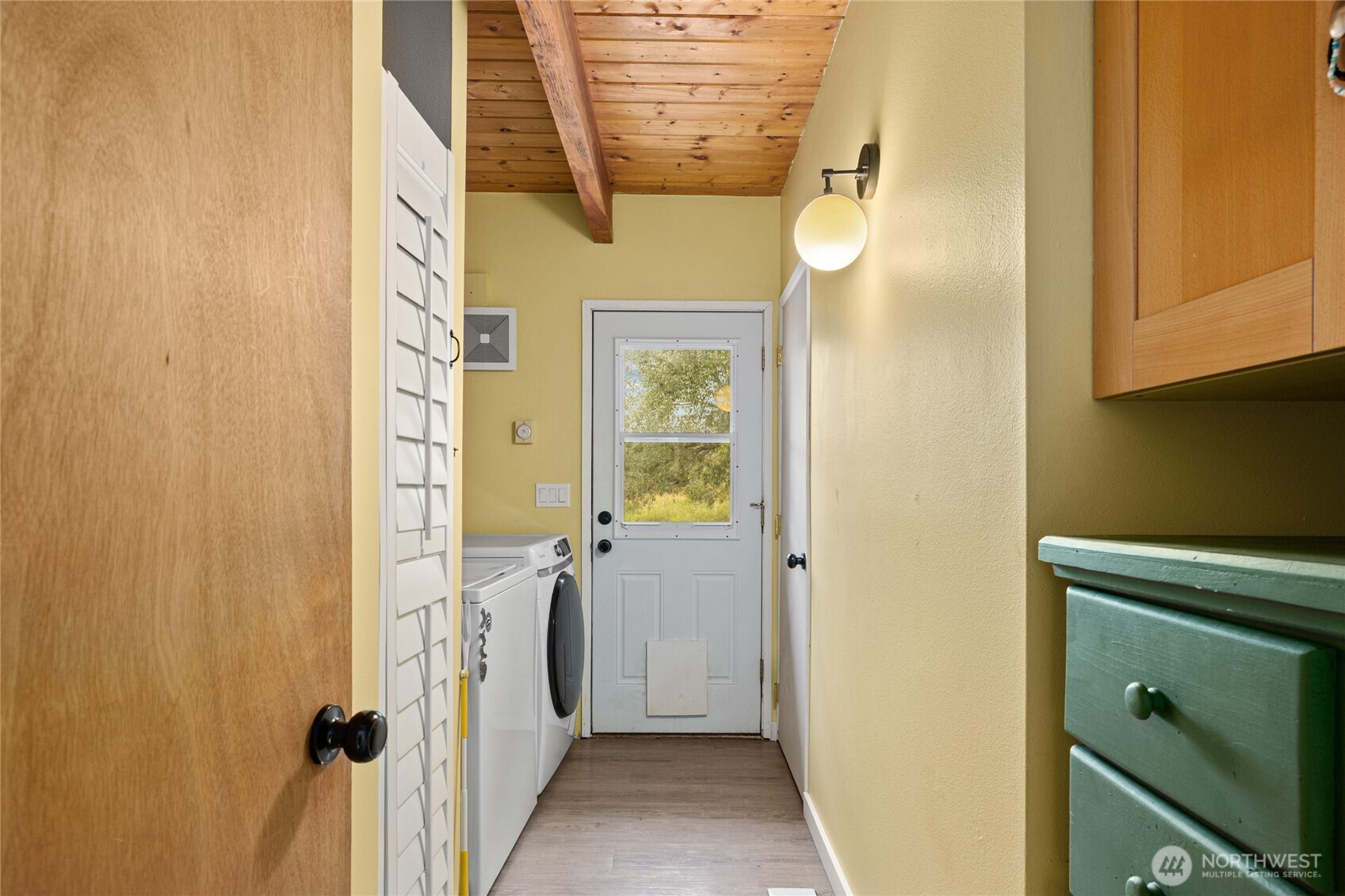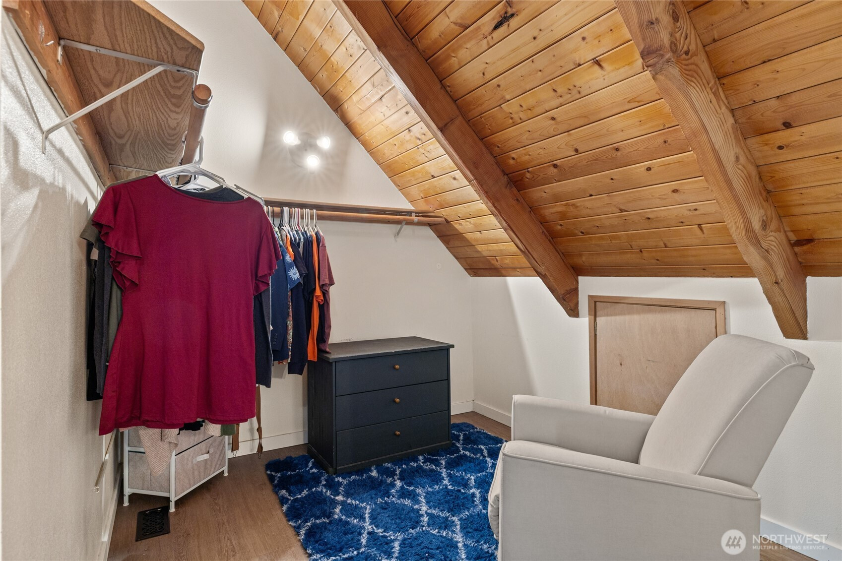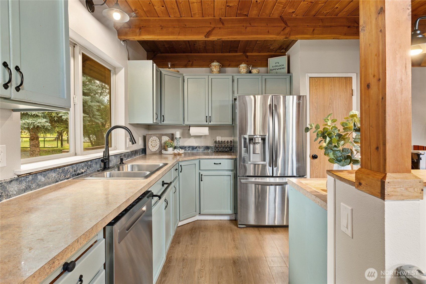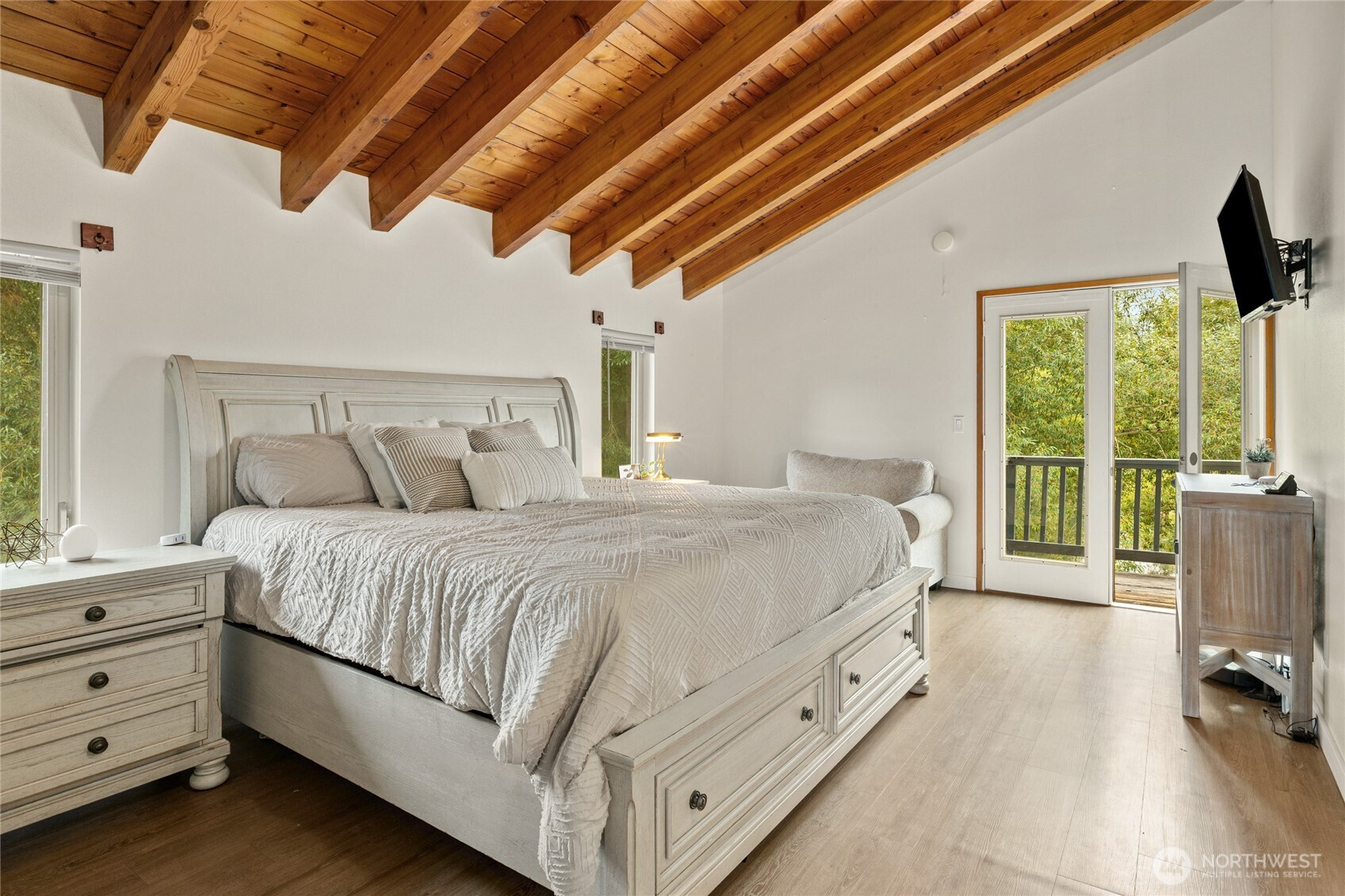 This private, cozy 1,620 sq ft cabin-inspired home offers a tranquil escape on a sprawling 3.38-acre lot. Discover the Great Room with vaulted ceilings & natural wood beams and tongue and groove ceiling, providing a warm, rustic elegance. The home features 3 bedrooms, including 2 comfortable guest rooms. The upper-level primary suite is a true sanctuary, featuring a walk-in closet and an ensuite w/ dual vanity and large tub+shower. The property's privacy is enhanced by a spacious deck for entertaining & large private pond & lush open pasture. Outside, a large shop w/ a dedicated workshop provides utility/storage + multiple sheds/outbuildings & fruit trees. The partially fenced acreage, complete with a dog run, awaits your outdoor lifestyle.