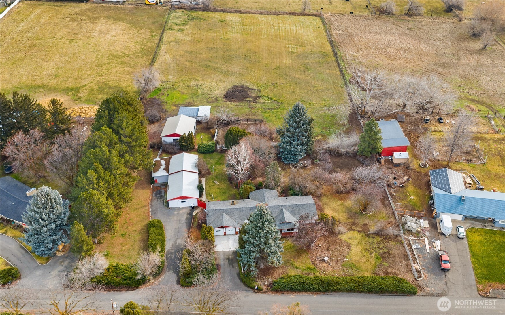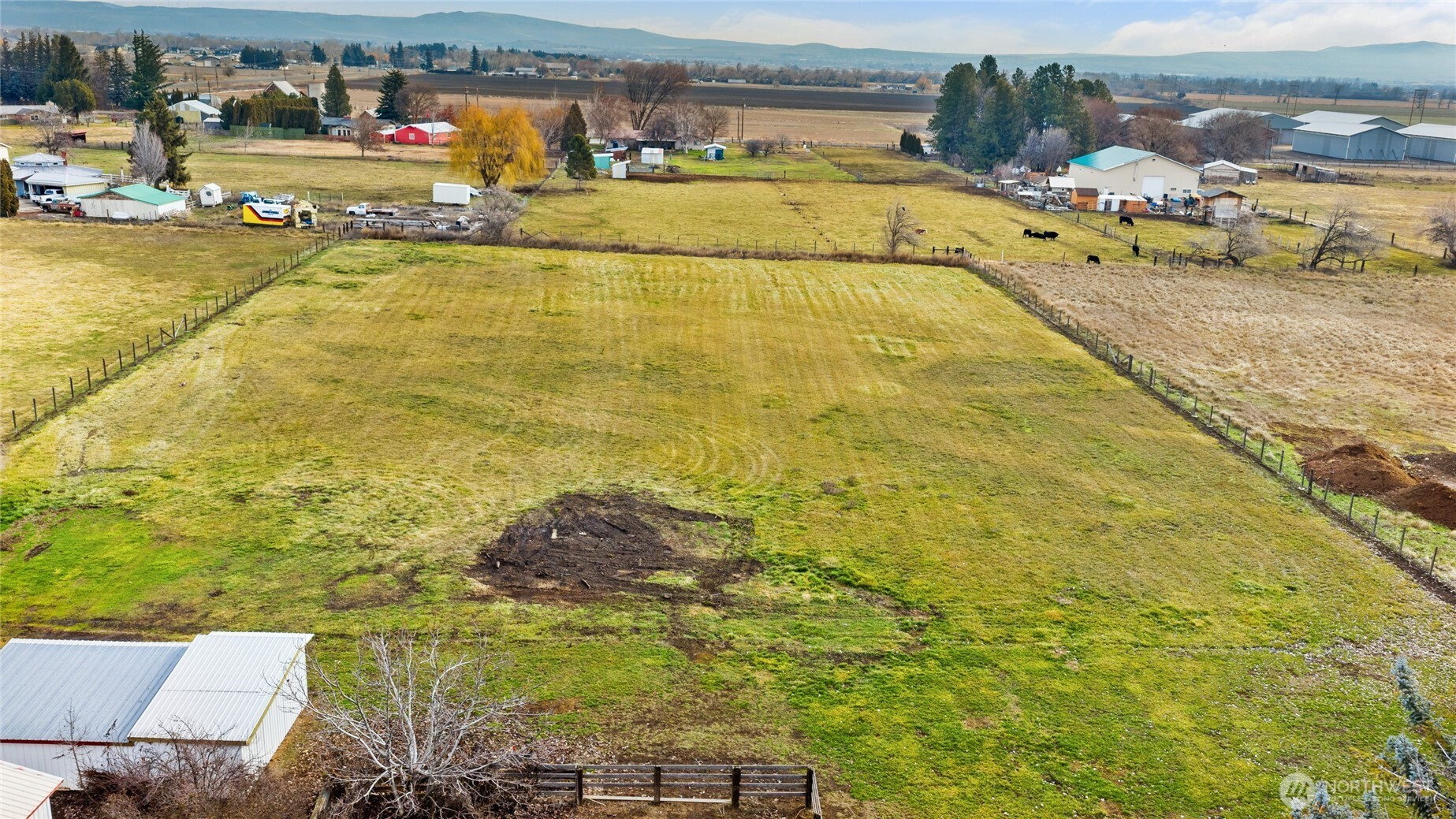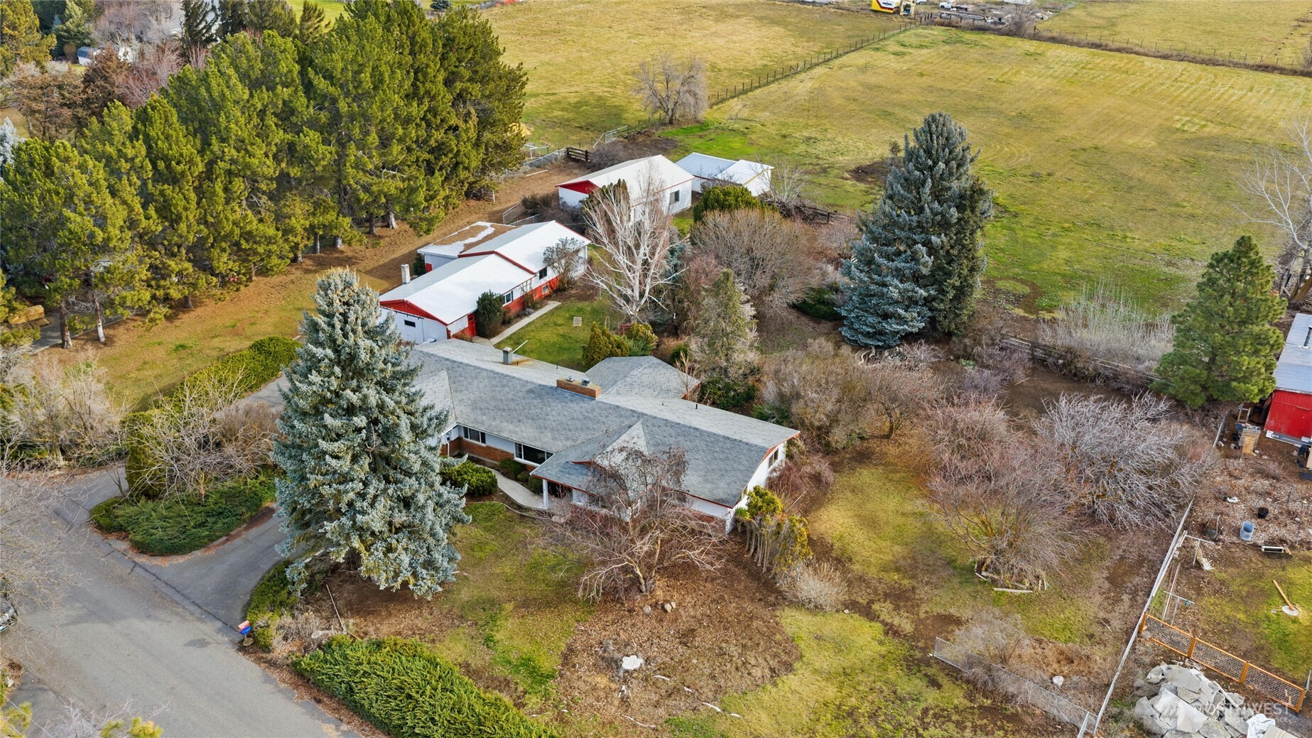 Opportunity to buy into a neighborhood where people move in and stay! This desirable country setting features small acreage properties-ideal for modern homesteading, animals, gardens, fruit trees, or simply enjoying privacy & open space! Situated on 3.4 irrigated acres with fenced fields, this 1,889 sq ft single-level home offers 3 bedrooms and 1.75 baths. Inside you’ll find two spacious living areas — each with a fireplace creating warm and inviting spaces year-round. Hardwood flooring highlights the dining room and great room, and a lovely patio just off the great room extends your living space outdoors. The primary bedroom includes a private ¾ bath, and all bedrooms are generously sized. A dedicated laundry room offers additional storage and connects to the attached garage, which includes a work/storage room housing the mechanical systems. Newer HVAC for heat and cooling throughout the home. Well pump new in 2025. Outbuildings add tremendous value and flexibility: Heated workshop/garage with multiple spaces that has extra storage with garage door access. Newer 28x36 garage/shop with concrete floor and electricity. Fenced field with a shelter barn that's perfect for a horse, cows & 4H animals. Garden areas, fruit trees, sprinkler system! Mature landscaping, minutes from town, and easy freeway access complete this rare small acreage opportunity!