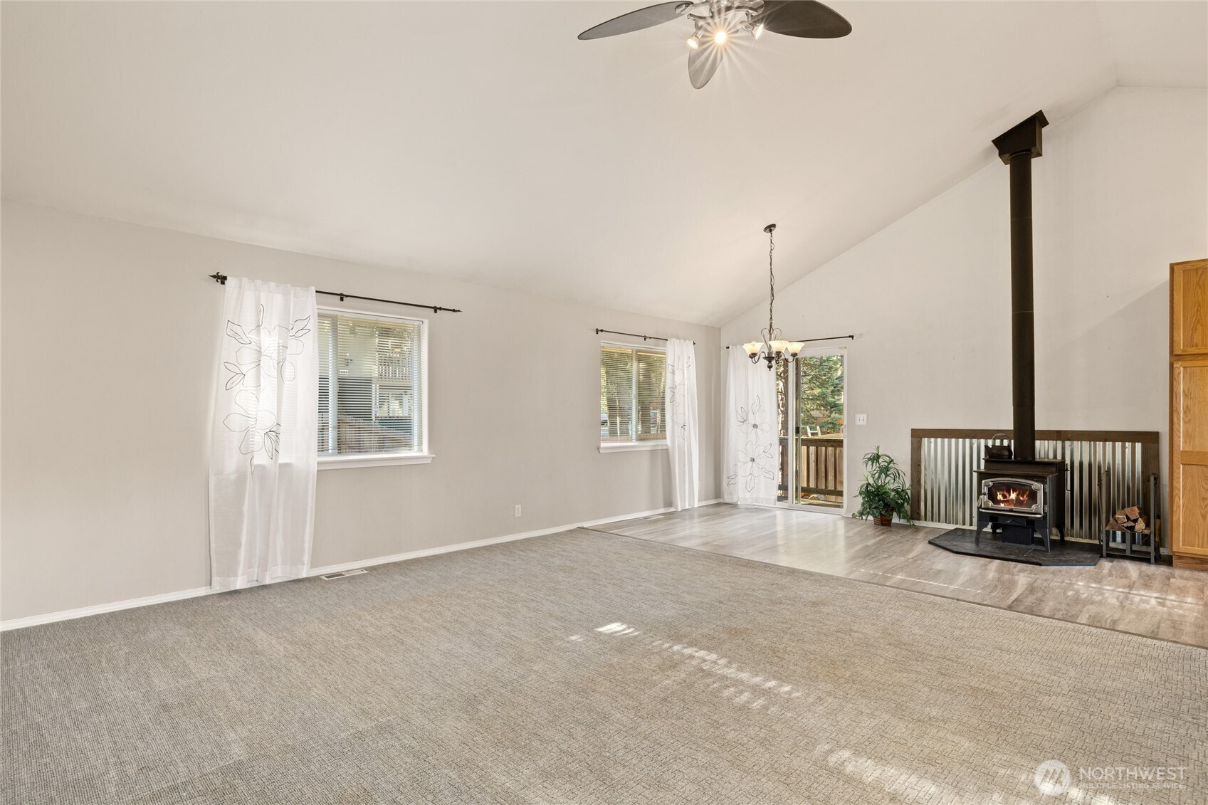 Charming rambler on a quiet cul-de-sac in desirable Cle Elum Pines. This well designed home features vaulted ceilings in the main living areas for that open feel. Kitchen has lots of storage & a view of the front yard. The air conditioning and wood burning stove will keep you comfortable in all seasons. The spacious primary bedroom has a nice attached bathroom with a large soaking tub, walk in closet, & dressing area with sink & vanity. The third bedroom would make a great home office. Washer & Dryer in main bathroom near bedrooms. The large partially fenced backyard includes a outbuilding for storing yard tools & toys. Nice front porch for relaxing. Access to Coal Miners Trail nearby, trail starts in Cle Elum & goes up to Roslyn, Easton & beyond.