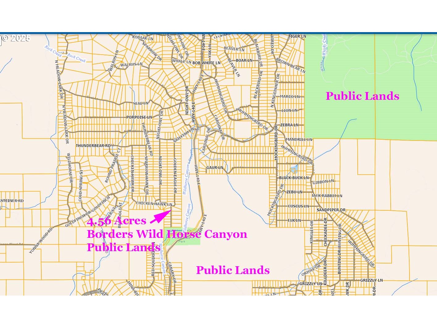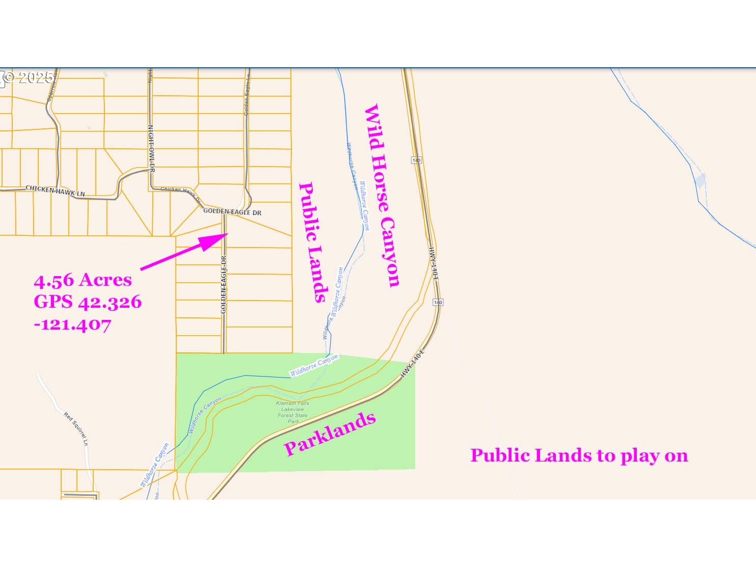 Very nice large 4.56 acres. This parcel is nicely situated, offers spectacular views, and several ideal homesites, captures the sunshine for possible solar energy if desired, and boasts numerous trees and native shrubbery.There is a driveway cut in, and this one is inside the subdivision far enough that you are afforded plenty of seclusion, privacy, and personal space. Great location for a homesite or campsite. Located in Bonanza, Oregon – KFFE, Block 19, Lot 30, where Golden Eagle Drive crosses Chicken Hawk Lane.