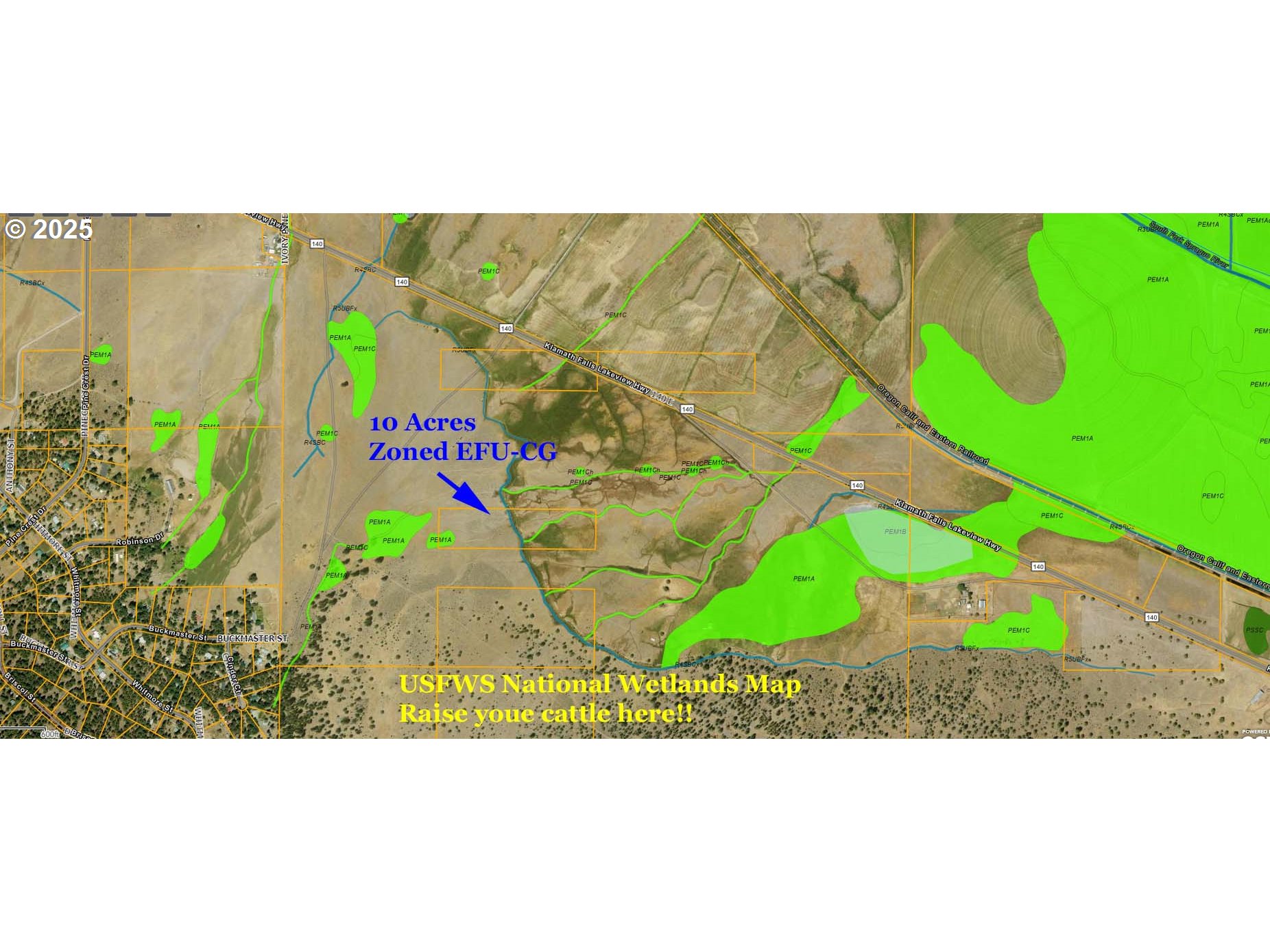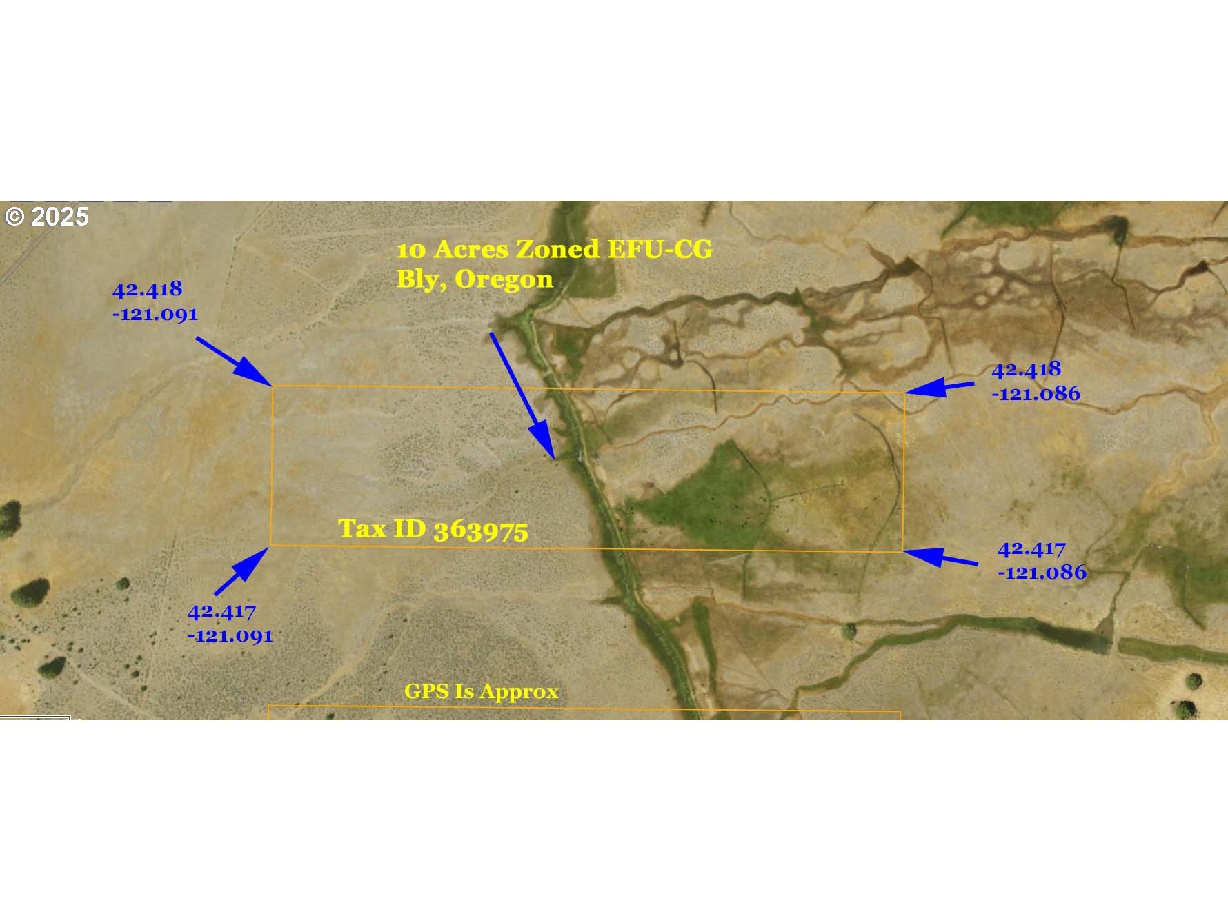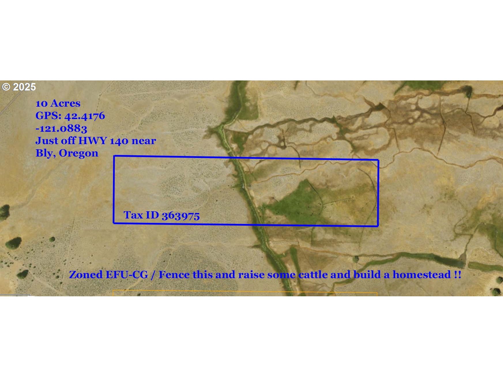 This is a rare and unique opportunity to purchase 10 acres in Bly, Oregon. This lovely flat to-gentle slope parcel boasts EFU-CG Zoning!Permitted Uses: In the EFU-CG zone, permitted uses typically include single-family dwellings, manufactured homes, essential services, and uses related to farming and ranching, subject to site plan review and other applicable standards.This is the perfect location for what you have been thinking about. Wanting to raise some cattle? Fence this off, bring out the cattle, and start your homestead. It is situated perfectly and has the USFWS National Wetlands designation. Plenty of water here for those that graze!!GPS For this parcel is 42.4176-121.0883 Look it up online. Beautiful area.