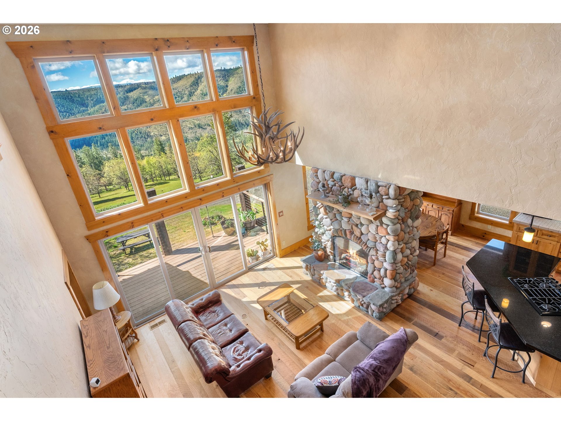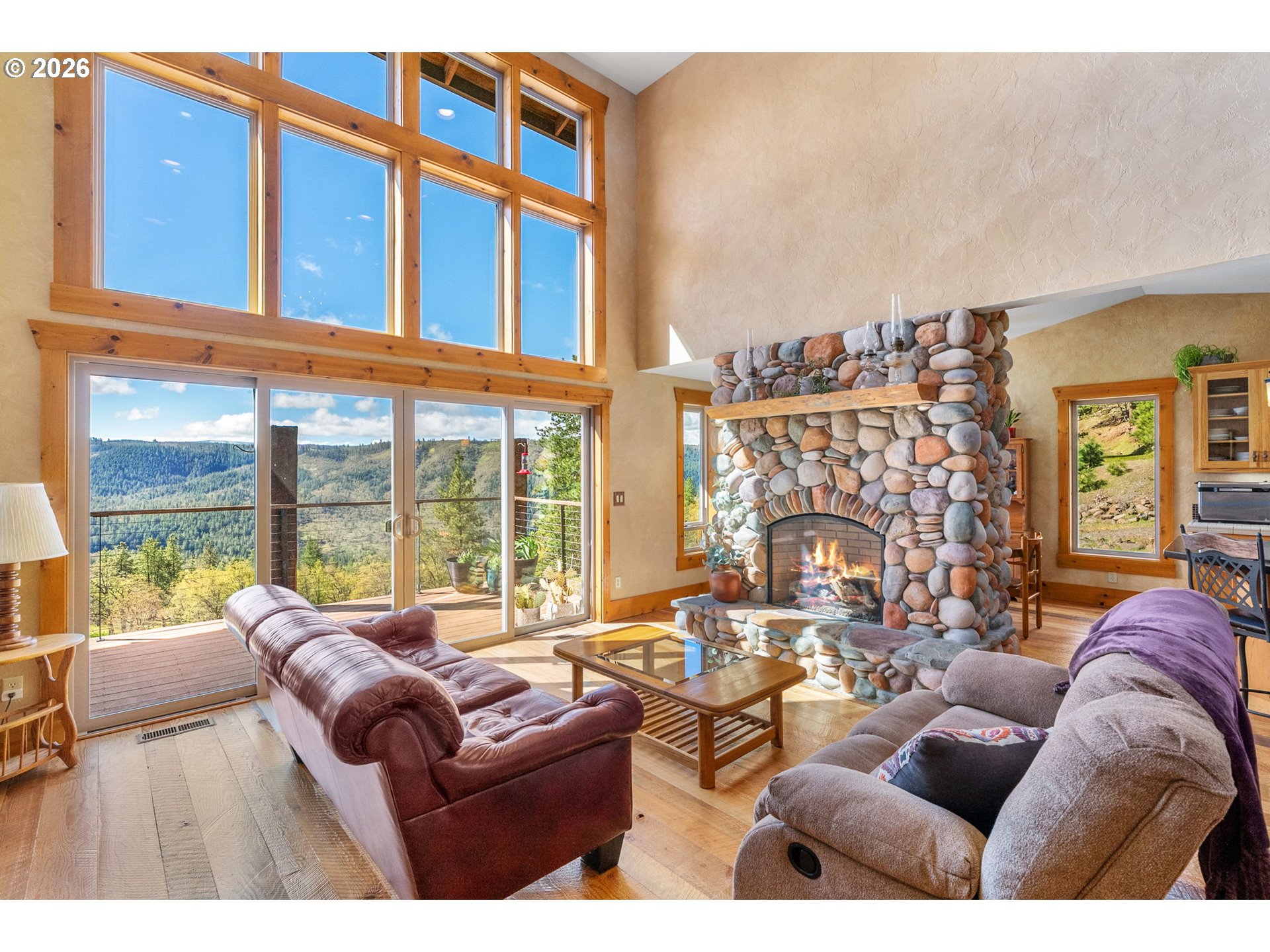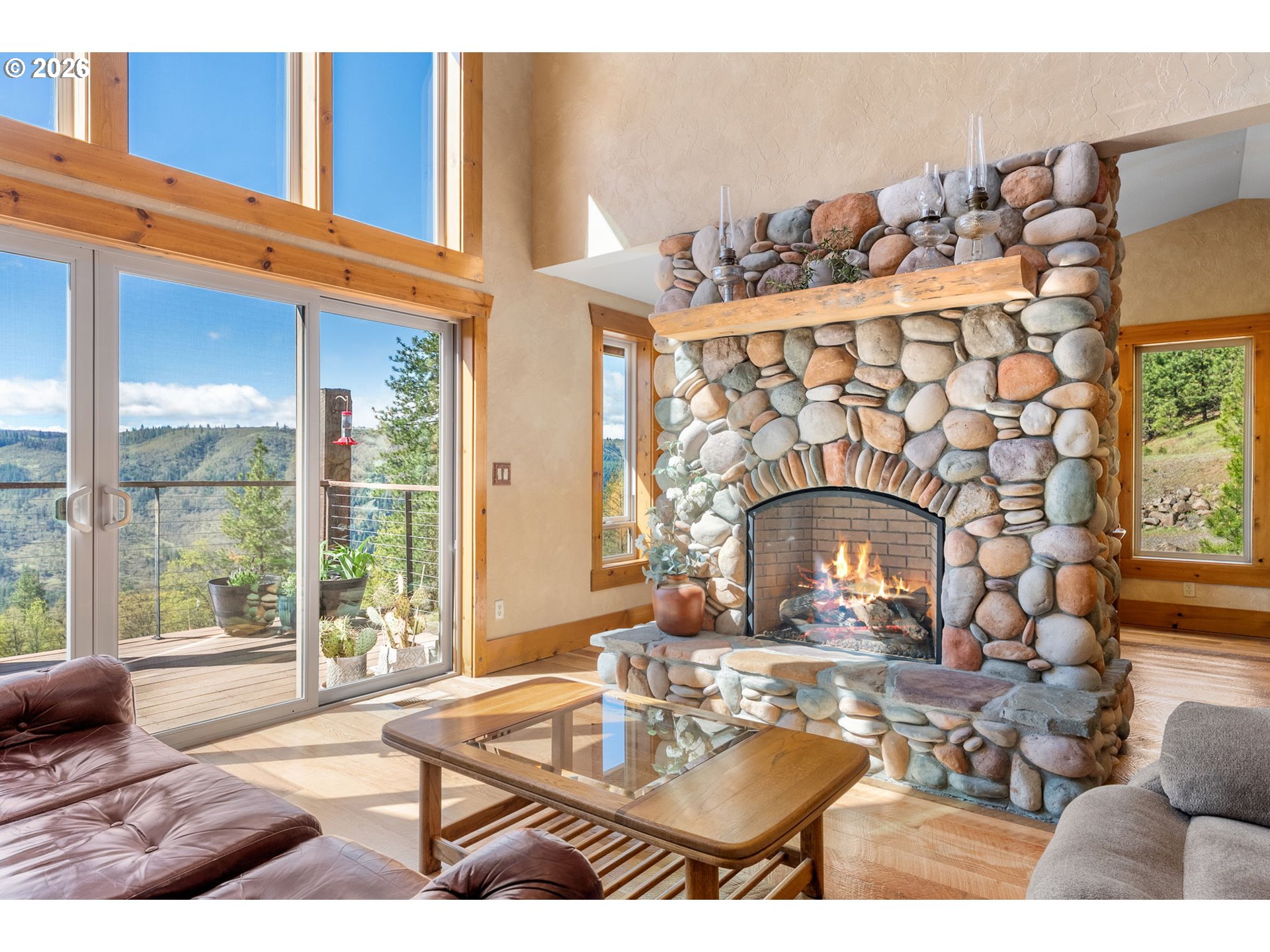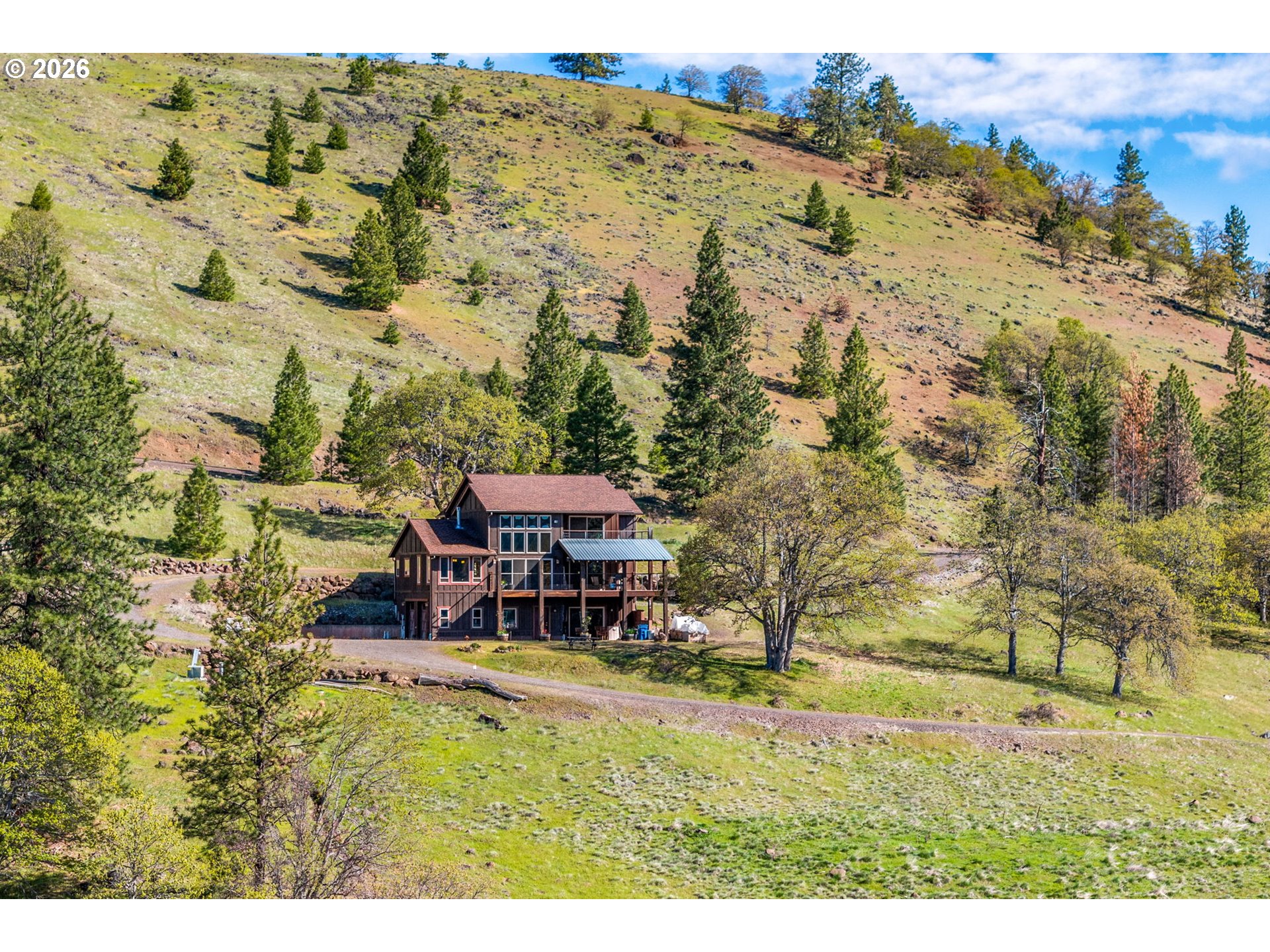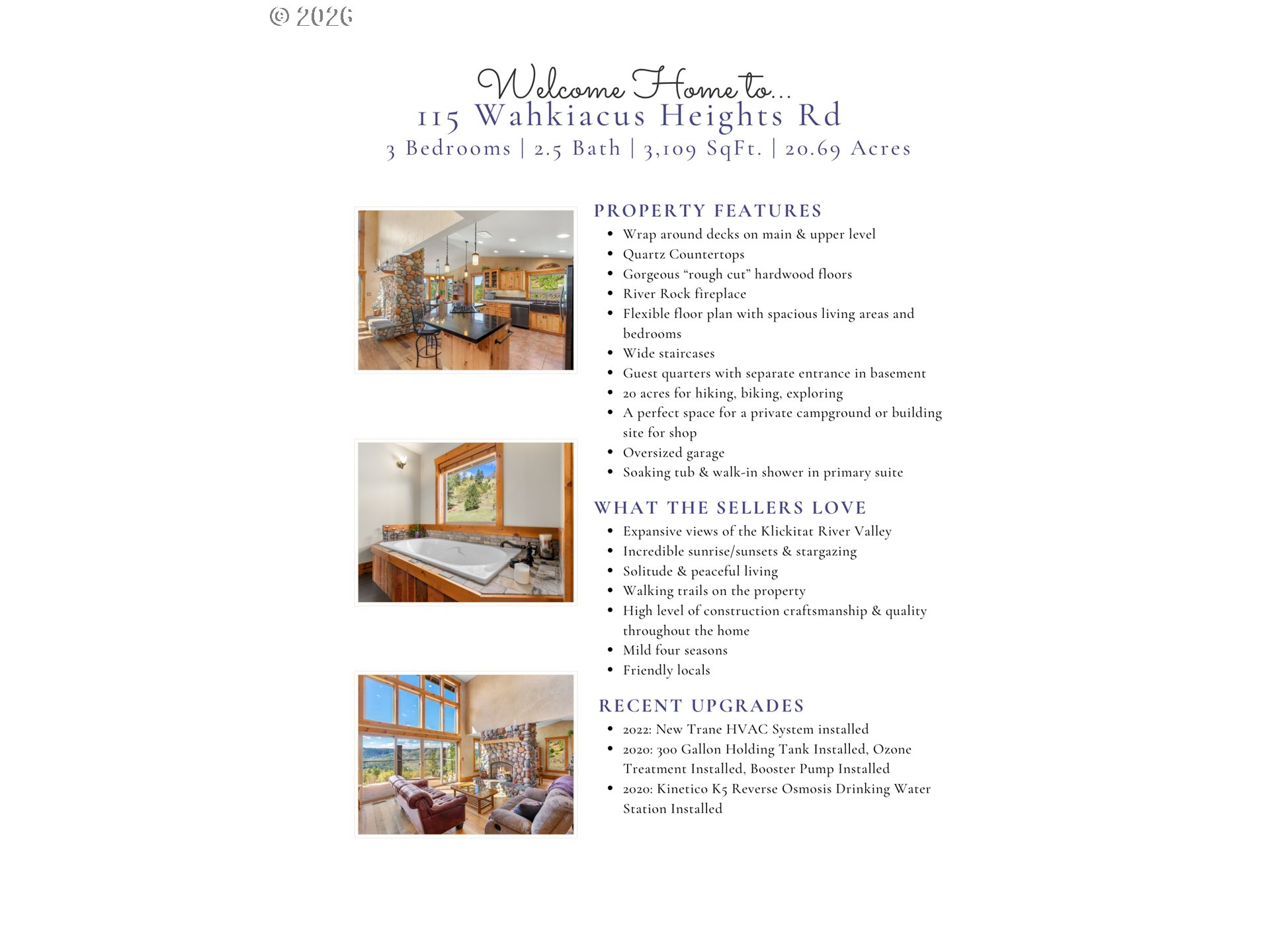 Welcome home to this custom lodge-style home set on just over 20 acres of private, wooded landscape overlooking the Klickitat Canyon. Thoughtfully designed to embrace its surroundings, this three-story home offers expansive decks positioned to capture sweeping territorial views and create a seamless connection to the landscape. A beautiful river rock fireplace anchors the main living space, complemented by hardwood flooring, quartz countertops, and an open-concept kitchen and living area designed for both everyday living and entertaining. Flexible layout offers multiple living options, with the choice of a main-level or upper-level primary, a lower level that can function as a bedroom suite or bonus living space, and a spacious main-level room ideal for an office or additional bedroom. Enjoy a large walk-in shower, relaxing soaking tub, and heated tile floor in the primary bathroom. Wide staircases provide an effortless flow between levels. The property offers a lovely blend of privacy, natural beauty, and usability, with established hiking and biking trails throughout and several tranquil spots to sit and take in the quiet and surrounding wildlife. The south portion of the acreage lends itself to a variety of uses—from your own private campground or RV setup to space for an additional outbuilding or shop. Ideally located near the 31-mile Klickitat River Trail for year-round hiking, biking & fishing. Enjoy nearby dining at Huntington’s Steakhouse or the local Klickitat coffee shop & café, or take a scenic drive along Hwy 142 to Lyle for world class wineries & hiking or the many restaurants & shops of Hood River or White Salmon, then return to a setting that feels private, peaceful, and distinctly your own.