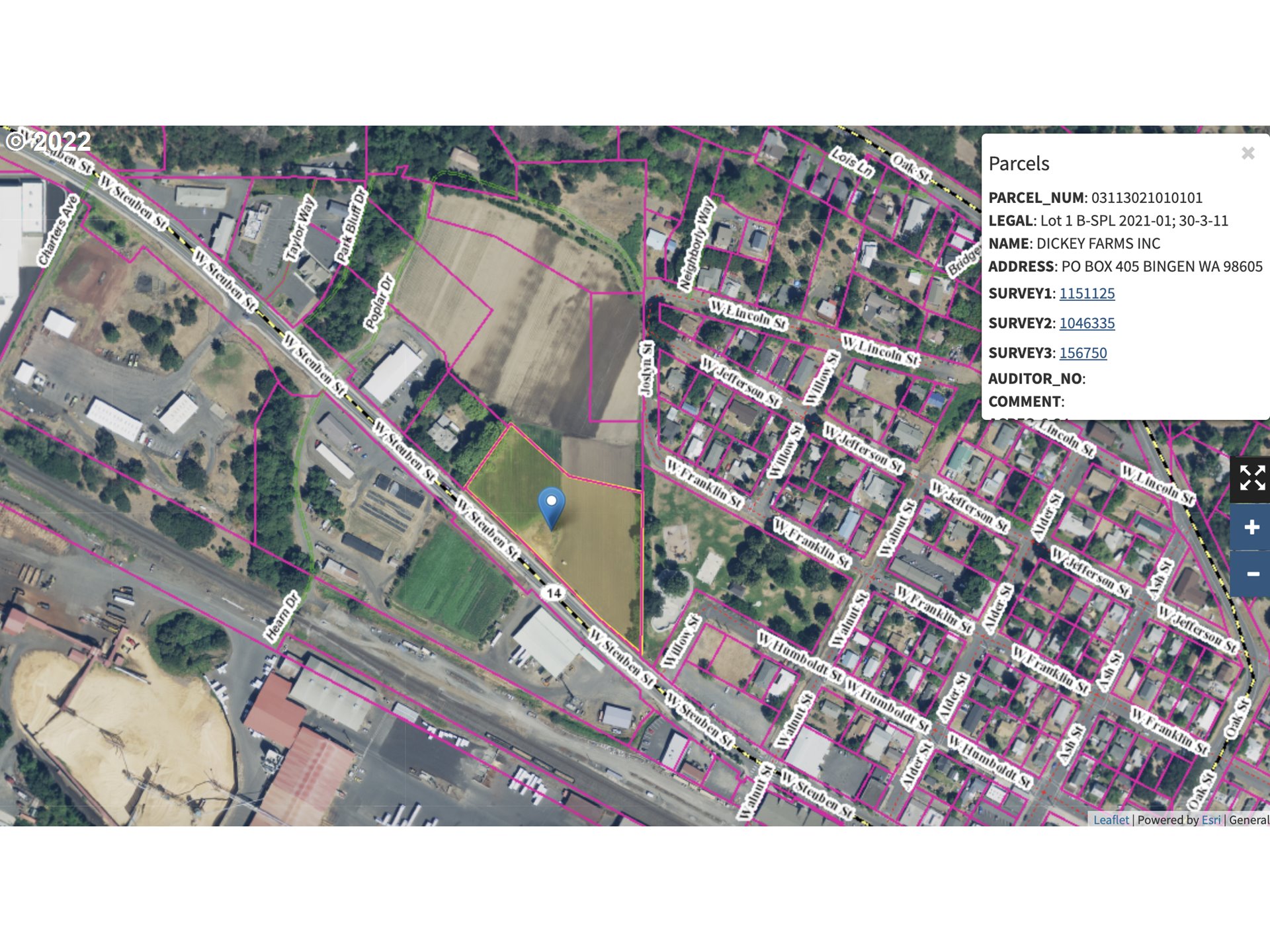One of the LAST and greatest development opportunities in Bingen! Frontage on State Hwy 14 lends to fantastic exposure. Commercial zoned- make it a hotel, mini storage, etc. Tons of possibilities! Property is in tax deferral, check with the county/city of Bingen. Buyer to conduct proper due diligence.