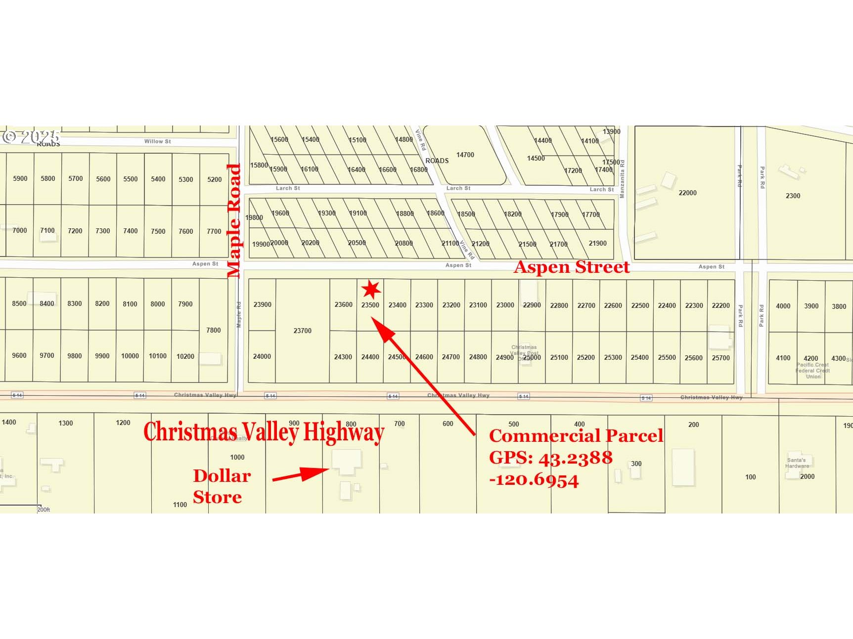 .27 Acre Commercial land parcel located on Aspen Street in Christmas Valley, Oregon. Great parcel with a light brush cover. There is power, phone, fiber optic internet, and community water available for this parcel. Situated nicely just off the Christmas Valley Highway. This is a very affordable parcel just waiting for your creative ideas for development. Live, work, and play in affordable Christmas Valley.No Owner Carry.