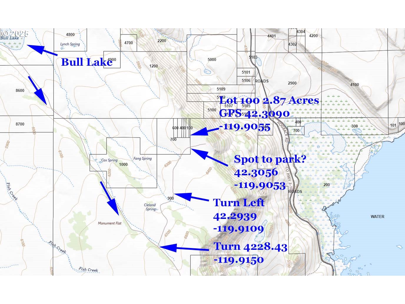 Perfect affordable get-a-way / bug-out location with expansive views of the Fish Creek draw. Bull Lake, Priday Reservoir, and Crump Lake, all minutes away. This lovely view parcel borders public lands on 3 sides with over 11k Of Public Lands to play on and has good dirt road access. Numerous springs, creeks and lakes in this area. If you are looking for a great hide-a-way this is the one. Heavily treed, flat areas and sloped areas. No Owner Carry