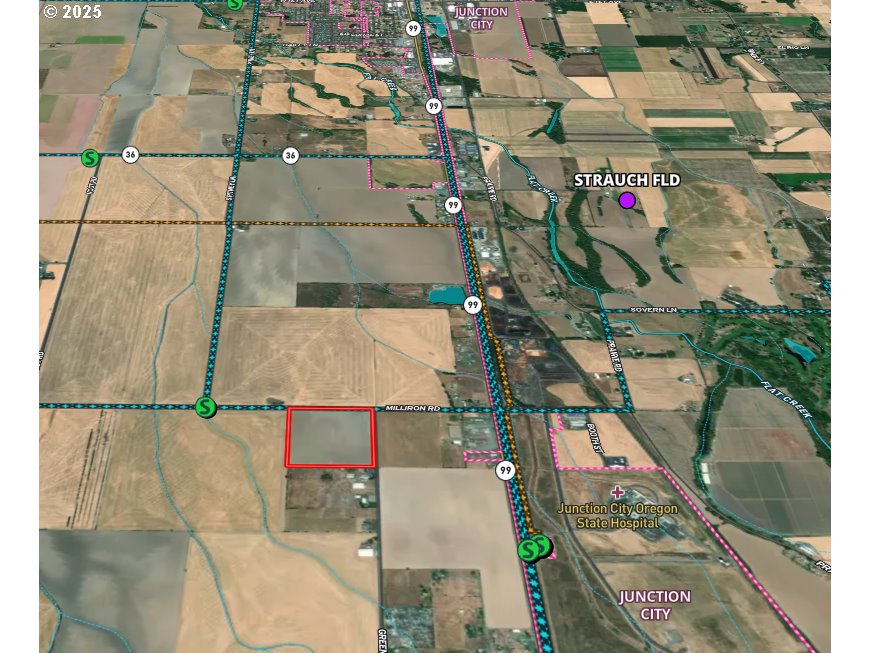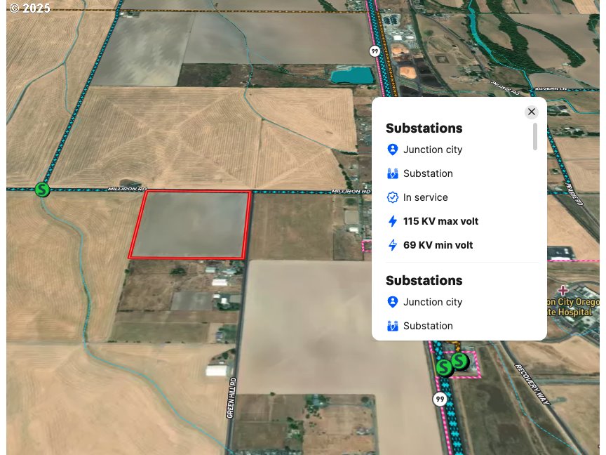 This 38 acre Exclusive Farm Use (EFU) zoned farm property primarily consists of Awbrig soils and some Coburg soils, ideal for farming grass seed. There may be some future opportunity for a solar farm because of the proximity to substations (1,200 ft away on Milliron Rd and 4700 ft. away on Hwy 99). A 115kv line runs along the north side of the property. If the property meets the State and local siting criteria, his could be an excellent opportunity for long term solar investment w/ agri-voltaics potential.