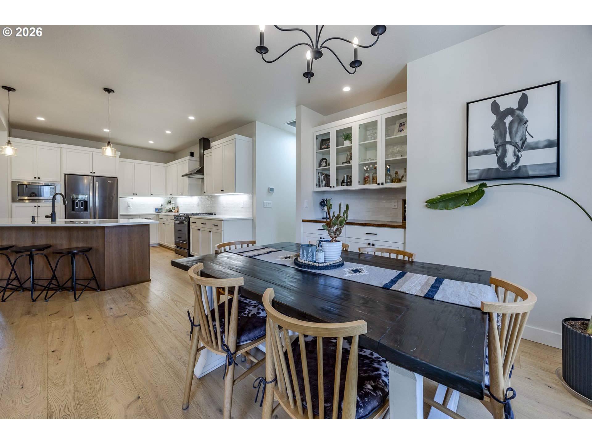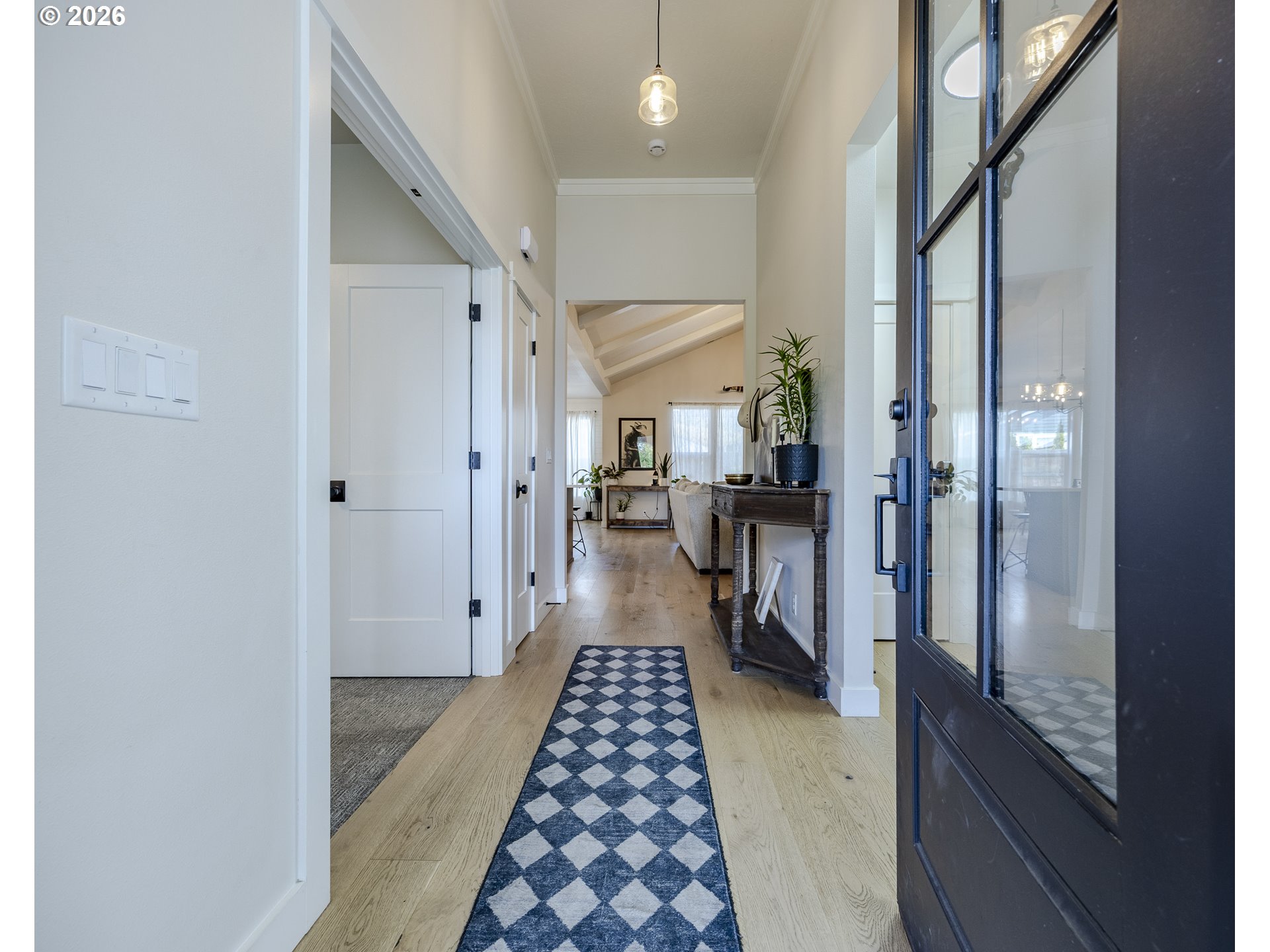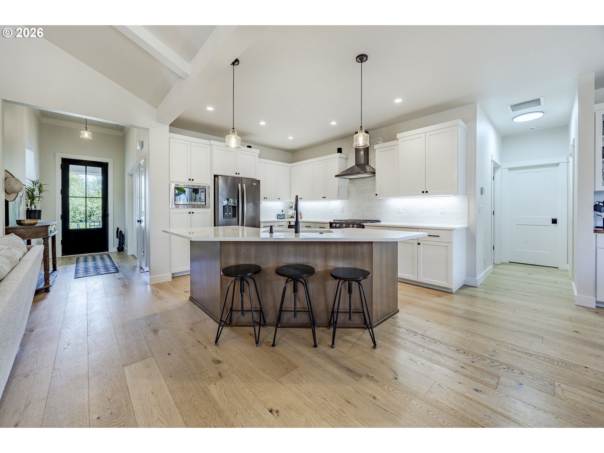 Stunning custom Bruce Weichert home in a highly desirable neighborhood! This exceptional single-level residence showcases wide-plank white oak flooring throughout. The gourmet kitchen features custom cabinetry ,quartz countertops, high-end appliances, under-cabinet lighting, a spacious island and a generous pantry. The inviting great room boasts a beautiful beamed ceiling and a striking gas fireplace, perfect for relaxing or entertaining. A generous dining area includes a built-in serving space for added convenience. The vaulted primary suite offers a spacious walk-in closet for ultimate comfort. Additional highlights include RV parking with hookups, attic storage, wired for generator, outdoor hot/cold spigot and a low-maintenance yard. Ideally located near trails, parks, and schools this home truly has it all.