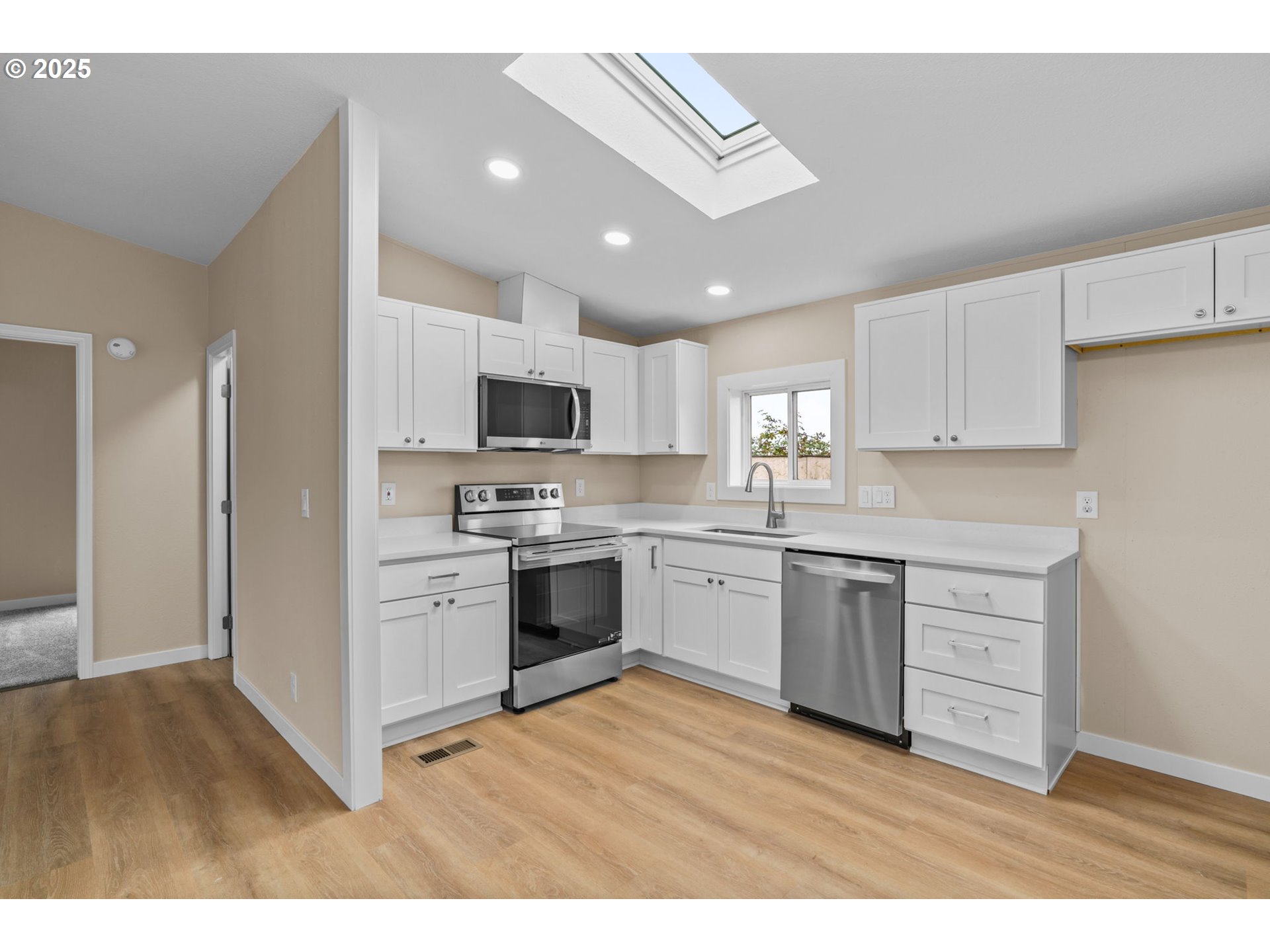 This beautifully remodeled home combines modern style with everyday comfort. It features brand-new windows, fresh interior and exterior paint, a new roof, durable luxury vinyl plank flooring, and plush carpeting in all bedrooms. The open-concept living area flows seamlessly into a bright, inviting kitchen complete with new cabinetry, sleek quartz countertops, a premium sink, and stainless-steel appliances. Every detail has been thoughtfully updated to create a truly move-in-ready home you’ll love. This home is not located in a park, but it does sit on leased land. Monthly land lease is $879, and buyer approval from the land manager is required. Schedule your private tour today!