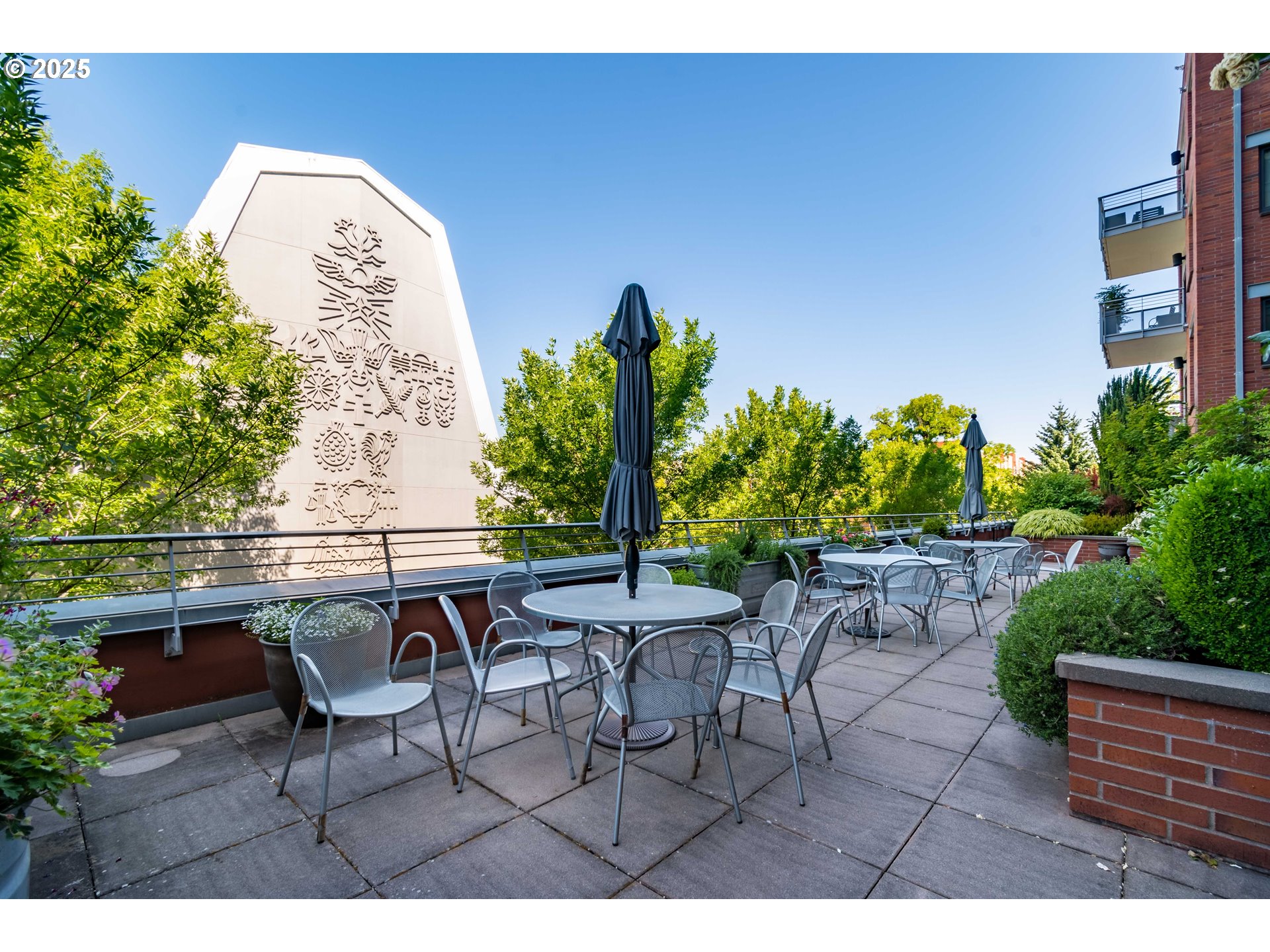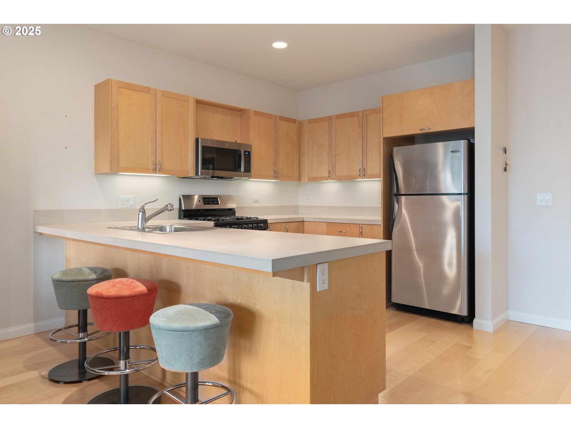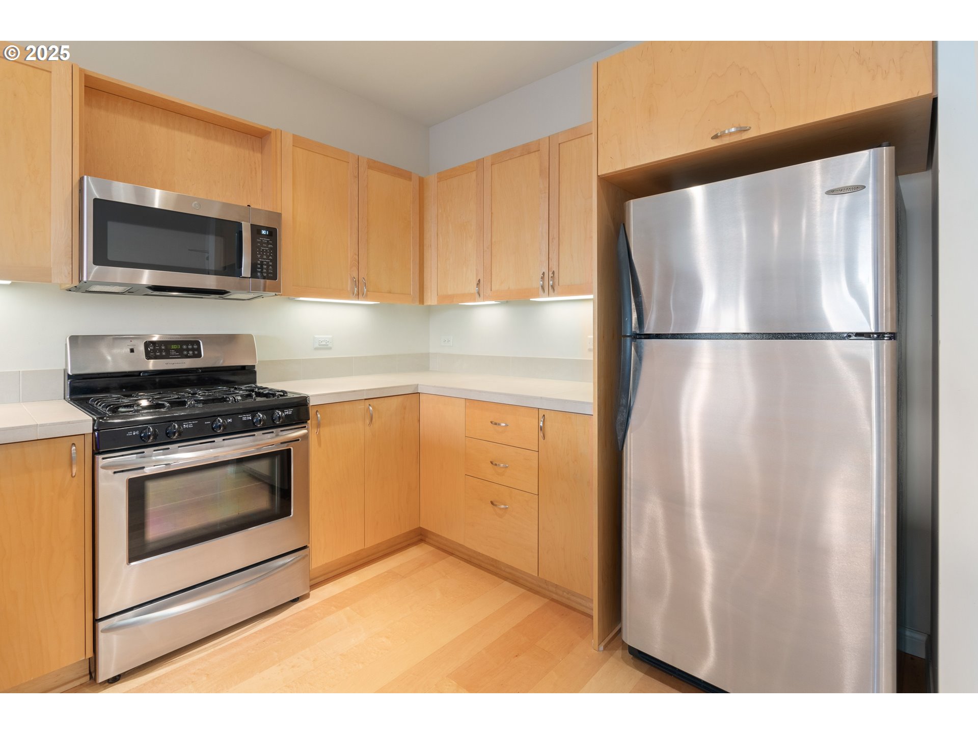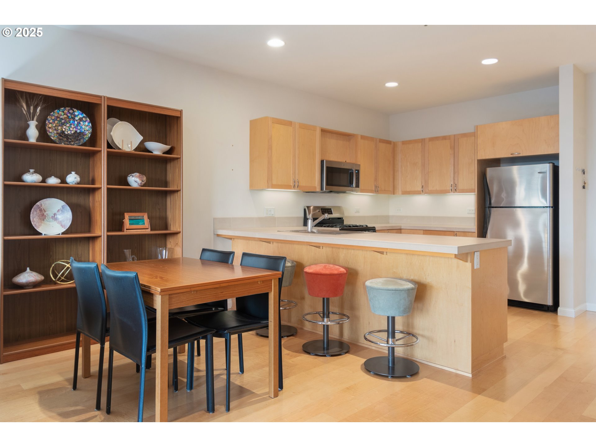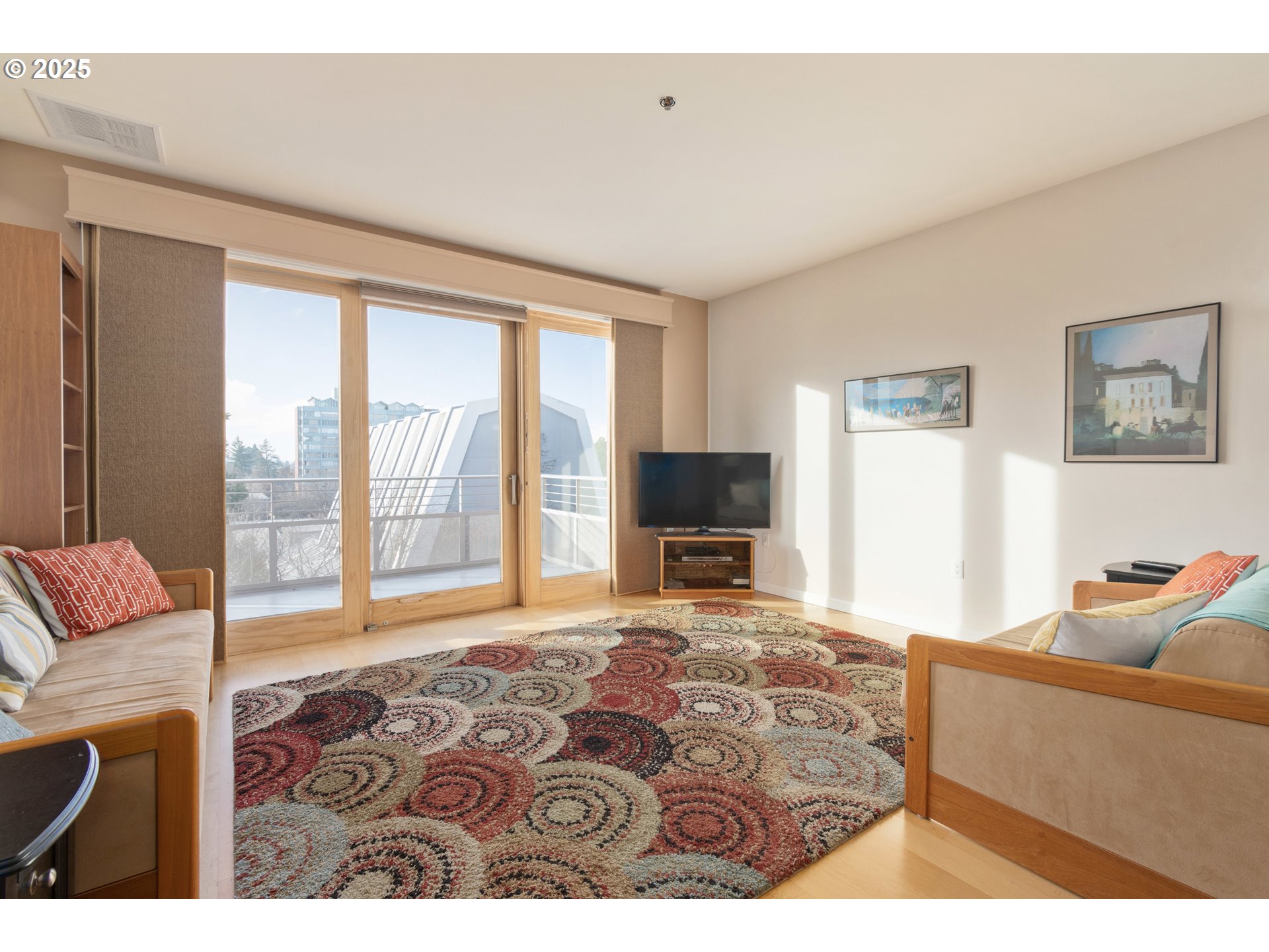 Modern downtown living at The Tate! This 5th-floor residence offers an efficient contemporary layout with upscale finishes and secure condominium living in the heart of Eugene. Large windows showcase westerly city views, paired with an open kitchen design featuring quartz countertops, stainless steel appliances, modern cabinetry, and an eat-in island ideal for everyday living. Primary bedroom has a Murphey-style bed that converts to a desk for a private WFH space.Additional amenities include in-unit laundry, heating and cooling for energy-efficient comfort, and controlled building access. The Tate provides elevator service, secure entry, bike storage, and a walkable lifestyle with immediate access to downtown dining, shopping, farmers markets, transit, and the UO campus.Unit 503 comes with a secured parking space under the building as well as additional storage unit. The Tate is the epitome of downtown living in style!