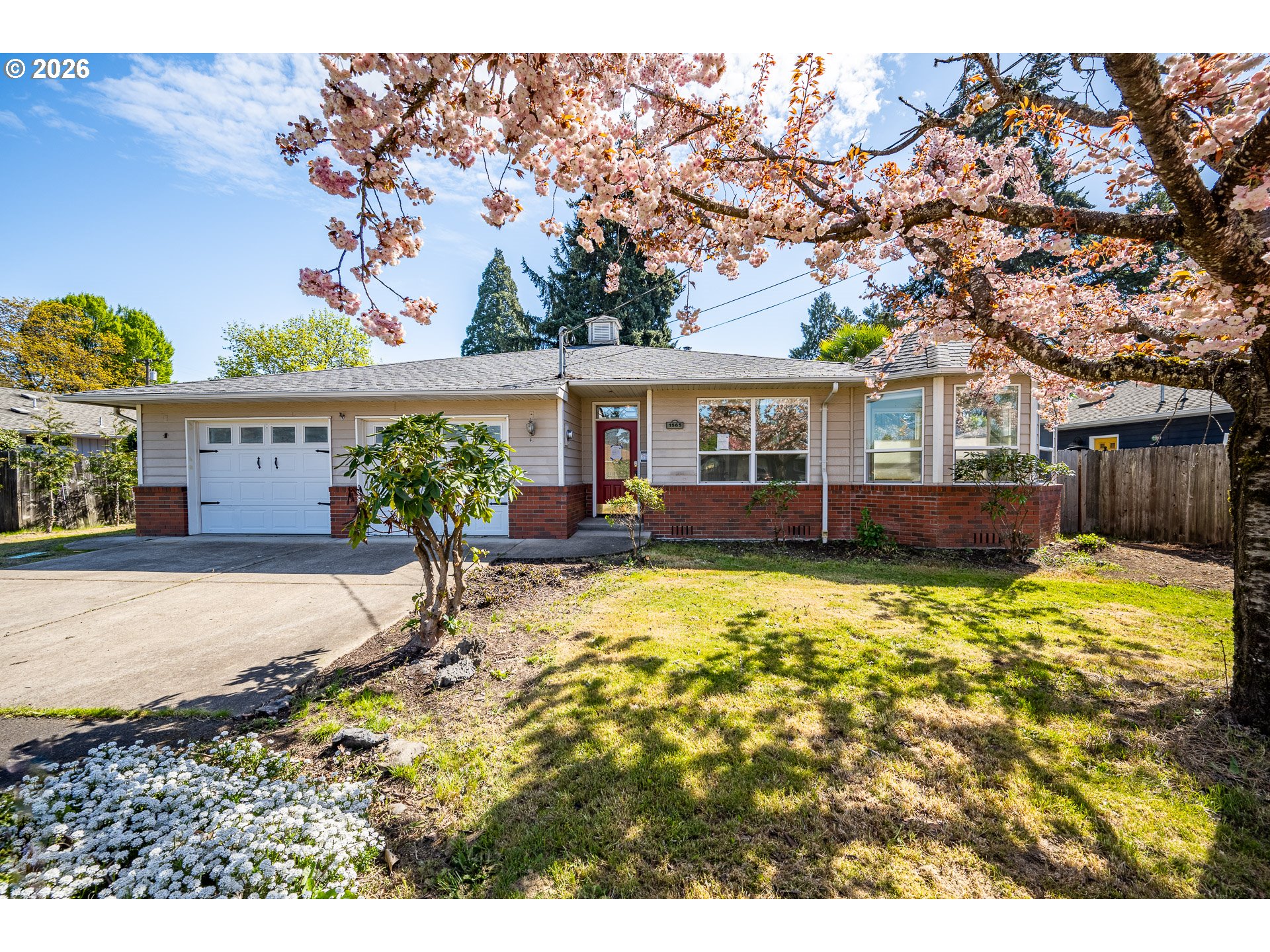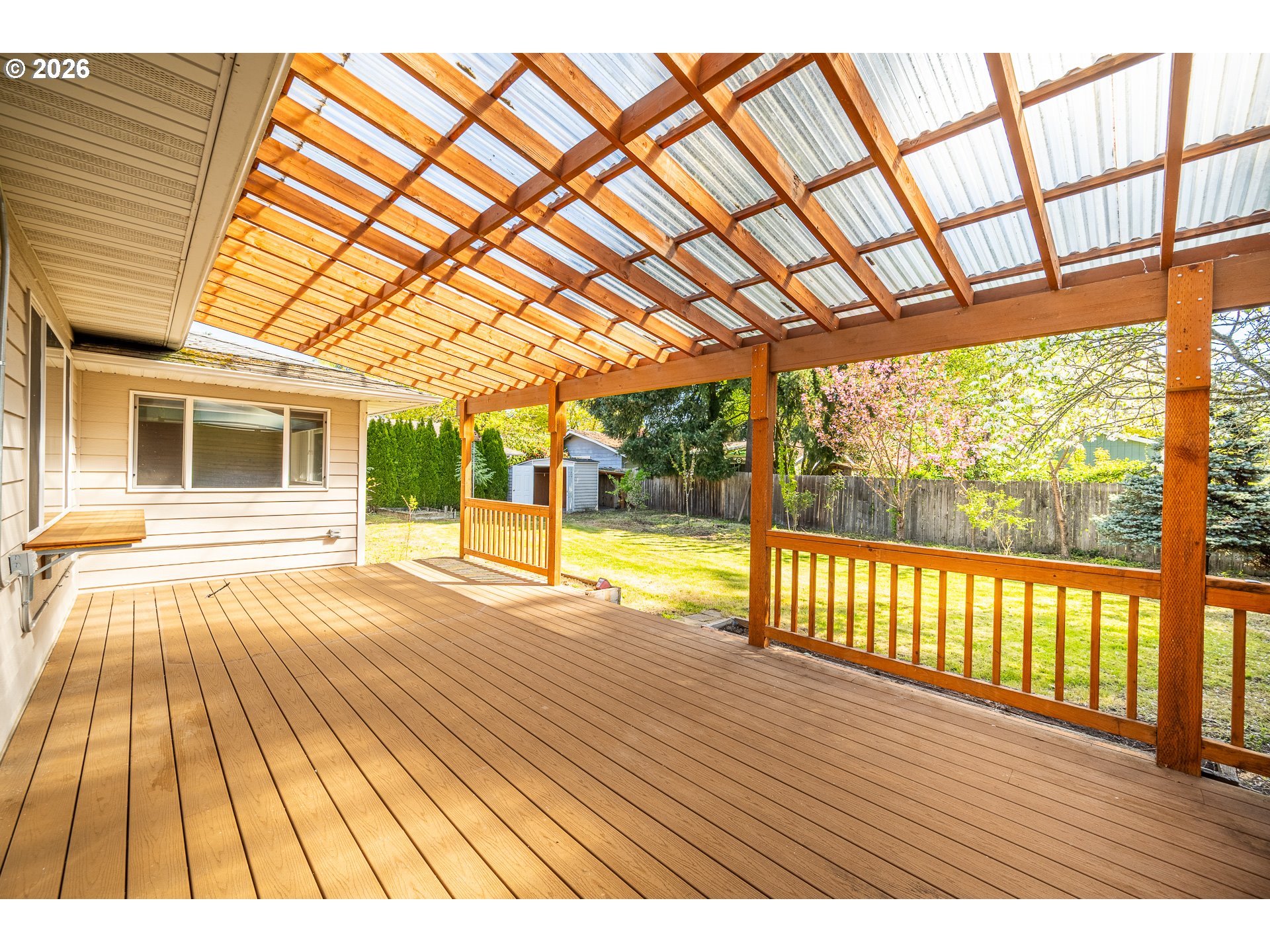 New on the market! Bank-owned foreclosure built in 1997 featuring 2 bedrooms, 2 bathrooms, and a spacious office all on a large .21 acre lot. Light and bright throughout, the living room offers a cozy fireplace and LVP flooring. The kitchen includes abundant storage, stainless steel appliances, and opens to the dining area, all with tile flooring. The primary suite features an updated tile shower and a walk-in closet, while the second bedroom includes double closets. Additional highlights include multiple storage closets and an interior laundry room with a sink.Enjoy the private covered deck with a hot tub hookup, plus a fully fenced backyard with a tool shed and a separate workshop or storage space. Mature landscaping, including a cherry blossom tree, rhododendrons, and a palm tree. The attached oversized two-car garage offers extensive built-in cabinetry. RV Parking. Tons of potential! Come take a look. Buyer to perform all due diligence regarding the property.