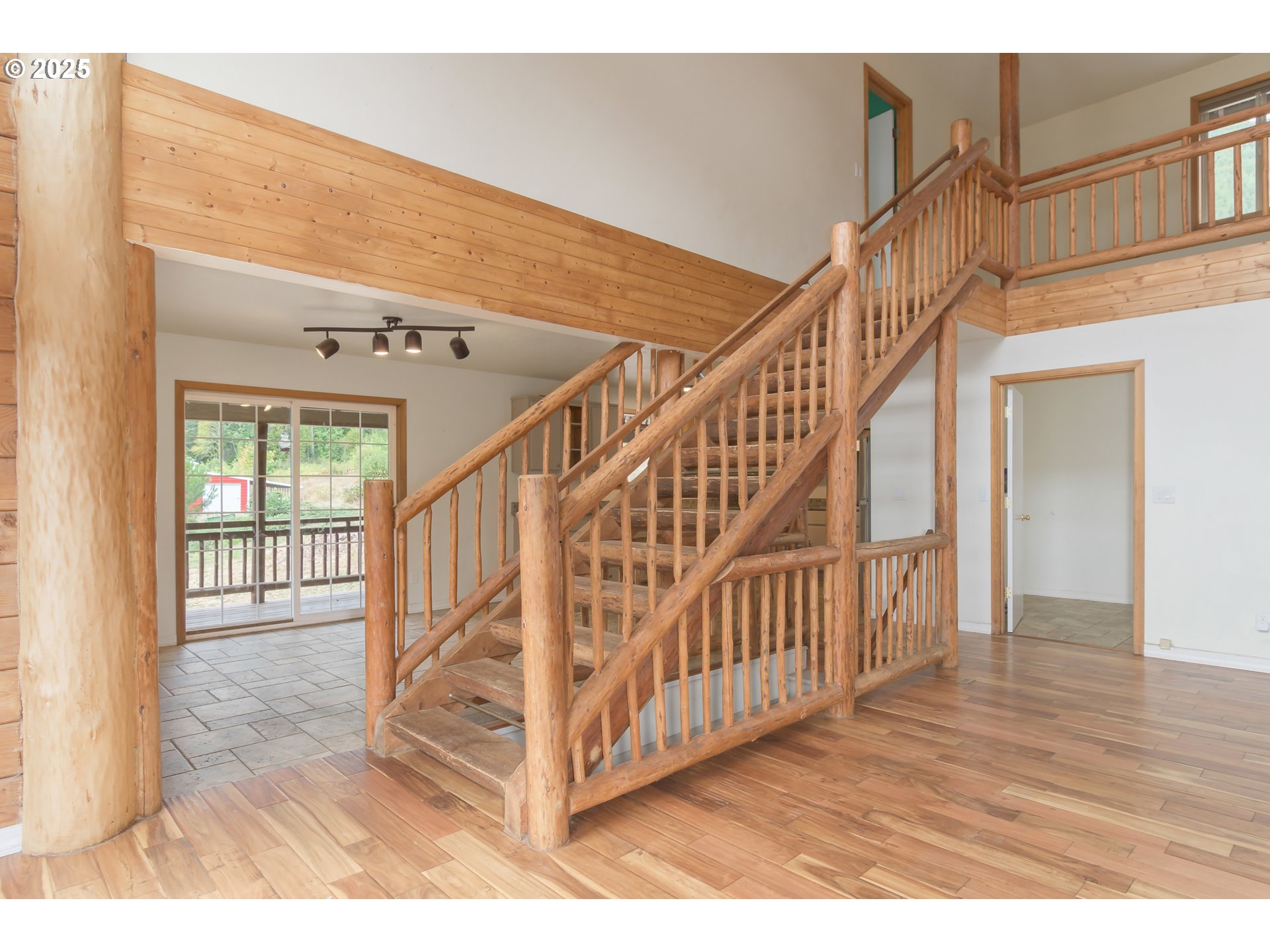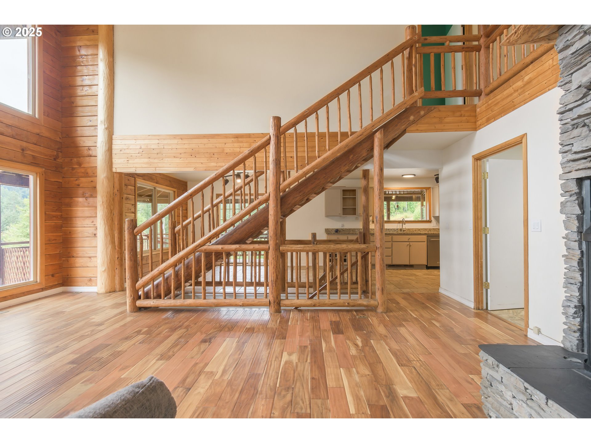 Secluded on nearly 15 acres, this 3,736 sqft lodge-style home blends rustic charm with modern convenience. The open great room features soaring ceilings, an exposed banister, and expansive windows that bring the outdoors in. A wood-burning fireplace and engineered hardwood and tile floors add warmth throughout.A highlight is the home automation system, giving you control of every light and offering three zones of high-resolution audio—a rare luxury in rural properties. Designed for multi-generational living, three of the four bedrooms include a private en-suite. The primary suite, accessed through French doors, offers a soaking tub, shower, and dual closets. Outdoor living shines with a large deck overlooking the terrain and a ¾ wraparound porch. The chef’s kitchen features stainless steel appliances, propane gas cooktop, and double ovens. The basement provides flexible space with a full bath and walkout access, while the oversized garage includes 896 sqft of additional living area, ideal for bedrooms or offices. Outside, the 42’ x 45’ barn offers concrete floors, dual roll-up doors, and two large stalls (expandable to four) with pasture access. A 12’ x 45’ lean-to adds storage, while a fenced fruit orchard and seasonal water feature enhance the property’s charm. Located just 15 minutes from Triangle Lake and 40 minutes from the ocean, this property delivers rural tranquility with modern sophistication.
