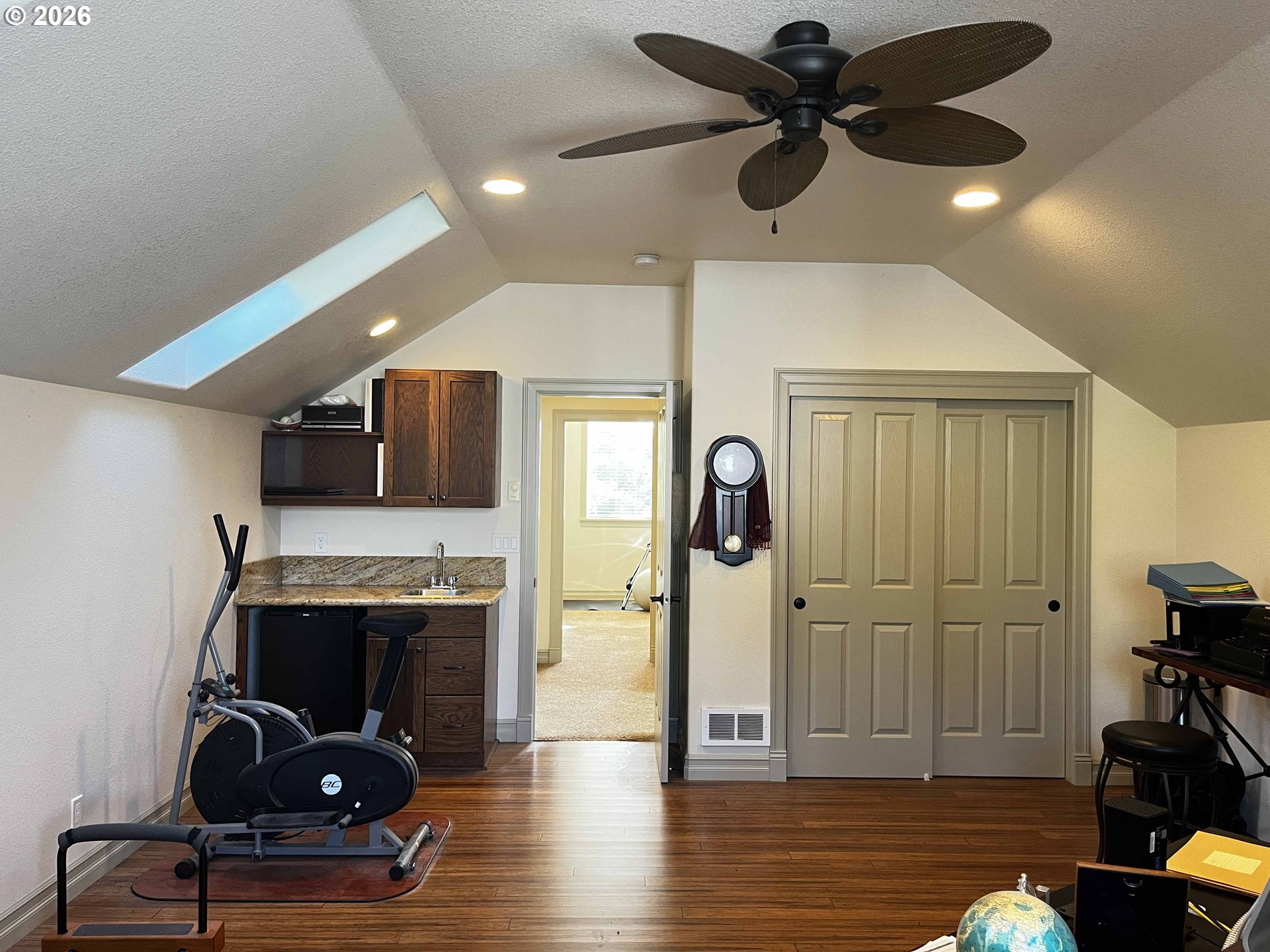 CeilingFan, Skylight, WalltoWallCarpet, WoodFloors
