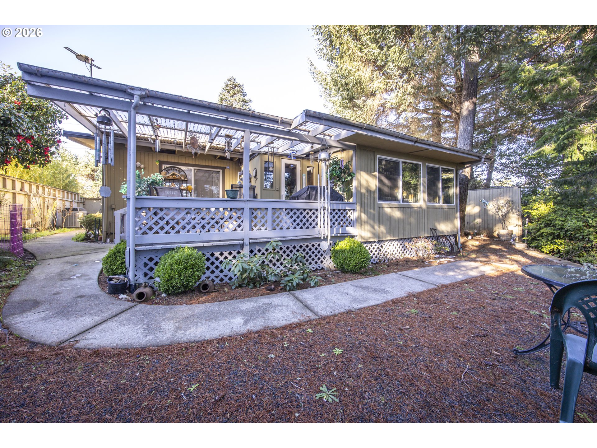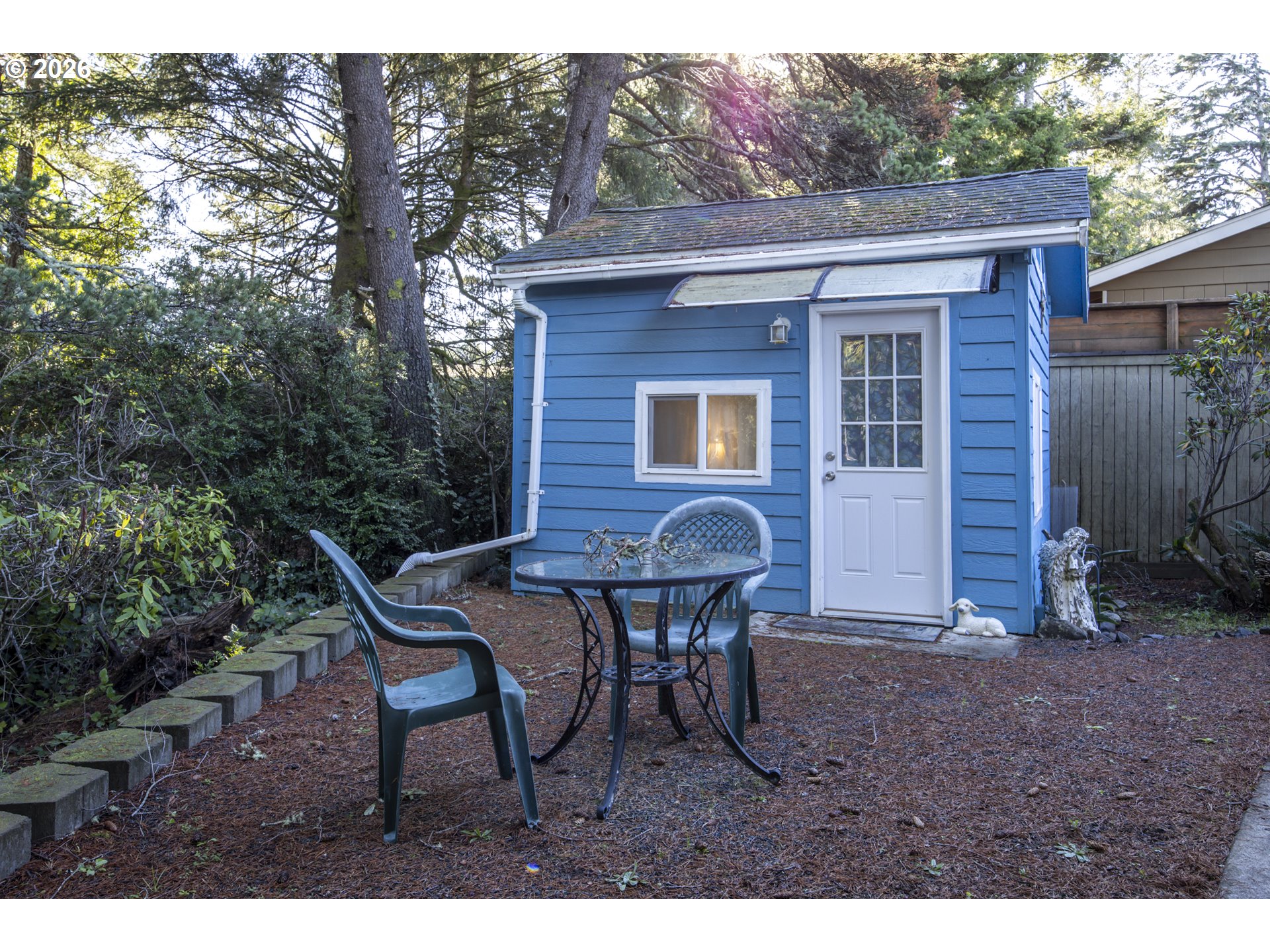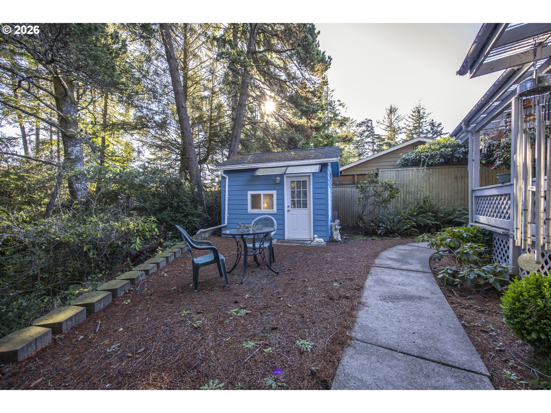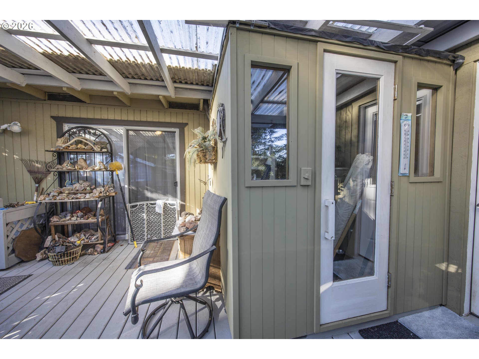 This home offers a large, enclosed private front patio just off the entry. The kitchen is appointed with wood cabinetry, granite countertops, a gas range, and a double dishwasher. Cork flooring runs throughout most of the home. The primary bedroom includes a walk-in closet, and the updated bathroom features a tiled shower. The living room is warmed by a pellet stove insert and accented with wood beam ceilings. Behind the front fenced gate, there is RV parking leading to a storage shed. The backyard is a nature lover’s retreat, overlooking Munsel Creek and featuring a charming finished studio shed with power. A bonus sunroom adds additional living space. Newer washer and dryer and all kitchen appliances are included. The covered back deck includes a steam sauna, creating a peaceful and relaxing outdoor setting.