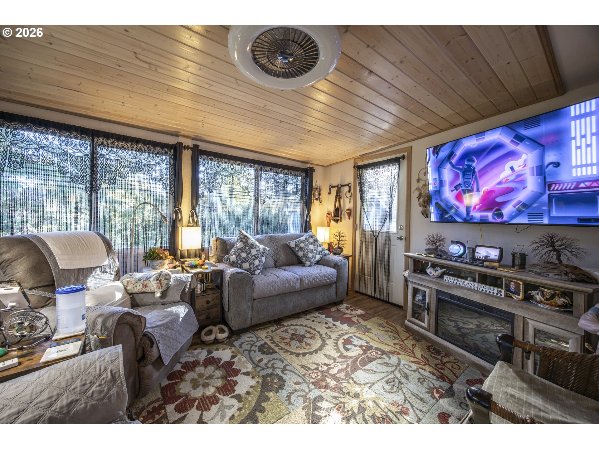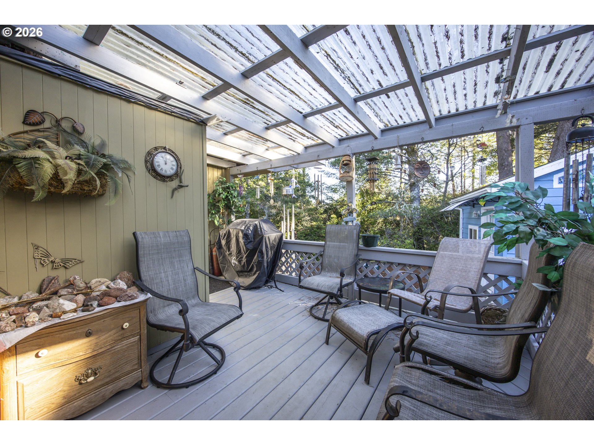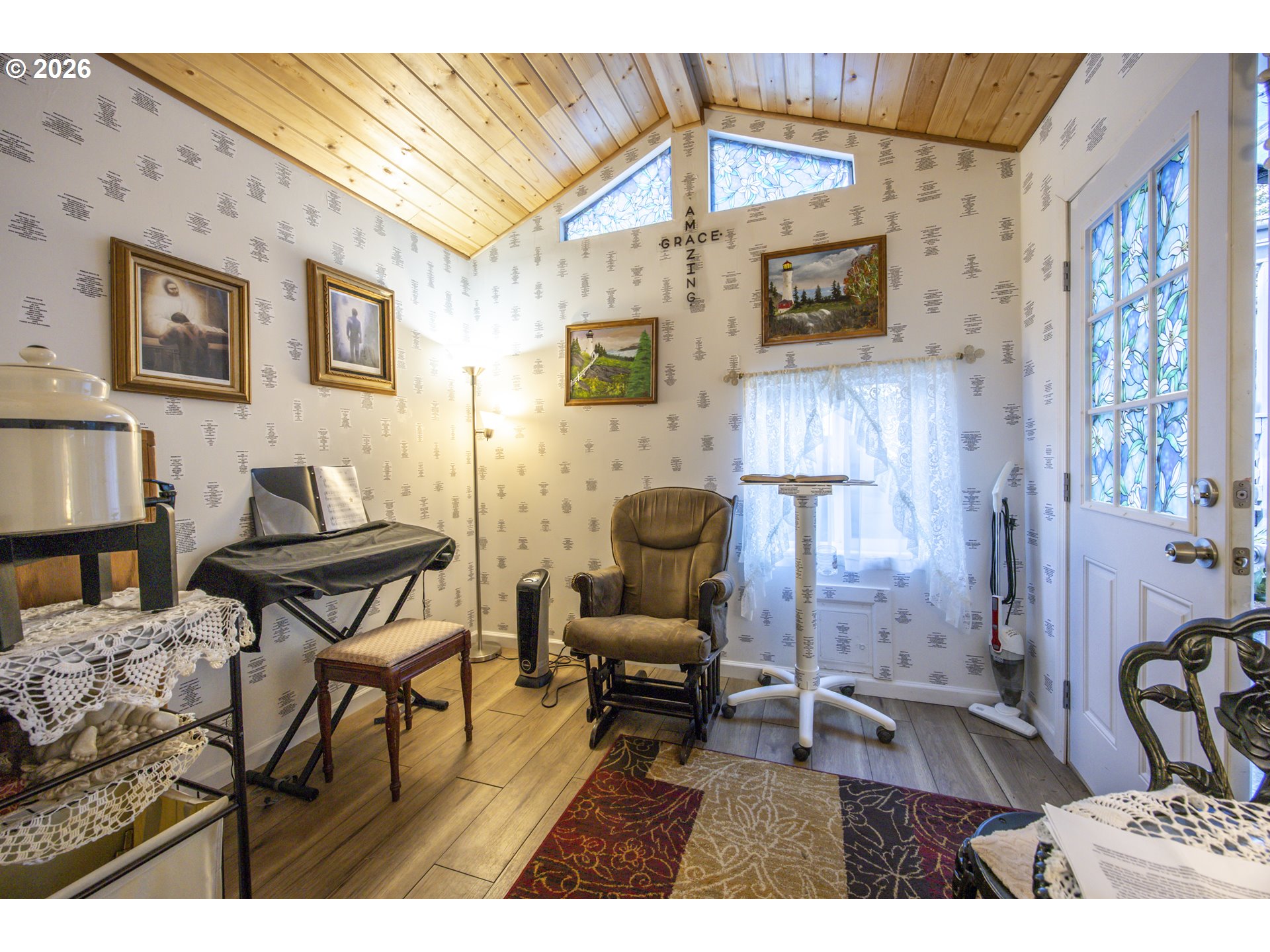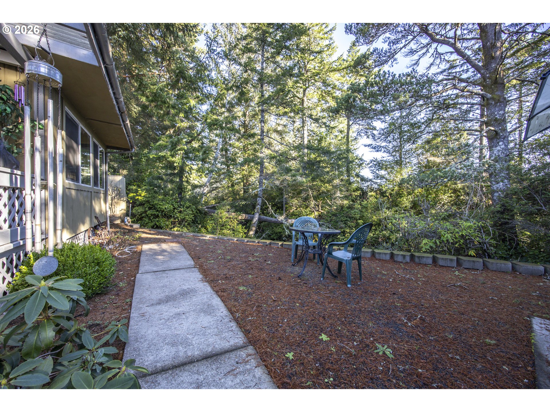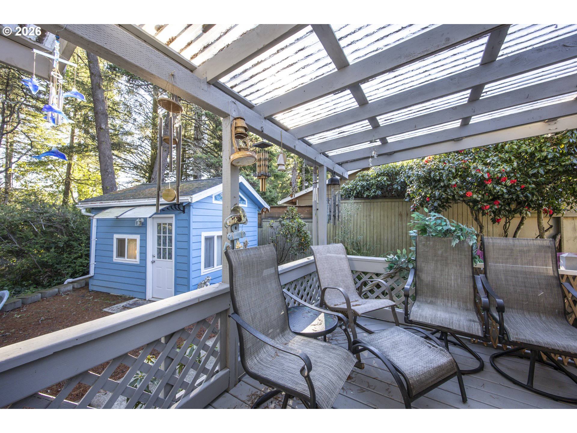 This home offers a large, enclosed private front patio just off the entry. The kitchen is appointed with wood cabinetry, granite countertops, a gas range, and a double dishwasher. Cork flooring runs throughout most of the home. The primary bedroom includes a walk-in closet, and the updated bathroom features a tiled shower. The living room is warmed by a pellet stove insert and accented with wood beam ceilings. Behind the front fenced gate, there is RV parking leading to a storage shed. The backyard is a nature lover’s retreat, overlooking Munsel Creek and featuring a charming finished studio shed with power. A bonus sunroom adds additional living space. Newer washer and dryer and all kitchen appliances are included. The covered back deck includes a steam sauna, creating a peaceful and relaxing outdoor setting.