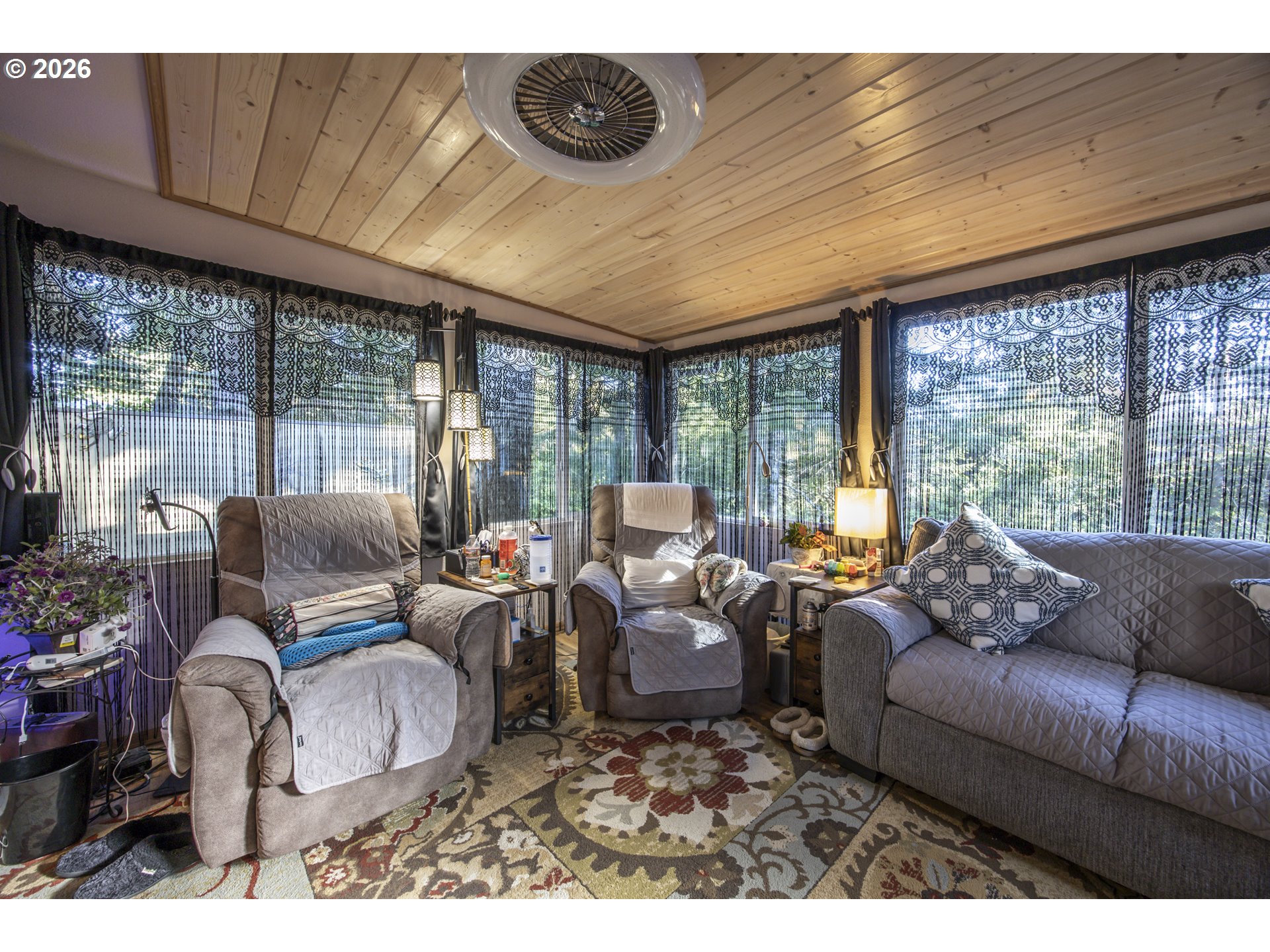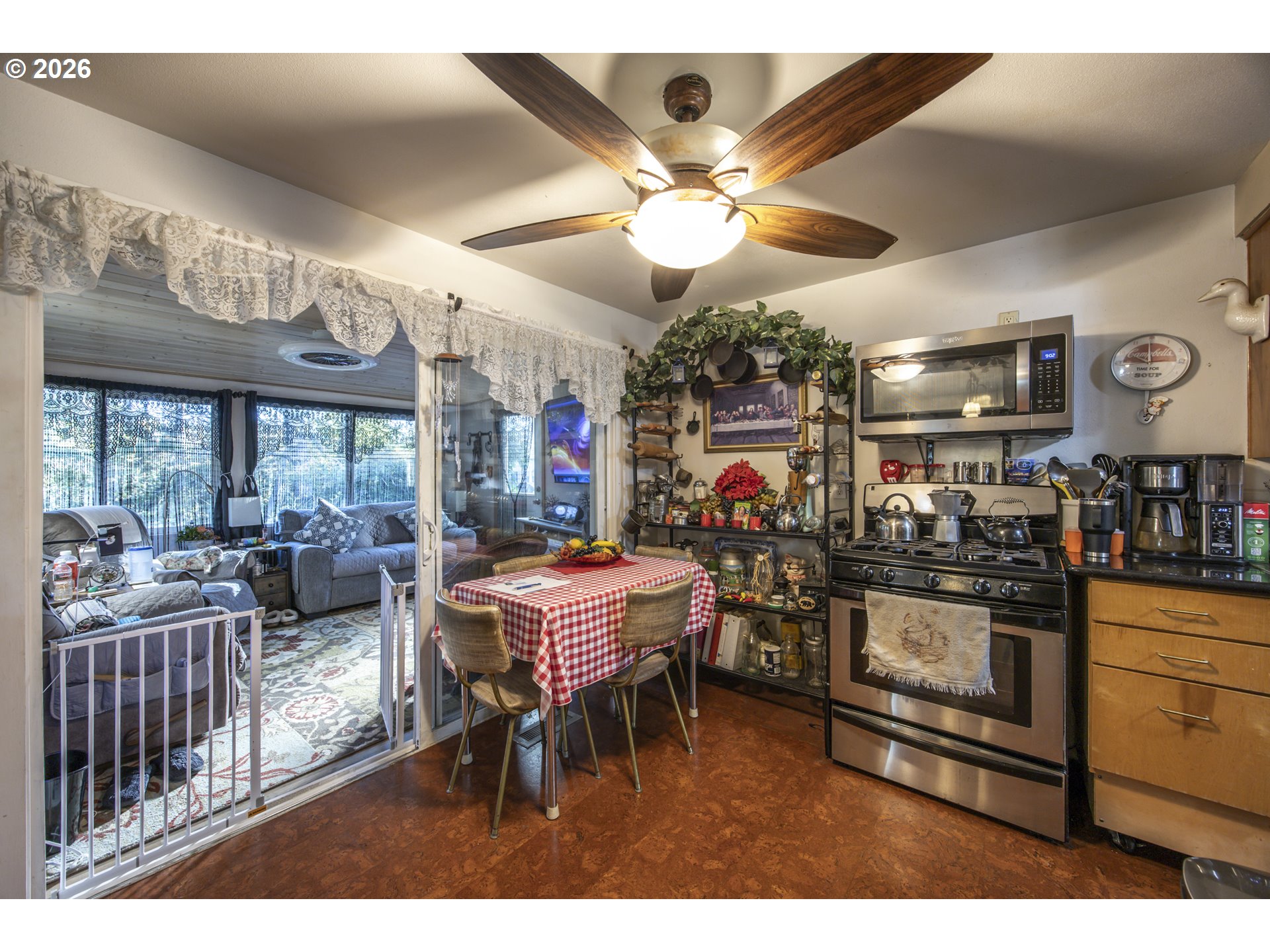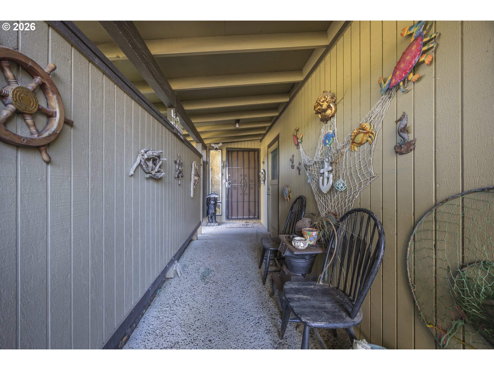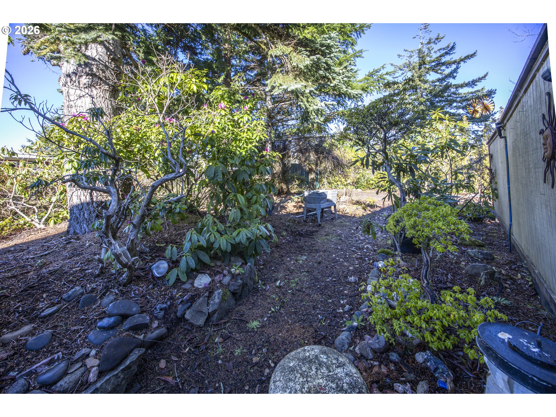 This home offers a large, enclosed private front patio just off the entry. The kitchen is appointed with wood cabinetry, granite countertops, a gas range, and a double dishwasher. Cork flooring runs throughout most of the home. The primary bedroom includes a walk-in closet, and the updated bathroom features a tiled shower. The living room is warmed by a pellet stove insert and accented with wood beam ceilings. Behind the front fenced gate, there is RV parking leading to a storage shed. The backyard is a nature lover’s retreat, overlooking Munsel Creek and featuring a charming finished studio shed with power. A bonus sunroom adds additional living space. Newer washer and dryer and all kitchen appliances are included. The covered back deck includes a steam sauna, creating a peaceful and relaxing outdoor setting.