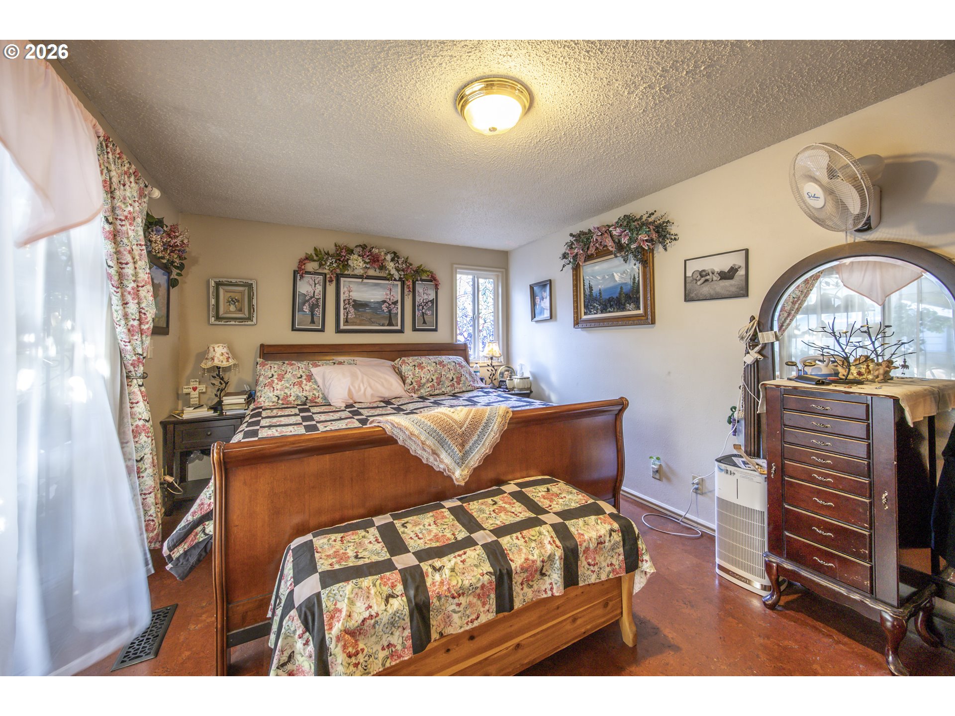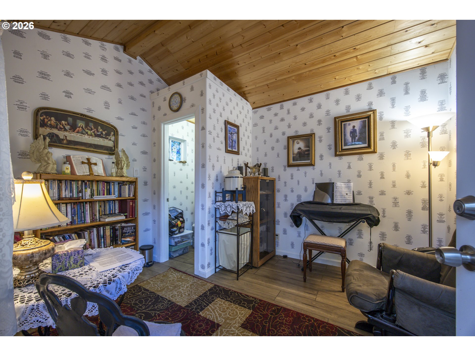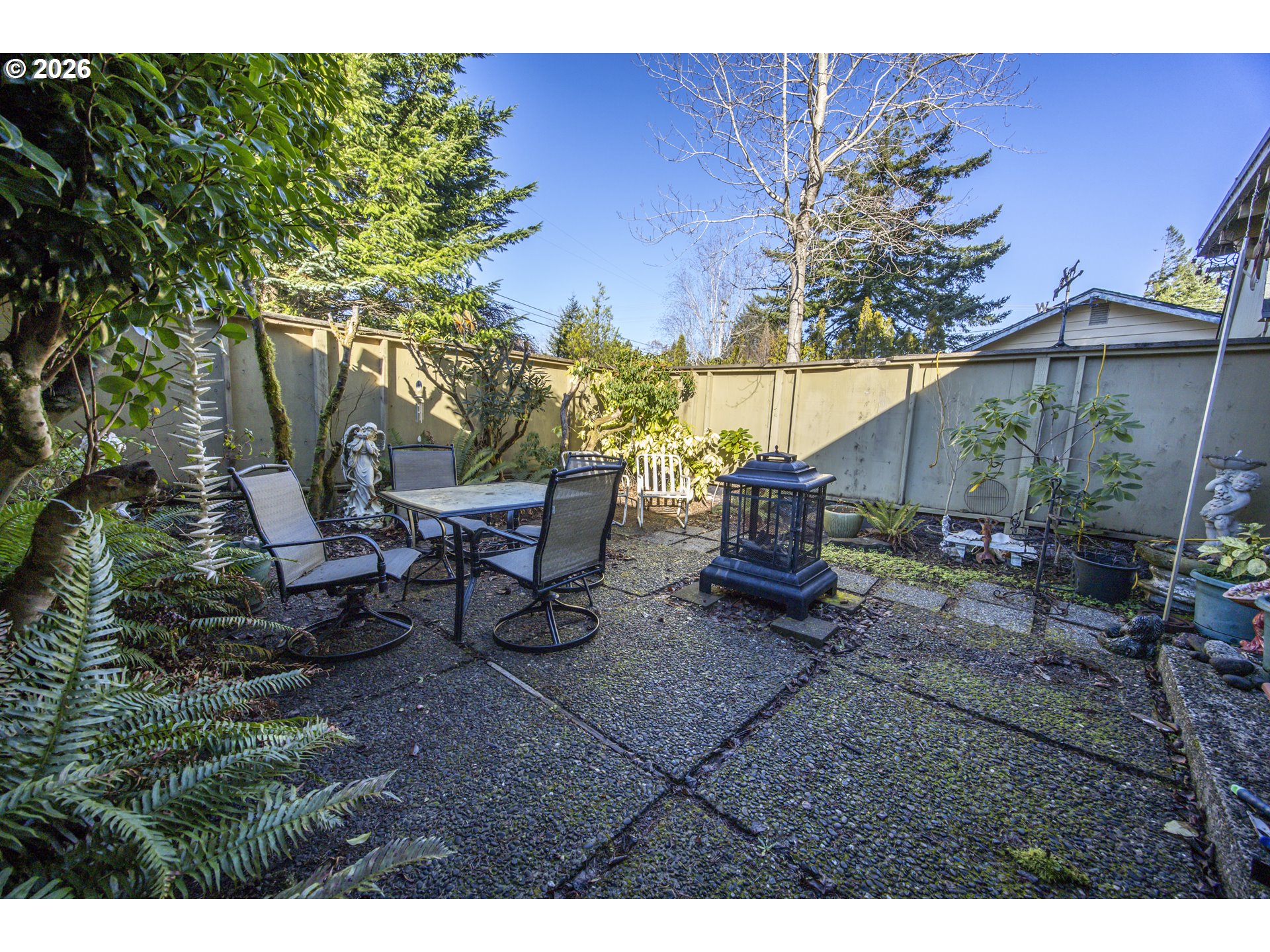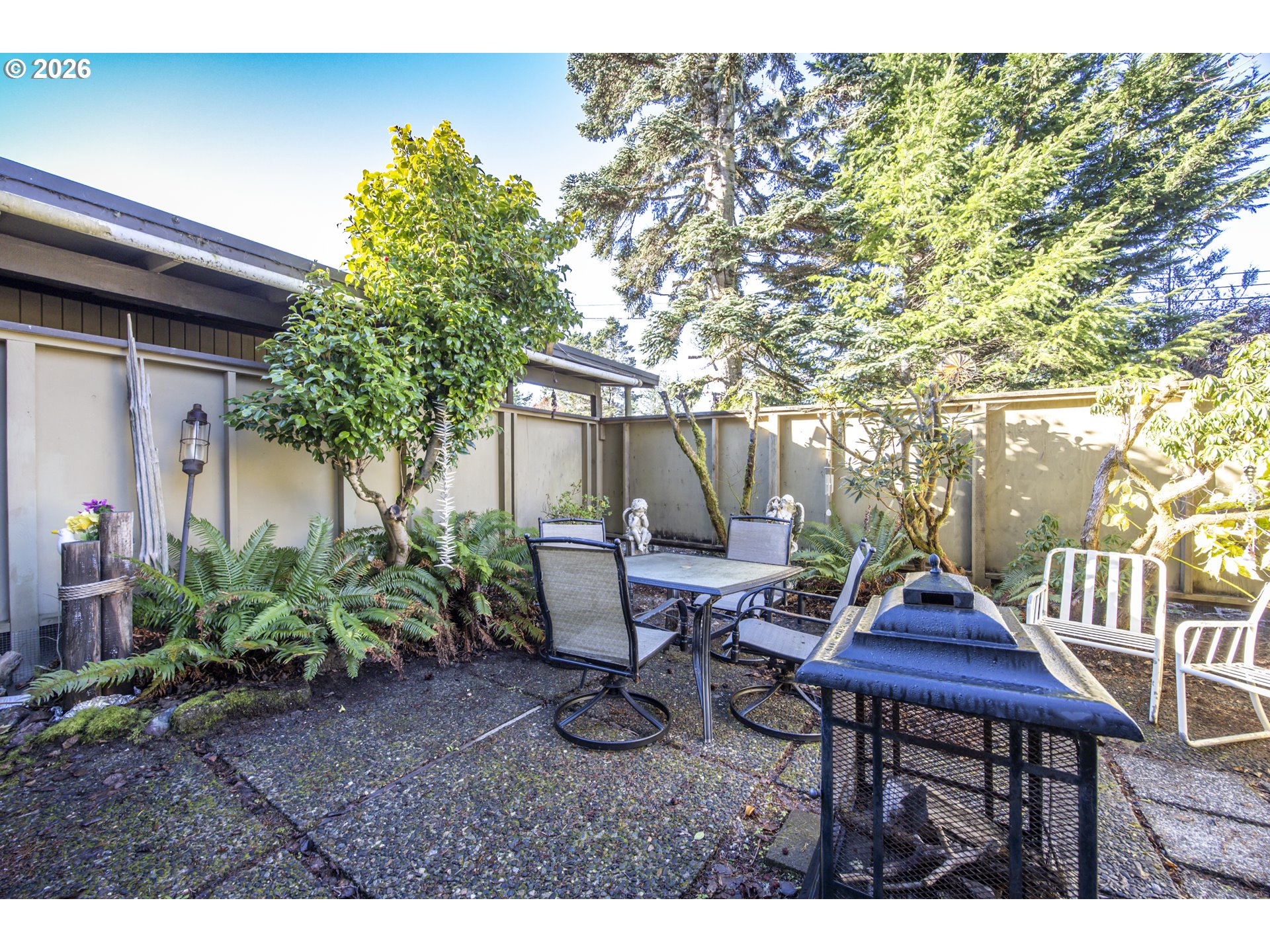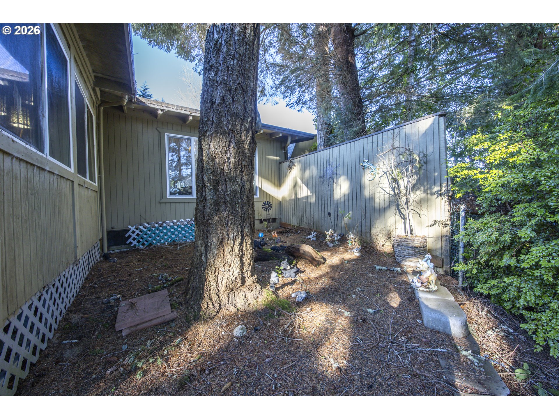 This home offers a large, enclosed private front patio just off the entry. The kitchen is appointed with wood cabinetry, granite countertops, a gas range, and a double dishwasher. Cork flooring runs throughout most of the home. The primary bedroom includes a walk-in closet, and the updated bathroom features a tiled shower. The living room is warmed by a pellet stove insert and accented with wood beam ceilings. Behind the front fenced gate, there is RV parking leading to a storage shed. The backyard is a nature lover’s retreat, overlooking Munsel Creek and featuring a charming finished studio shed with power. A bonus sunroom adds additional living space. Newer washer and dryer and all kitchen appliances are included. The covered back deck includes a steam sauna, creating a peaceful and relaxing outdoor setting.