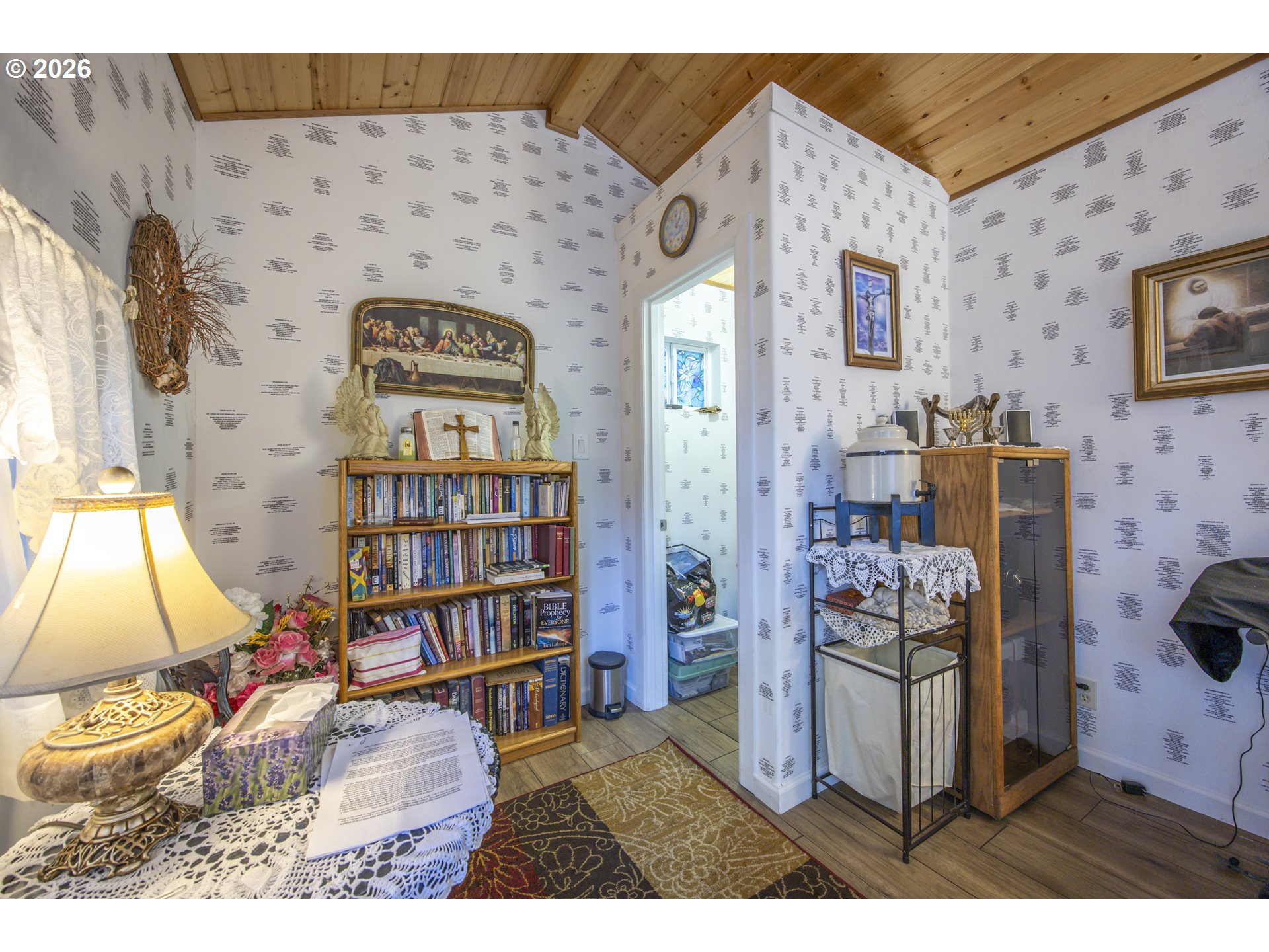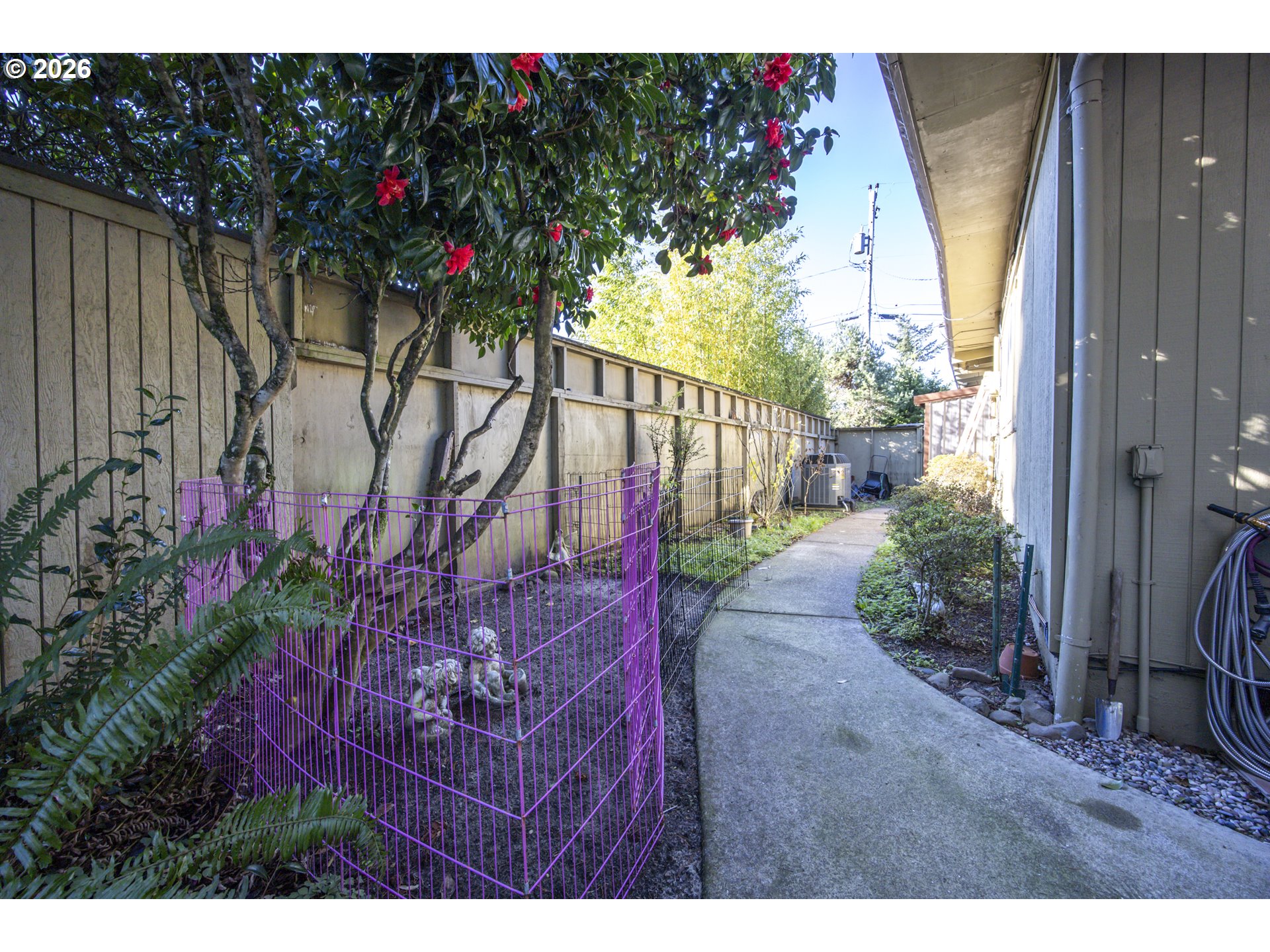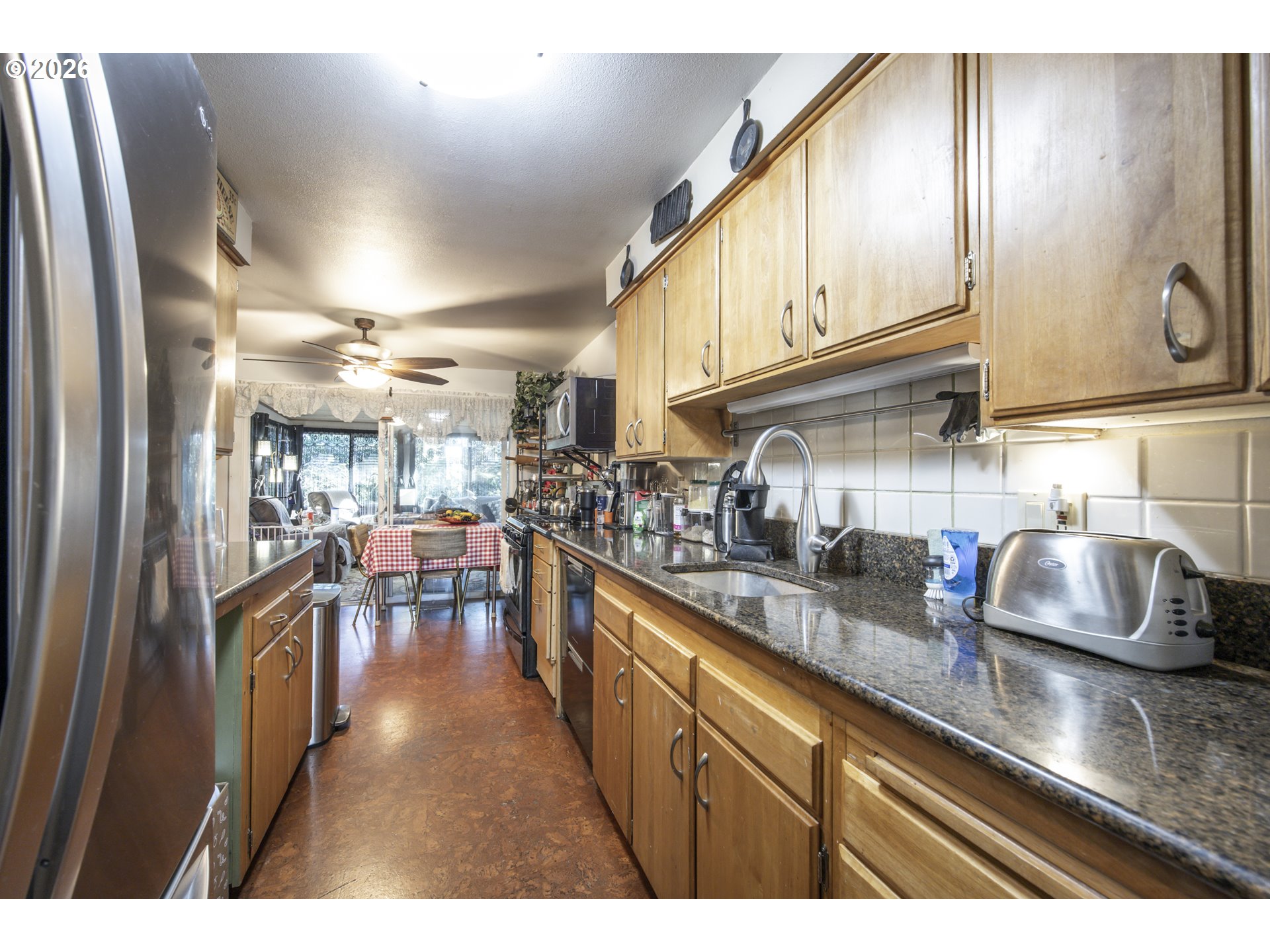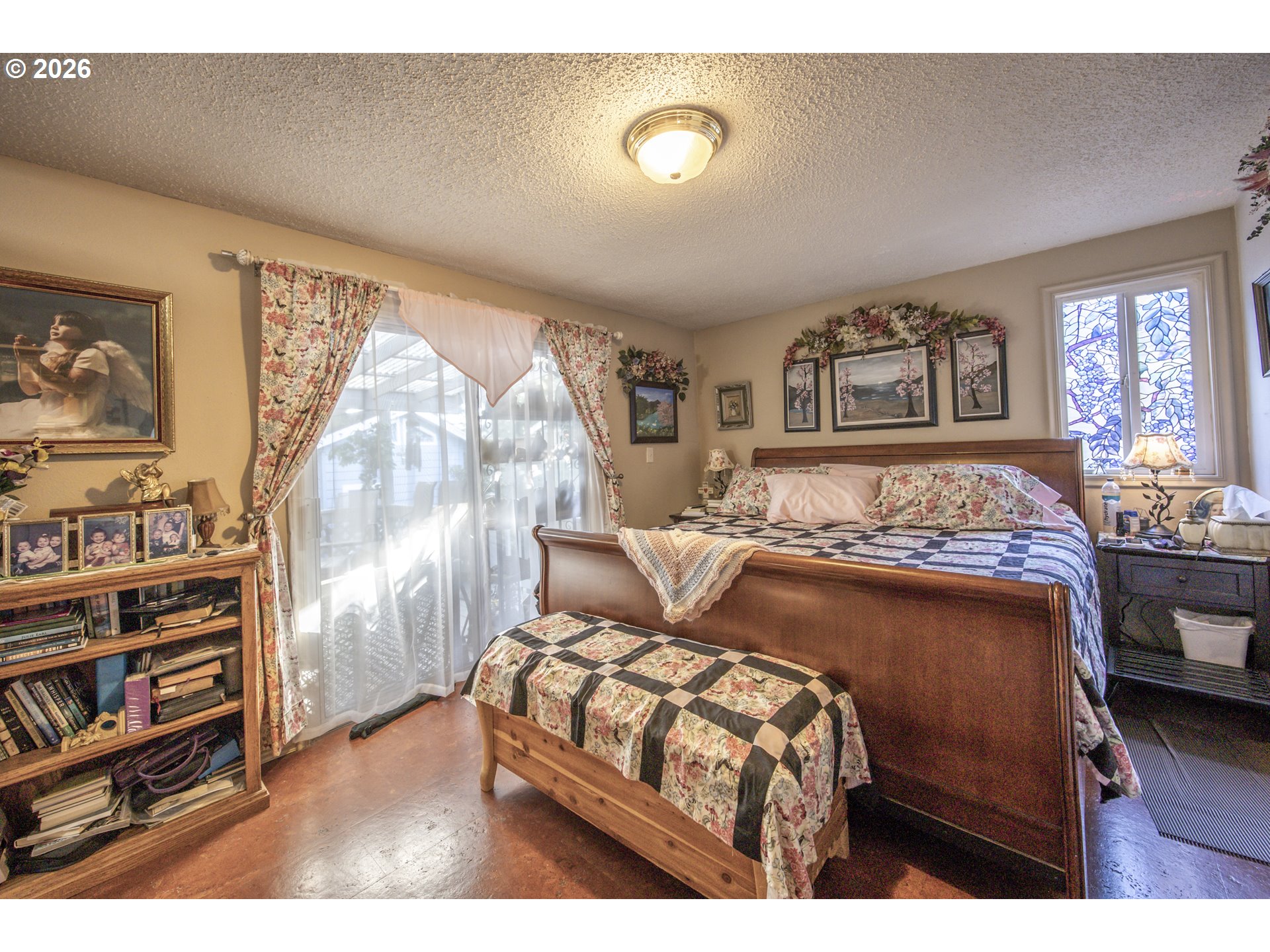 This home offers a large, enclosed private front patio just off the entry. The kitchen is appointed with wood cabinetry, granite countertops, a gas range, and a double dishwasher. Cork flooring runs throughout most of the home. The primary bedroom includes a walk-in closet, and the updated bathroom features a tiled shower. The living room is warmed by a pellet stove insert and accented with wood beam ceilings. Behind the front fenced gate, there is RV parking leading to a storage shed. The backyard is a nature lover’s retreat, overlooking Munsel Creek and featuring a charming finished studio shed with power. A bonus sunroom adds additional living space. Newer washer and dryer and all kitchen appliances are included. The covered back deck includes a steam sauna, creating a peaceful and relaxing outdoor setting.