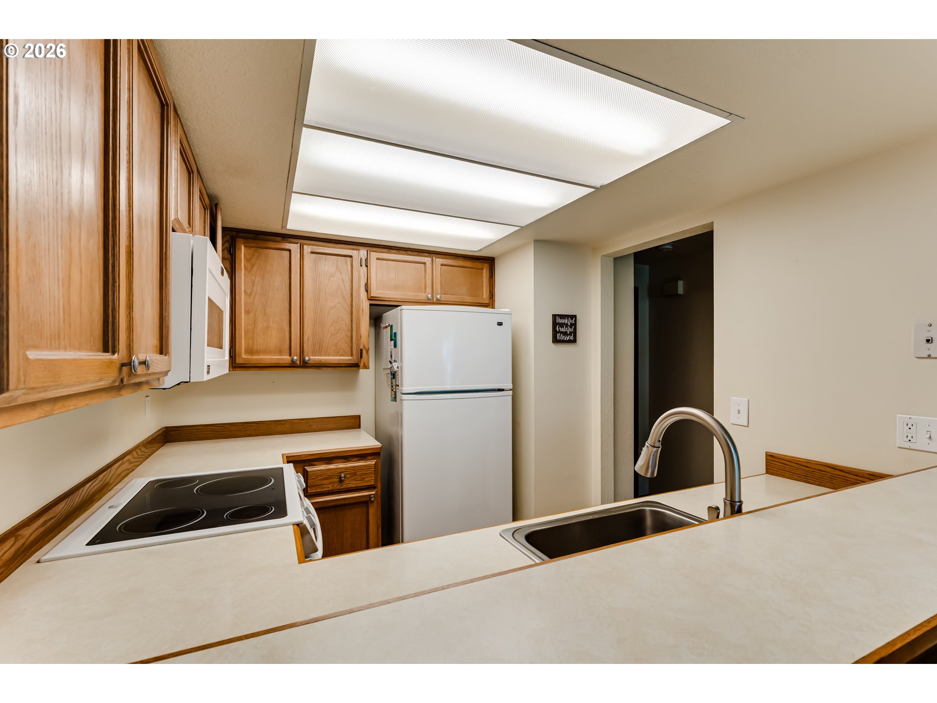 This beautifully maintained main level condo at Lake Isle Terrace combines modern updates with a highly convenient location. Just steps from the bus line and around the corner from mall, the home offers easy access to shopping, dining, and city amenities. Inside, you’ll find a spacious living room, dining area, and kitchen, along with one bedroom and one bathroom. Recent upgrades include an Anderson storm door, sealed Sponge windows designed to reduce outside noise, and a ductless heating and cooling system for year-round comfort. The kitchen features freshly stained cabinets paired with matching white Maytag appliances, while the dining area is highlighted by three-way lighting. Custom Hunter Douglas blinds, blackout drapes in the bedroom, and clean carpets that look new, giving the space a polished feel. A new water heater was installed in 2024, the bathroom has updated faucets and a showerhead, and the roof was replaced in 2023. Washer and dryer included. The covered patio provides additional storage and overlooks a seasonal, peaceful water feature. With thoughtful updates and low maintenance living, this condo offers both comfort and convenience in a sought-after Eugene location.