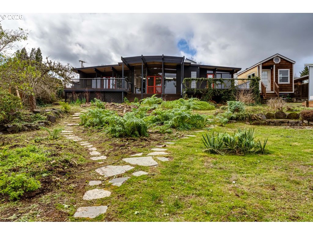 Tucked on one of the most desirable streets in Southwest Eugene and a neighborhood you will love coming home to, this light filled mid-century modern home blends character, comfort, and thoughtful organization throughout. Pull under the porte-cochere and enter through a covered atrium with tall double doors. Inside, a wall of windows spans the entire back of the home, framing sweeping valley views and filling the main living areas with natural light. The expansive covered deck extends your living space outdoors, offering a perfect place to relax or entertain while staying protected year-round. The interior features hardwood floors, warm cedar walls, open beamed ceilings, skylights, and two fireplaces — details that add both charm and functionality. The spacious living room and separate family room provide flexible options for gathering, working from home, hobbies, or quiet retreat. The primary suite has a large 7x9 closet and beautiful bathroom with one of a kind features. Outside, the fully fenced and private 1/3-acre yard is ready for gardeners and hobbyists alike, with fruit trees, generous planting space, and plenty of room to personalize. Pocket doors and smart layout choices throughout the home make everyday living easy and efficient. Two sheds and the carport provide plenty of storage. Washer and dryer are included for added convenience. Be sure to tour this desirable and distinctive home while it's available!