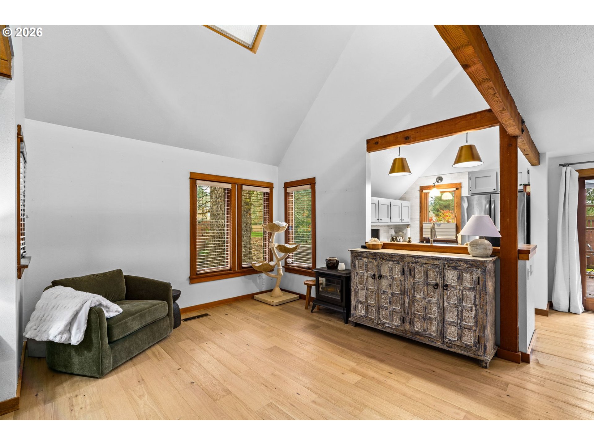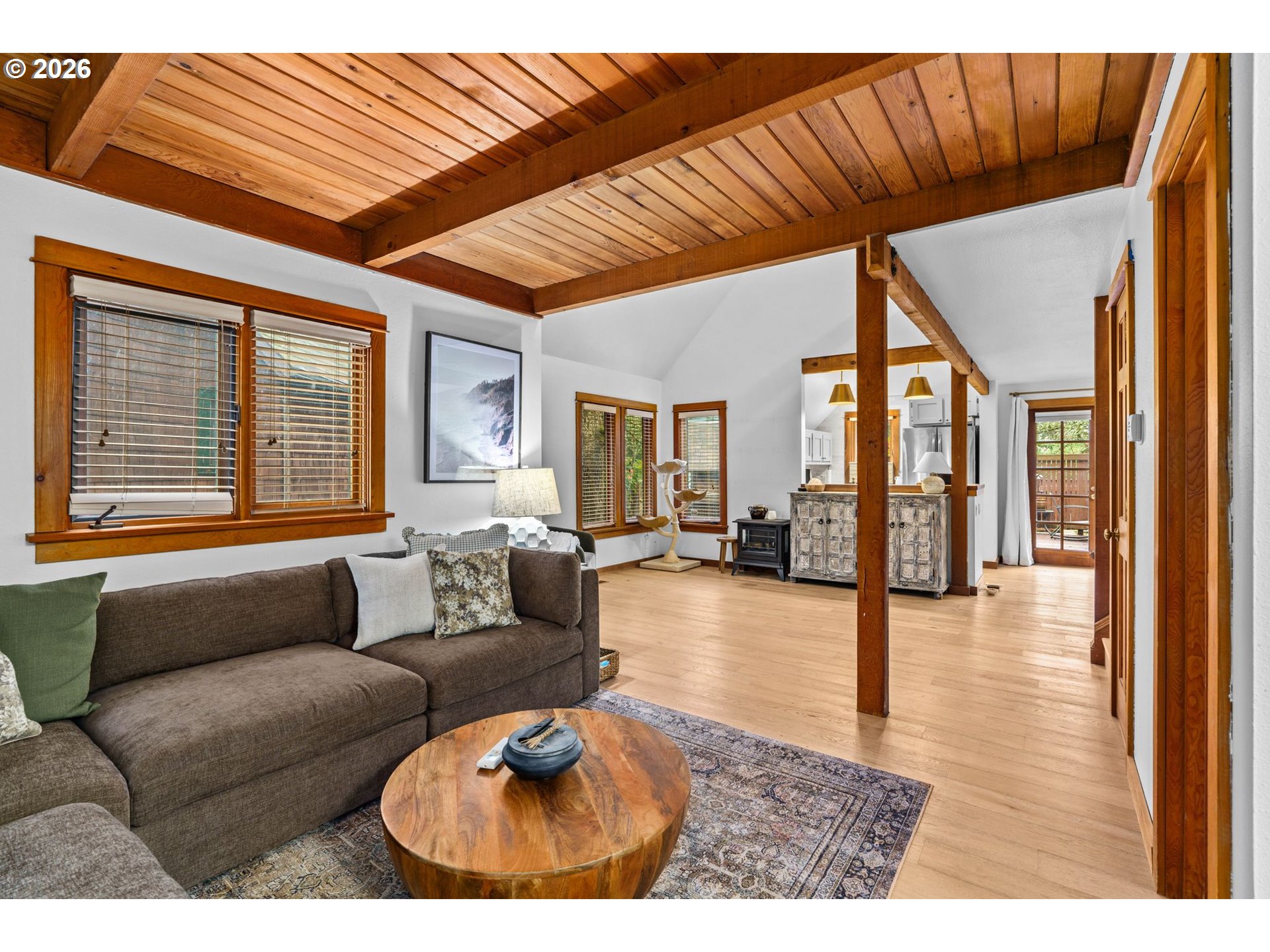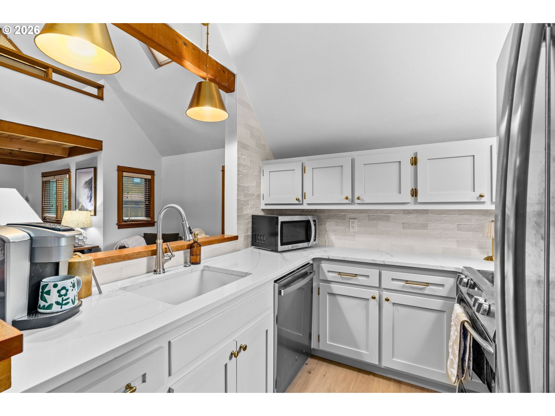 Welcome to your serene retreat! This thoughtfully updated home offers the perfect blend of modern comfort and natural beauty. The open-concept layout creates an inviting flow throughout, while the master bedroom loft provides a private sanctuary above.The kitchen shines with quartz countertops and stainless steel appliances, ready for both everyday living and entertaining. Recent updates include new flooring and newly replaced roof and skylights that bathe the interior in natural light. Step through the French doors onto the back deck and discover your peaceful outdoor oasis, surrounded by beautiful trees that provide both privacy and tranquility. Additional conveniences include in-house laundry and AC for year-round comfort. This quiet, tree-lined setting offers a rare escape from the everyday while keeping you perfectly positioned—just a short drive to the golf course and all essential amenities. Don't miss this move-in ready gem!