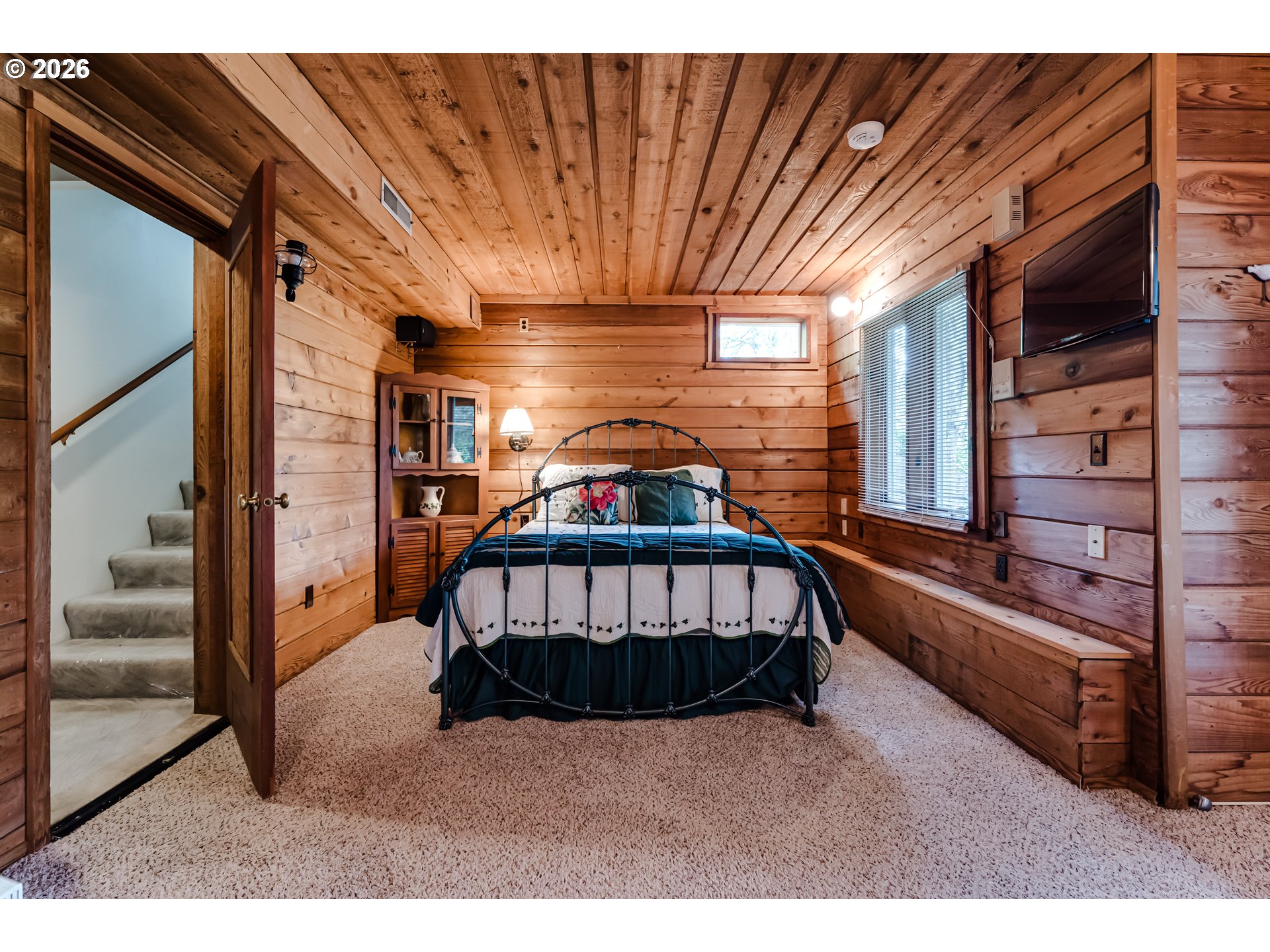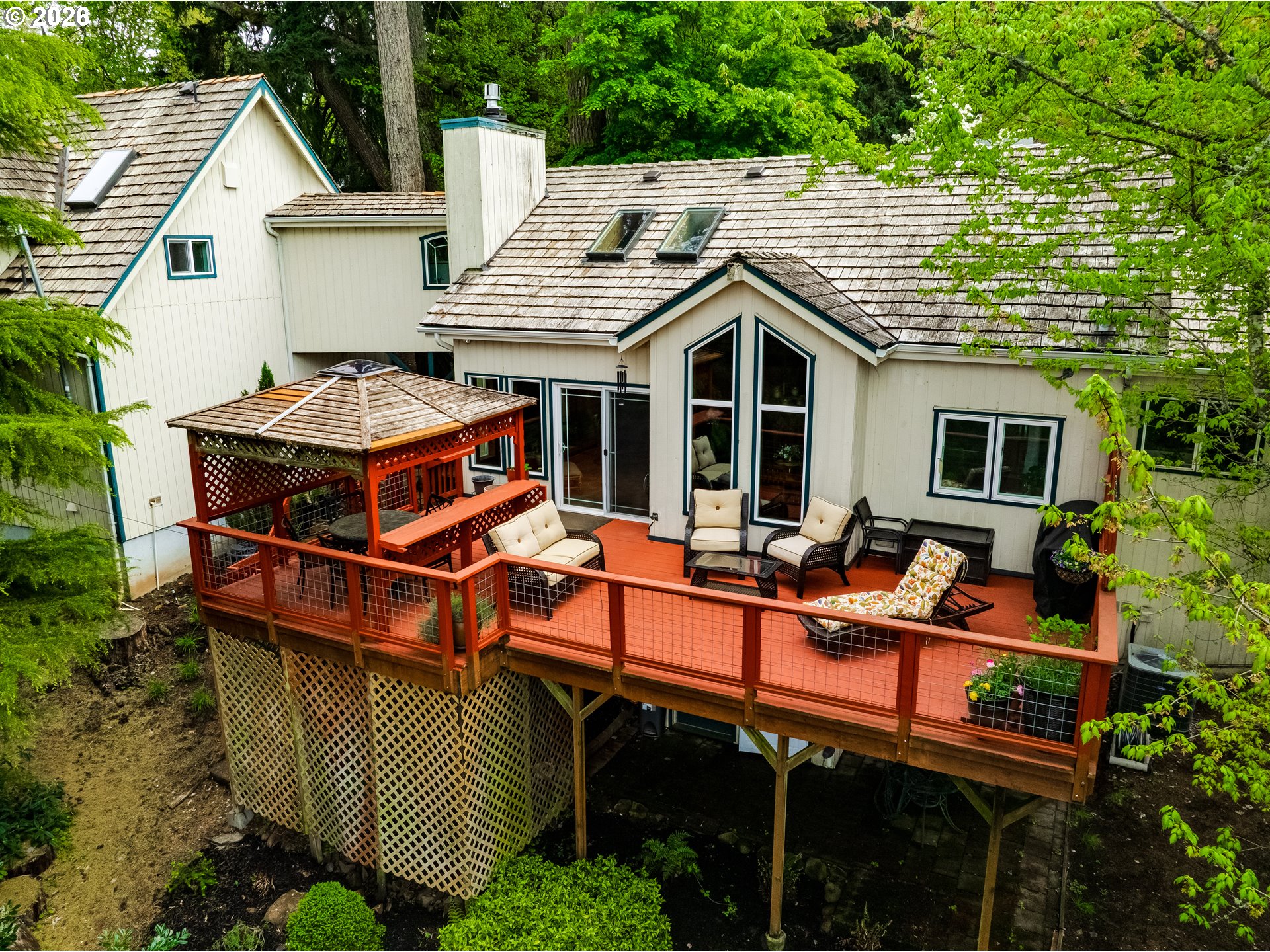 Nestled into the sought-after Upper City View neighborhood of Southwest Eugene, this architecturally distinctive 3-bedroom, 3-bath home offers a rare combination of privacy, style, and close-in convenience. With 2,217 square feet on a .31-acre lot, you’ll feel worlds away—yet just minutes from shopping, parks, and schools. The standout feature is the luxurious primary suite and jacuzzi tub, privately set apart from the main home and accessed via an elevated walkway and its own deck—creating a true retreat in the trees. Vaulted ceilings, warm wood finishes, and natural light throughout bring a refined, lodge-inspired feel. Multiple decks—including expansive entertaining spaces and a covered BBQ porch—invite you to relax, host, and take in peaceful treetop and seasonal views from every angle. Indoor-outdoor living shines here, with seamless access from main living areas. The flexible layout offers great separation of space for the bedrooms, an office or flex room, and a shed at the end of the driveway with power for a workshop. Features include Japanese style soaking tub, laundry on the 2nd floor, stained glass, skylights, laminate flooring in tv room, heat pump, and a well-maintained cedar shake roof. Complete with a two-car garage, RV Parking, wood flooring upstairs and a fenced backyard. This one-of-a-kind home delivers character, comfort, and incredible potential in one of Eugene’s most desirable hillside locations.