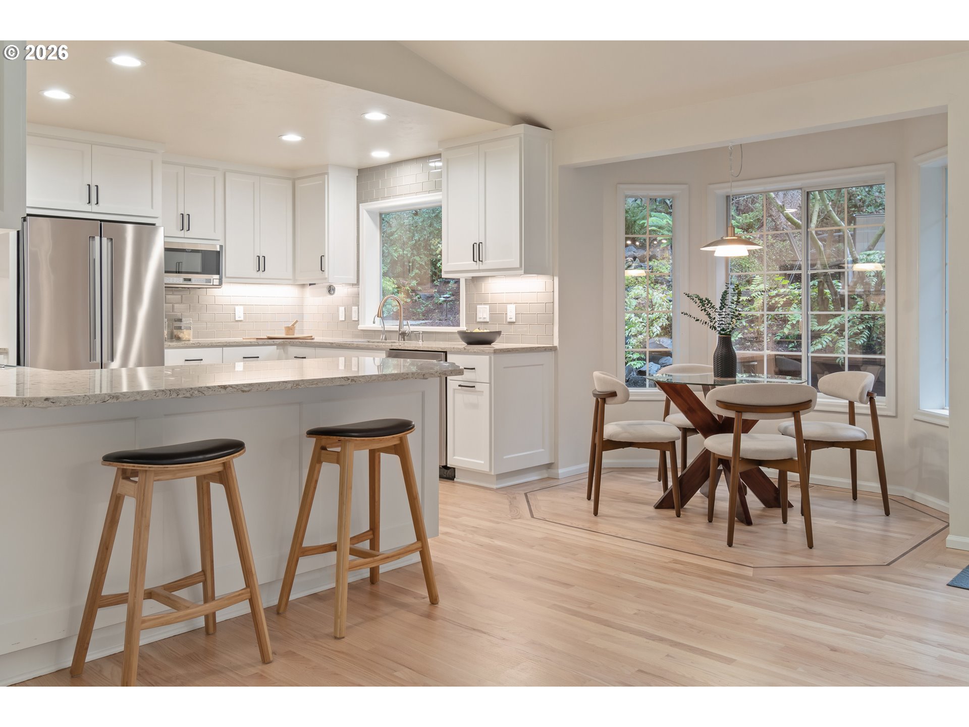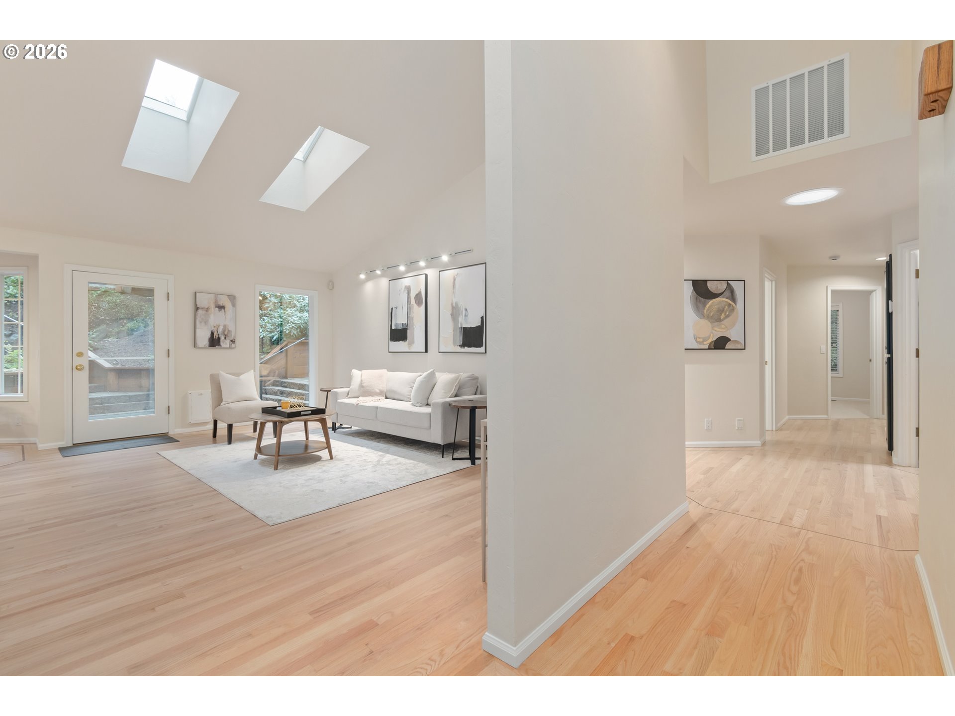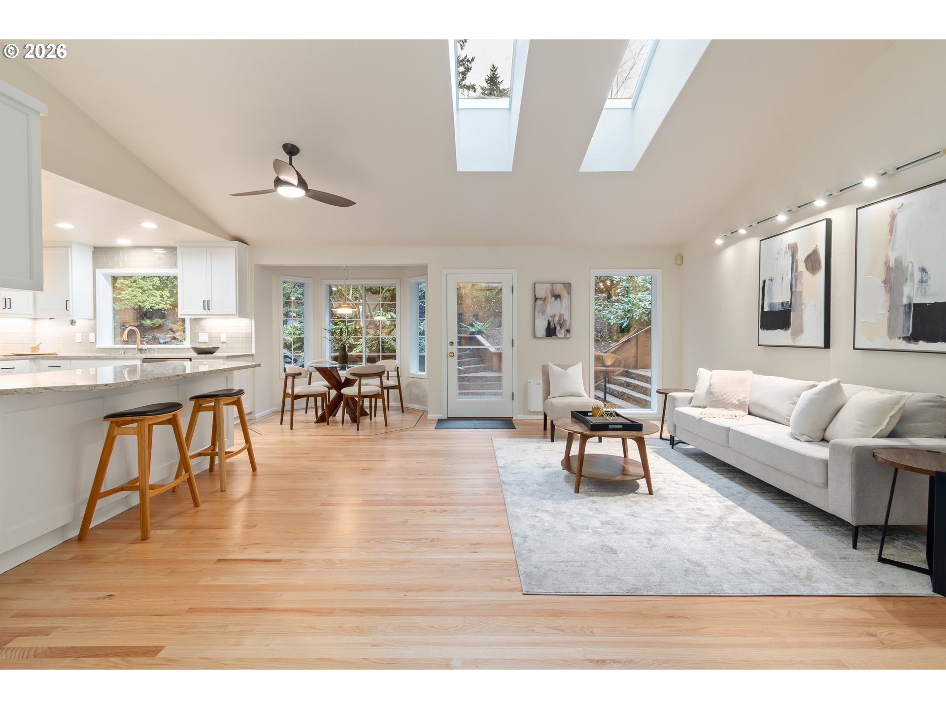 Open houses Sat 1/10 & Sun 1/11 from 1-3pm! Welcome to this stunning, turnkey, single-story home in desirable South Eugene! This thoughtfully updated and meticulously maintained residence spans 2,205 sqft and sits perfectly on a generous .27 acre lot with filtered city views. As you enter, you will be instantly captivated by the cozy formal living room featuring a gas fireplace w/ marble surround leading to the formal dining room w/ built-in hutch. The heart of the home features a completely remodeled kitchen with quartz counters, new cabinets and an induction range that opens to a breakfast nook and light & airy great room w/ vaulted ceilings, skylights and a built-in beverage bar w/ 30-bottle wine rack. The newly refinished hardwood floors that flow throughout the main living areas, including a unique octagonal hallway w/ cherry wood inlay and solar tube, lead to the vaulted primary ensuite featuring a luxurious soaking tub, walk-in shower w/ skylight and walk-in closet. 2 additional bedrooms, hall bathroom, home office w/ French doors and a convenient laundry room w/ ample storage and newer W/D round out the interior. The seriously oversized 3-car garage (784 sqft!) offers incredible storage and 12-foot ceilings. Outside, enjoy the fenced backyard, professionally designed landscaping w/ drip irrigation and sprinklers, private stone patios, serene waterfall feature, low-voltage landscape lighting, walking paths and mature landscaping that highlights the best of the Pacific NW. Brand new roof, fresh interior paint, new solar tubes, newer heat pump, energy-efficient & wifi capable Lennox 95% gas furnace, Rinnai tankless water heater. This is a special home that you do not want to miss!