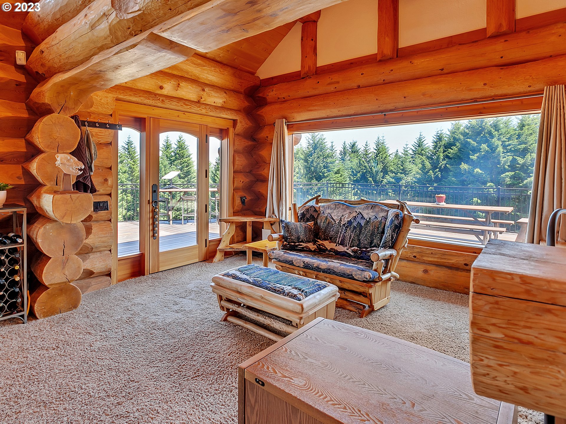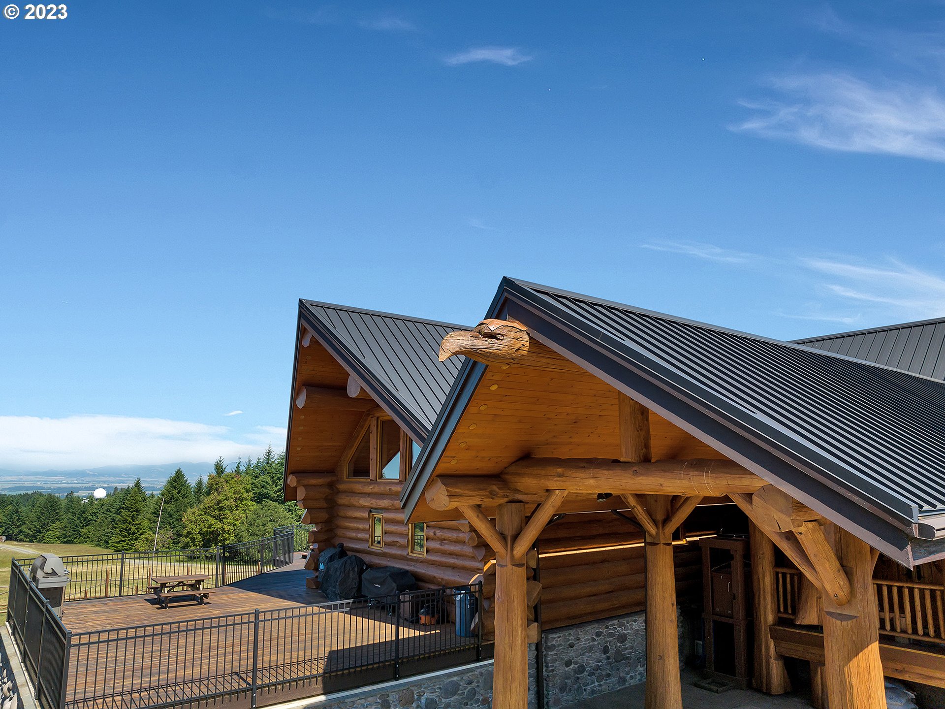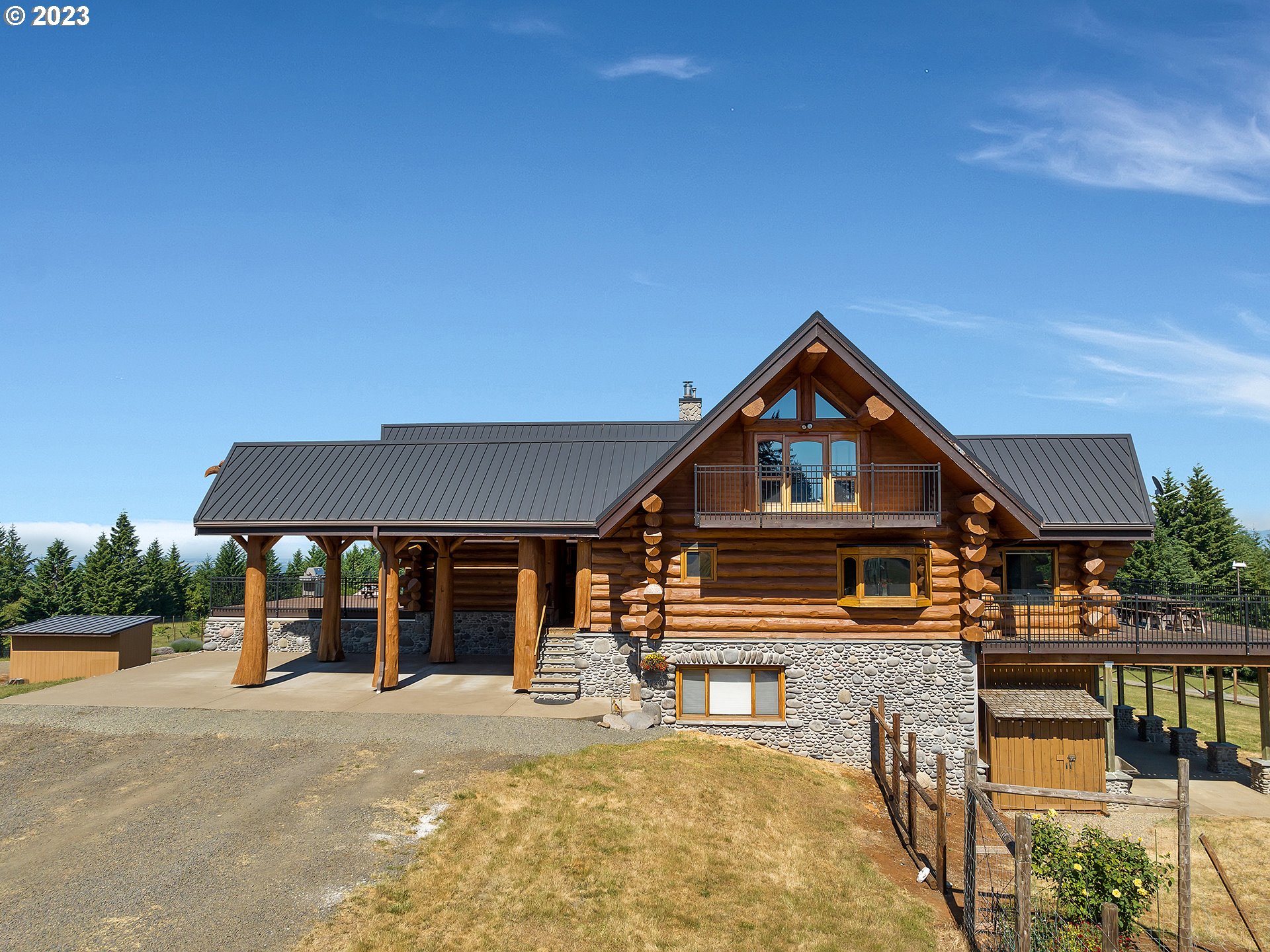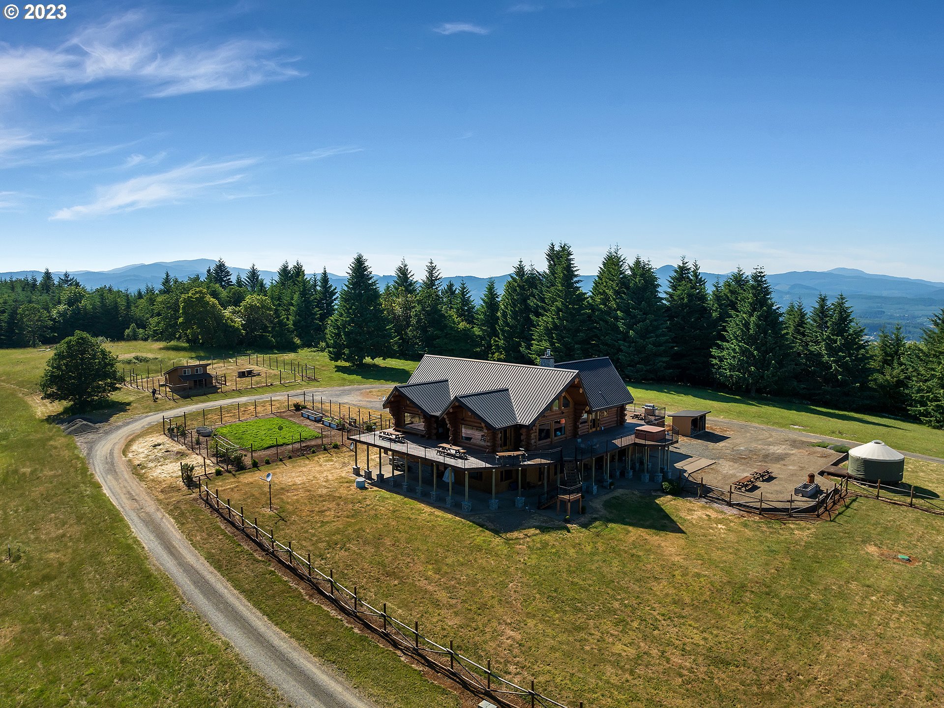 Experience breathtaking, panoramic views from this secluded custom Pioneer Log Home, gracefully perched above the Willamette Valley. Encompassing over 122 acres of rolling pasture and mature forest, this remarkable estate offers a rare blend of privacy, natural beauty, and tranquility—yet remains conveniently located just 21 miles from Eugene Airport and downtown Corvallis. Designed to embrace its stunning surroundings, the home features an expansive 2,400 sq. ft. wraparound deck—perfect for entertaining, relaxing in the hot tub, or simply taking in the sweeping valley vistas and abundant wildlife. Inside, the main level showcases a luxurious primary suite with soaring vaulted ceilings, a spacious walk-in closet, and a spa-inspired ensuite complete with an enclosed steam shower and jacuzzi tub. The thoughtfully designed layout also includes a full guest bathroom, walk-in pantry, dedicated office space, inviting dining area, and a well-appointed kitchen ideal for both everyday living and hosting. The lower level offers two generously sized bedrooms, a full bathroom, a comfortable additional living area, and a second pantry with ample storage. Upstairs, a private bedroom with a half bath provides a versatile retreat—perfect for guests, a home office, or creative studio. The land itself is equally impressive, featuring a charming orchard, yurt garden, and two separate parcels: a 42-acre homesite and an adjacent 80-acre tract. Both parcels offer marketable timber, with the larger tract also home to a pristine artisan spring.This one-of-a-kind estate seamlessly combines exceptional craftsmanship, stunning natural surroundings, and peaceful seclusion—an extraordinary opportunity that must be experienced in person to be fully appreciated.