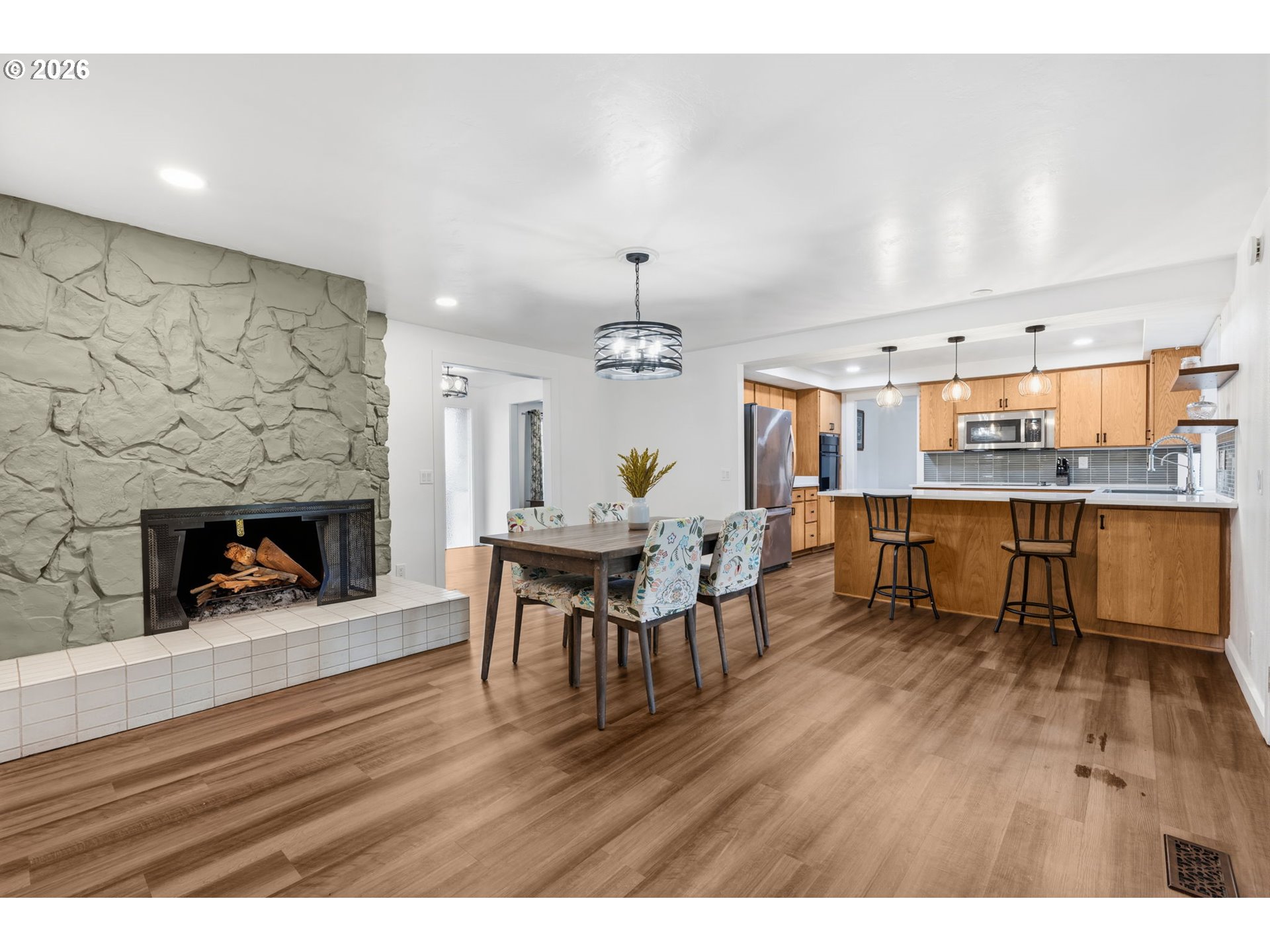 (503) 893-8874Quince features recent updates throughout! Located on a corner lot in an established neighborhood, this well-maintained 4-bedroom, 3-bath home offers comfortable living space and thoughtful updates throughout. The main-level primary suite provides convenience and privacy, while three additional bedrooms upstairs — two with built-ins and desk areas — offer flexibility for a variety of needs. The living room features a fireplace and connects easily to the kitchen and dining area. The kitchen includes quartz countertops, tile backsplash, new fixtures, a breakfast bar, and opens to the dining space with a second fireplace. Recent improvements include a remodeled primary suite with walk-in shower, utility room, new doors and trim, textured ceilings, updated lighting and fixtures, and luxury vinyl plank flooring throughout. A separate family room with extensive built-ins provides additional space for everyday living. The backyard offers a covered deck with outdoor fans, fruit trees, a garden shed, new back fencing, and manageable landscaping. Heat pump, RV parking, deep driveway, garage storage and additional off-street parking. Recent inspection on file with minor repairs completed. Contact your agent to schedule a showing today!