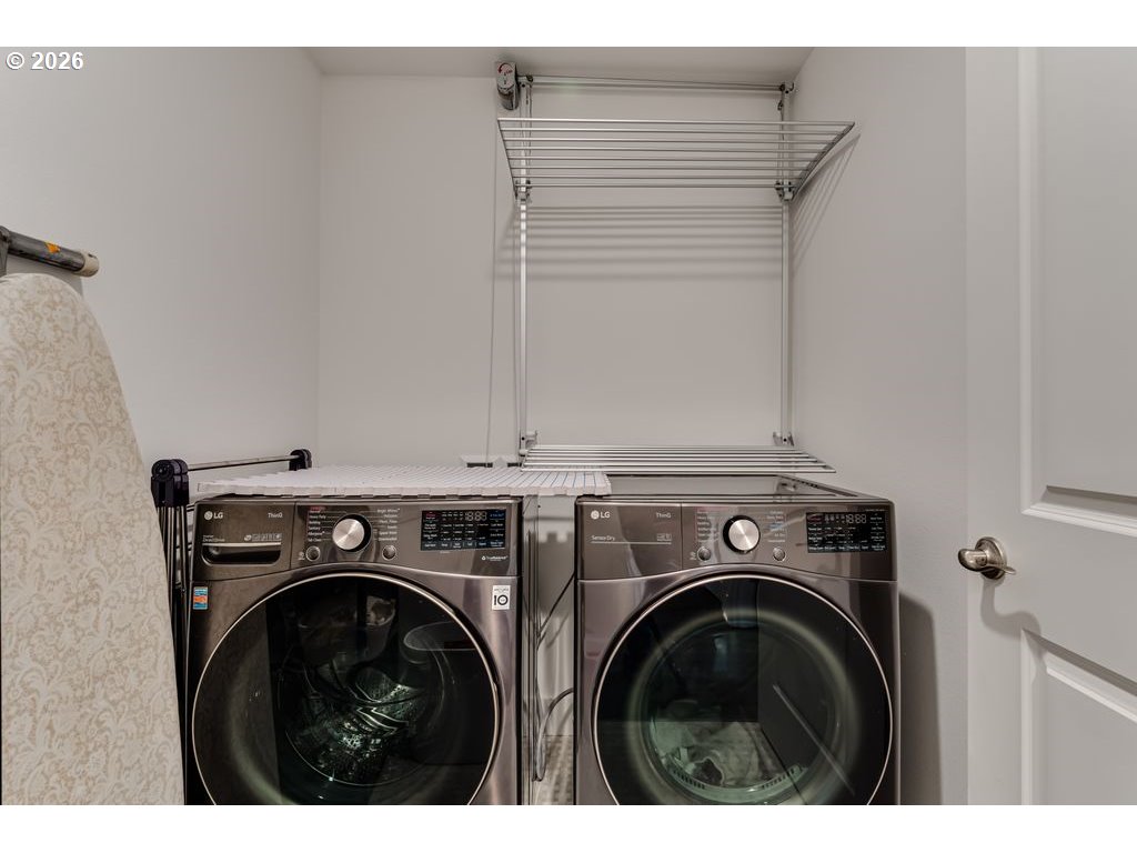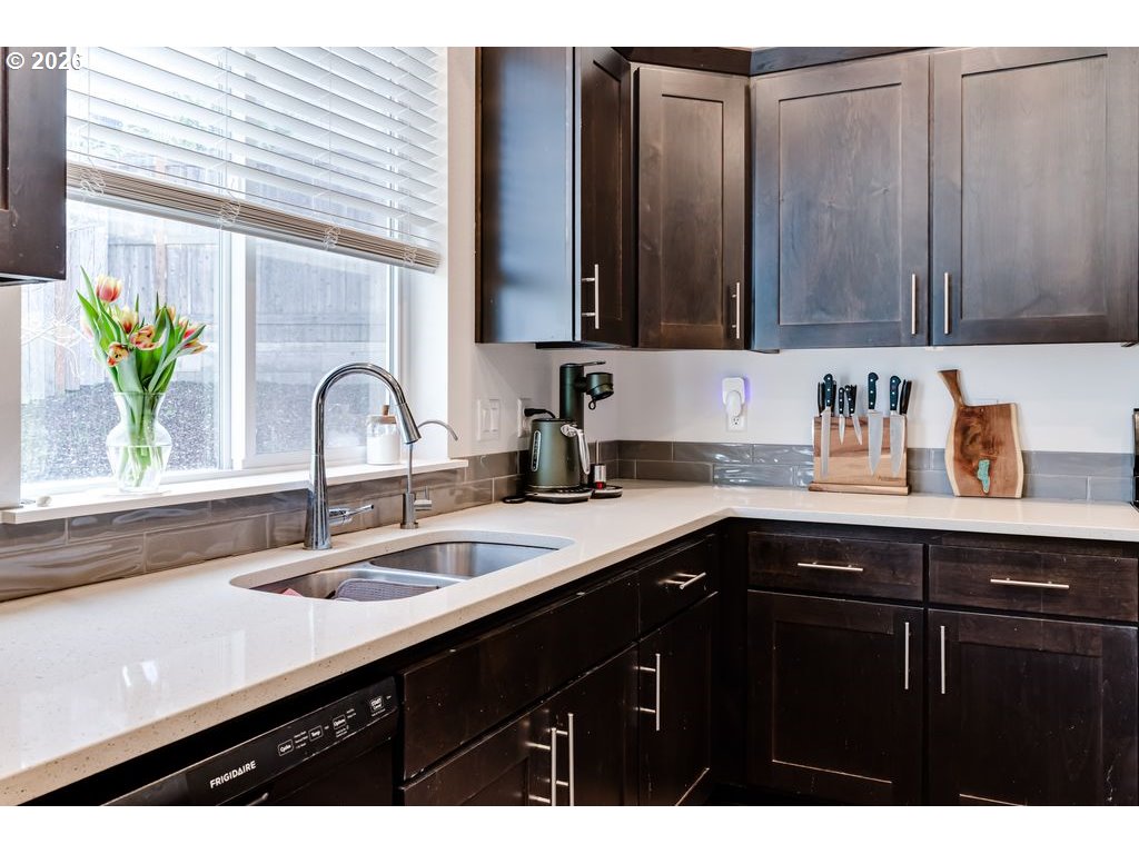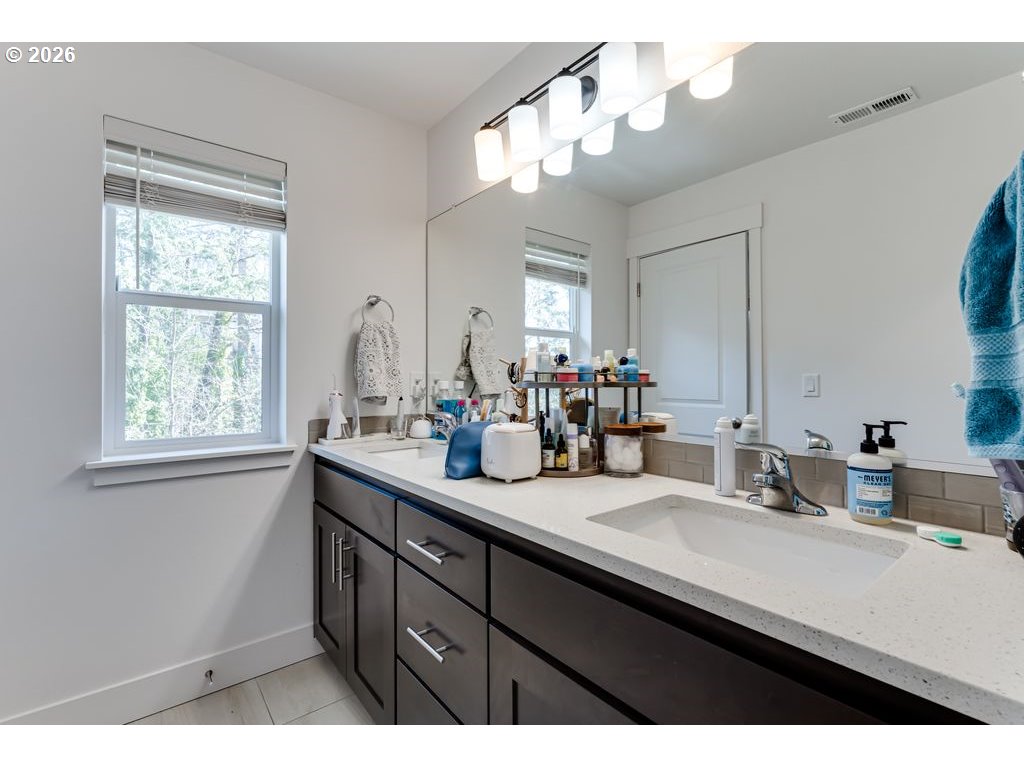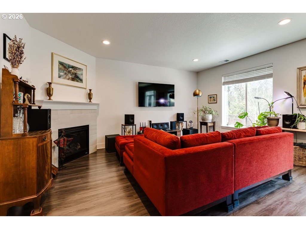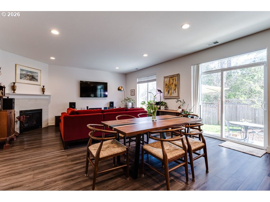 Like-new and beautifully maintained, this 5-year-old home offers modern comfort in a pride-of-ownership neighborhood. Bright and airy with high ceilings and abundant natural light, the open layout combines living spaces, flowing into a stylish kitchen with quartz countertops, gas range, Samsung stainless steel refrigerator, generous pantry, and island with built-in outlets. Sliding glass doors lead to a composite deck—perfect for easy indoor-outdoor entertaining. A protected natural area runs along the backyard, creating a peaceful, private setting and serving as the direct view from the primary suite, complete with walk-in closet and en suite bath with double sinks and quartz counters. Upstairs, a roomy loft adds flexible space for an office, den, or creative studio, plus well-sized bedrooms and a convenient laundry room with drying rack system (washer and dryer included). Thoughtful extras include a gas fireplace, surround sound, gas water heater, and recently serviced HVAC. Over $40K in upgrades: new vinyl flooring throughout, AC unit, Wyze security system, and extensive landscaping with fencing, drip irrigation, sprinklers, raised beds, drainage, pear and plum trees, lilacs, and strawberries. Prime location close to the University of Oregon, PeaceHealth, and downtown Eugene. Don't wait--schedule your private tour today! Open houses 3/21 and 3/22 noon-1:30 pm.
