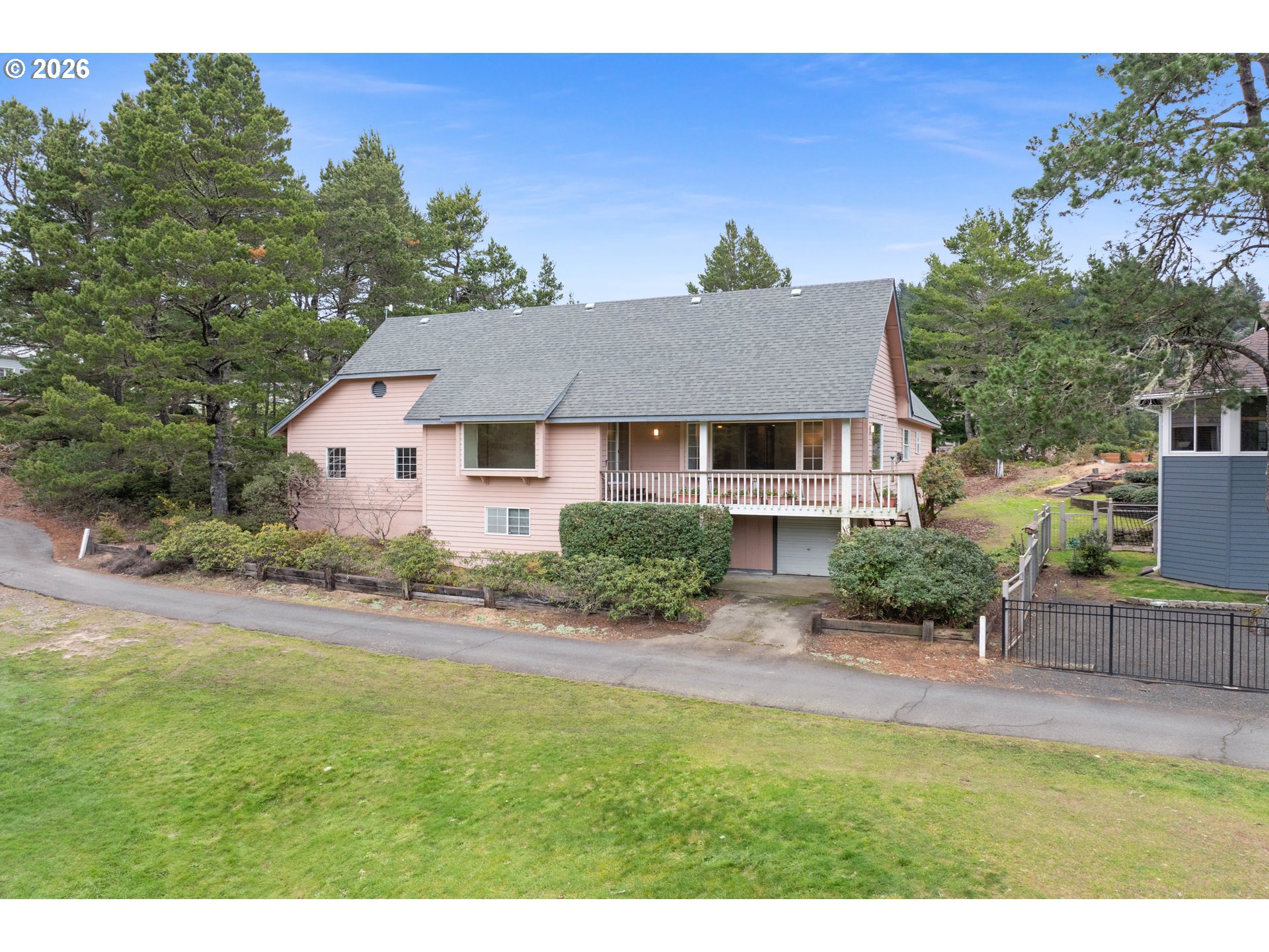 If you're searching for a quiet, safe, and peaceful spot along the Oregon Coast, this home could suit you perfectly! Set within Florence's exclusive Ocean Dunes Golf Course gated community, it offers a view of the 18th green right from your covered deck—perfect for relaxing while you watch the action or join in yourself. This custom-built 2,192 sq. ft. residence features two bedrooms, two bathrooms, and a spacious upstairs family room. The open-air plan includes hard surface flooring in high-traffic areas, with carpeted bedrooms for added comfort. The family room upstairs can be used as a studio, den, or extra space for guests. The kitchen has a convenient pass-through window to the dining room, making serving and clean-up easy. Enjoy cozy evenings by the fireplace in the living room while observing wildlife and golfers through picture windows. Along with the attached two-car garage, there’s a dedicated 762 sq. ft. golf cart garage facing the cart path below, giving you quick access to the clubhouse and greens. There's also an adjoining workshop/hobby room ideal for projects or crafts. The neighborhood offers a peaceful and secure atmosphere, perfect for walking your dog and enjoying outdoor relaxation. If you desire more activities, Old Town Florence, the Pacific Ocean, Siuslaw River, seventeen lakes, and the National Dunes Recreation Area are all nearby, providing plentiful options for recreation. This home is offered by its original owner and awaits someone ready to make it their own. Contact your agent to schedule a viewing today!