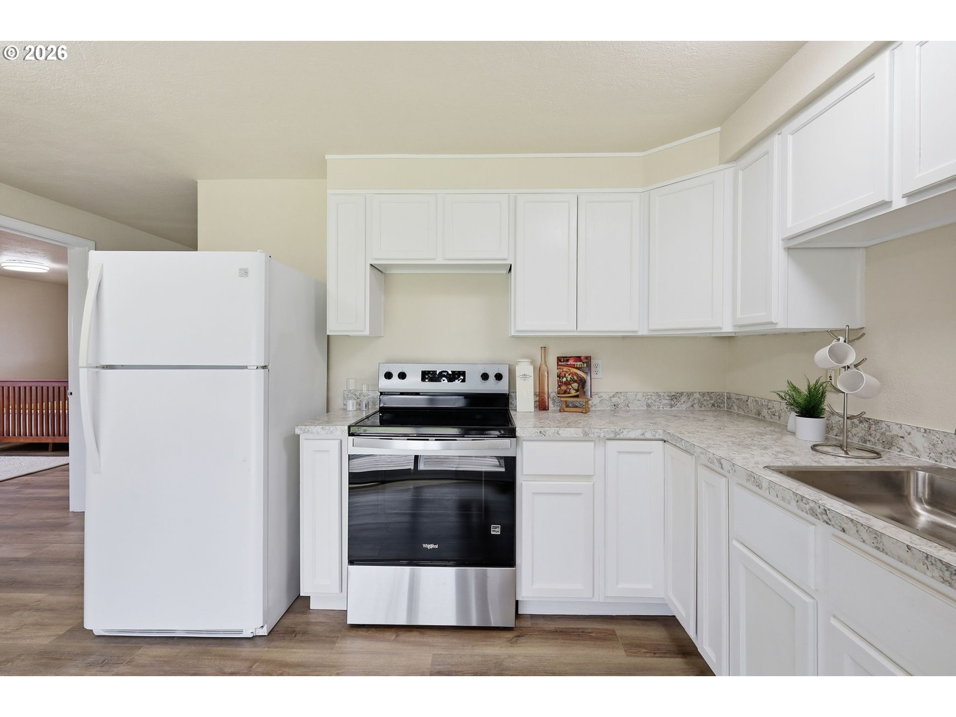 Centrally located home with an open floorplan and good separation of space. The property features a large backyard with a covered patio and room for outdoor activities or gardening. Updates completed in 2025 include a new roof, interior paint, LVP flooring throughout, and replacement of all light fixtures. The kitchen was fully remodeled with new cabinets and Whirlpool stainless steel appliances, including a dishwasher and glass top range. The bathroom was also fully remodeled and features a large bathtub with a subway tile surround. Move-in ready and conveniently located near shopping, services, and other area amenities.