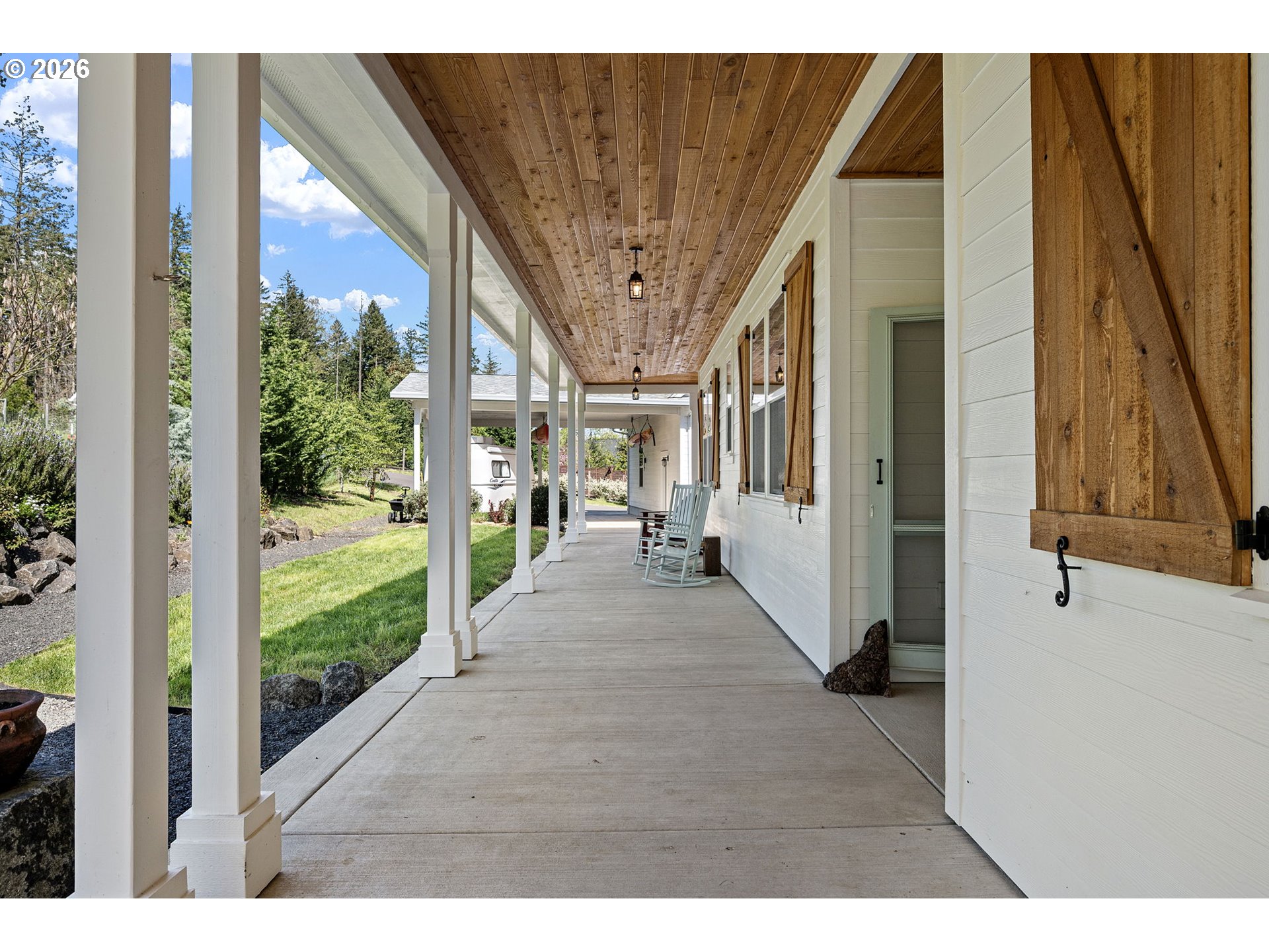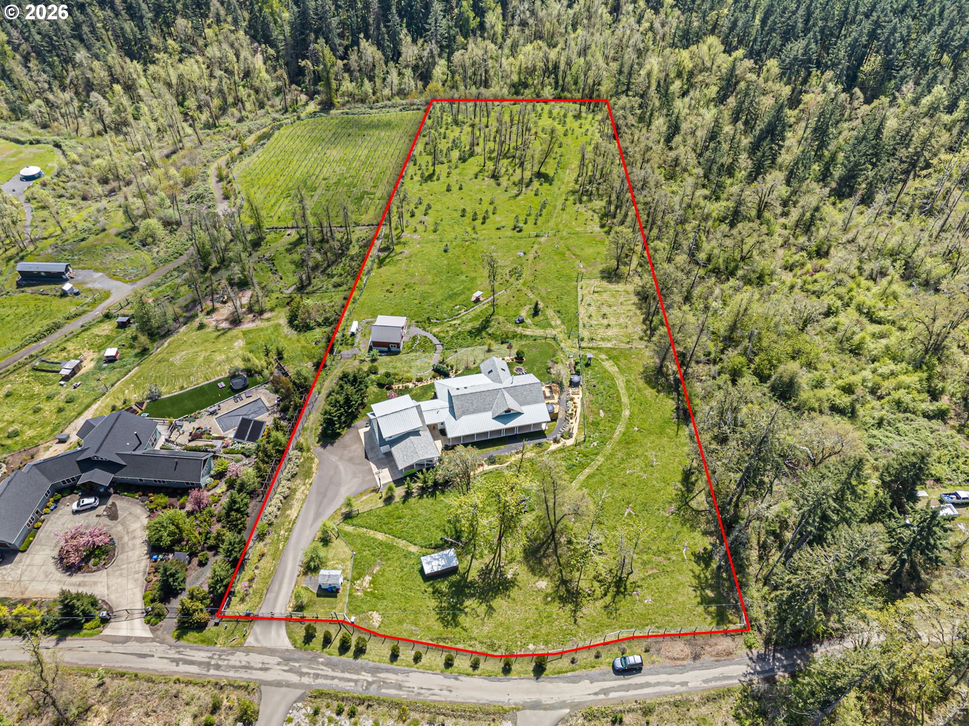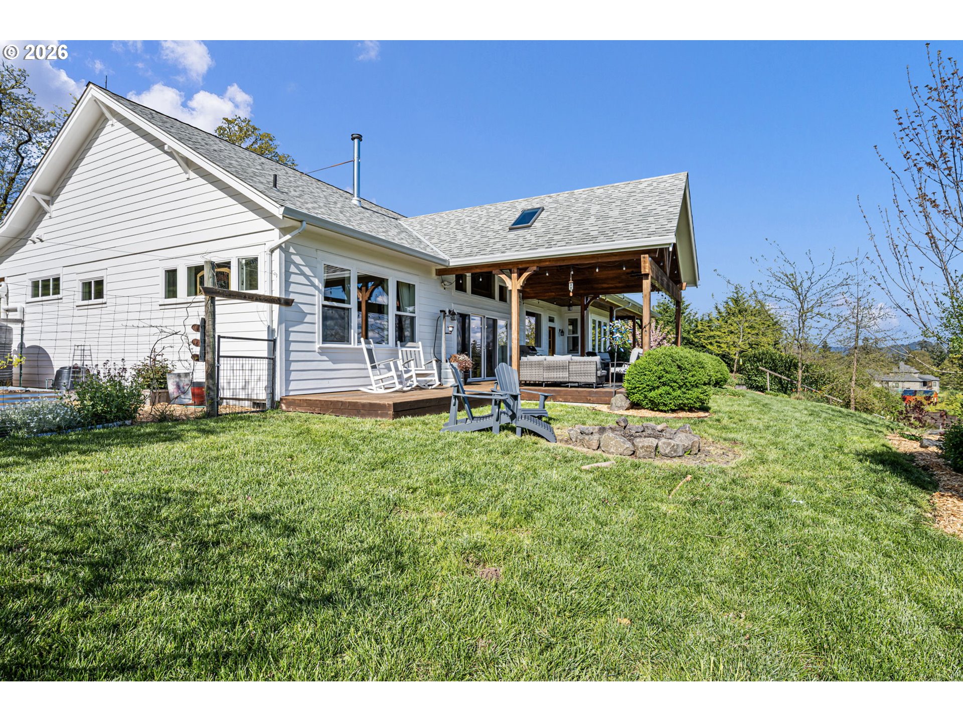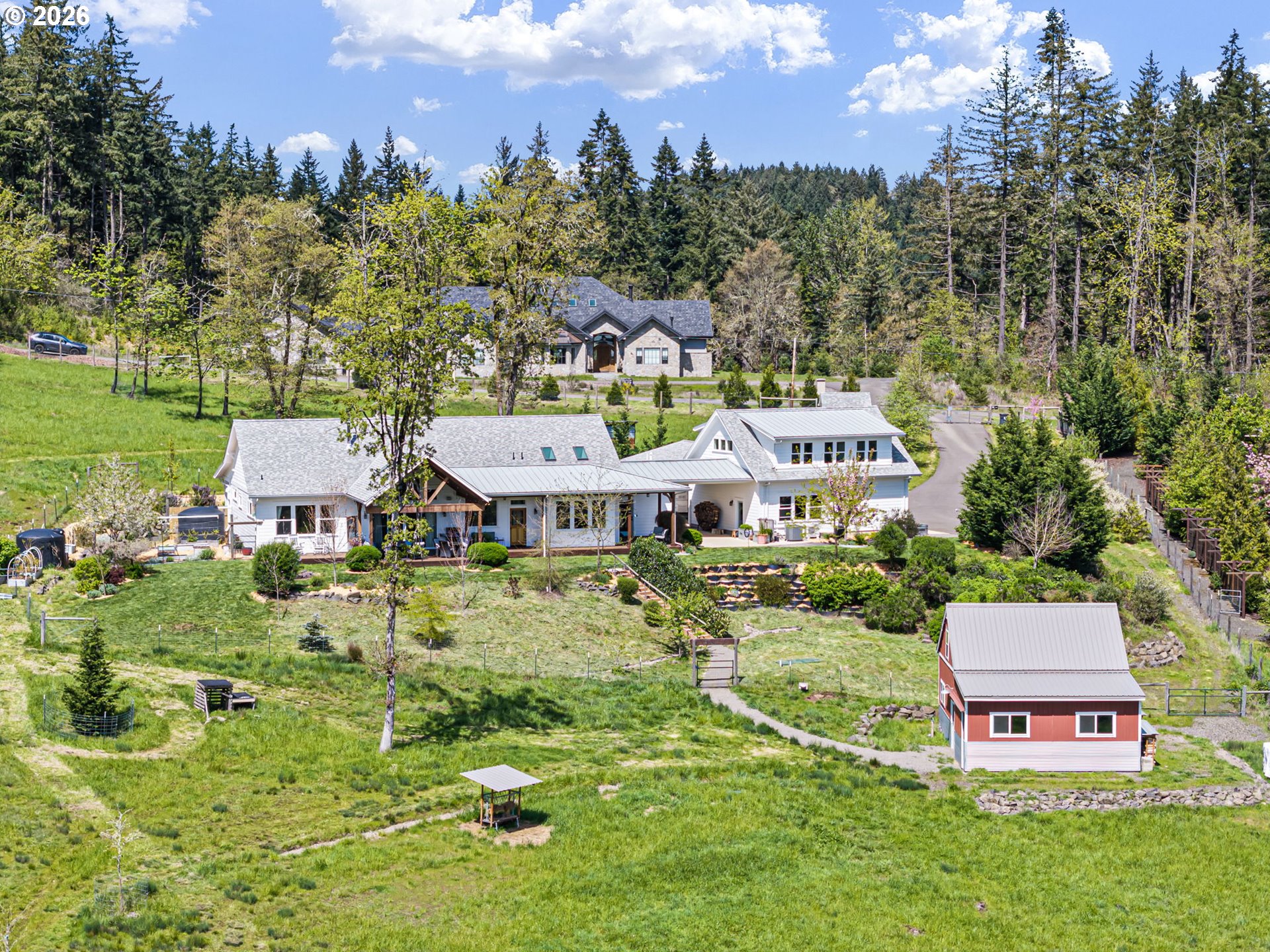 (503) 893-8874Contemporary one-level farmhouse set on over 6 acres. A welcoming wraparound covered patio and expansive redwood deck create over 1,500 sq ft of outdoor living space, perfect for relaxing or entertaining in every season. Thoughtfully designed by local designer Pat Greenwell, filled with natural light this home offers 10-foot ceilings, vaulted livingroom and abundant windows showcasing beautiful south-facing views from the kitchen, dining, livingroom and primary suite. Warm Italian solid oak-oil finished floors throughout, complimented by solid alder interior doors and stunning mahogany Dutch door that opens to the rear deck. The custom kitchen features rift oak cabinetry, quartz countertops, stainless steel appliances, gas range, built-in oven, and solid dovetail drawers. A blend of natural oak and tastefully distressed Elephant Grey cabinetry adds character and depth. Enjoy the convenience of on-demand hot water with a recirculating system throughout the home. The primary suite offers a spa-like bath with radiant heated floors, a flush-entry 5x5 tiled shower with rain head, and high-end finishes throughout. A covered breezeway connects the home to the insulated, finished two-car garage, shop, and additional flex space/guest suite. This versatile area also serves as a functional outdoor hub with space for firewood storage, shaded seating, and a hot/cold exterior wash station. The vaulted livingroom features a wood stove set in a brick surround, providing efficient, cozy warmth throughout the main living areas. Additional features include a backup electrical panel for essential circuits and a natural gas generator capable of extended operation while connected to gas meter. Outside, the property is equally impressive with a barn, fenced garden area, raised beds, and established plantings including grapes, marionberries, blueberries, raspberries, and flowers. A mature orchard of pears, cherries, plums & apples completes this peaceful and productive country setting.