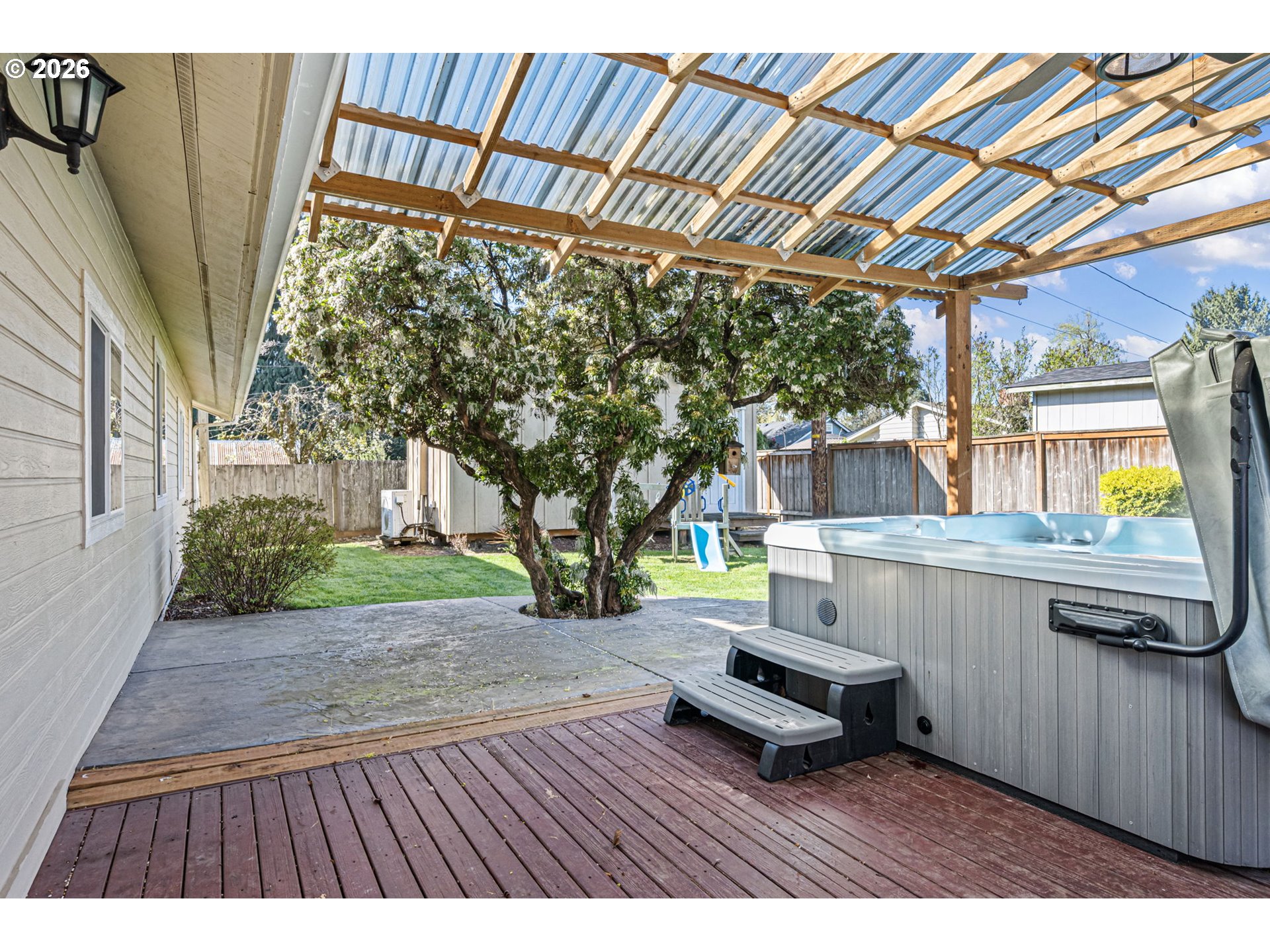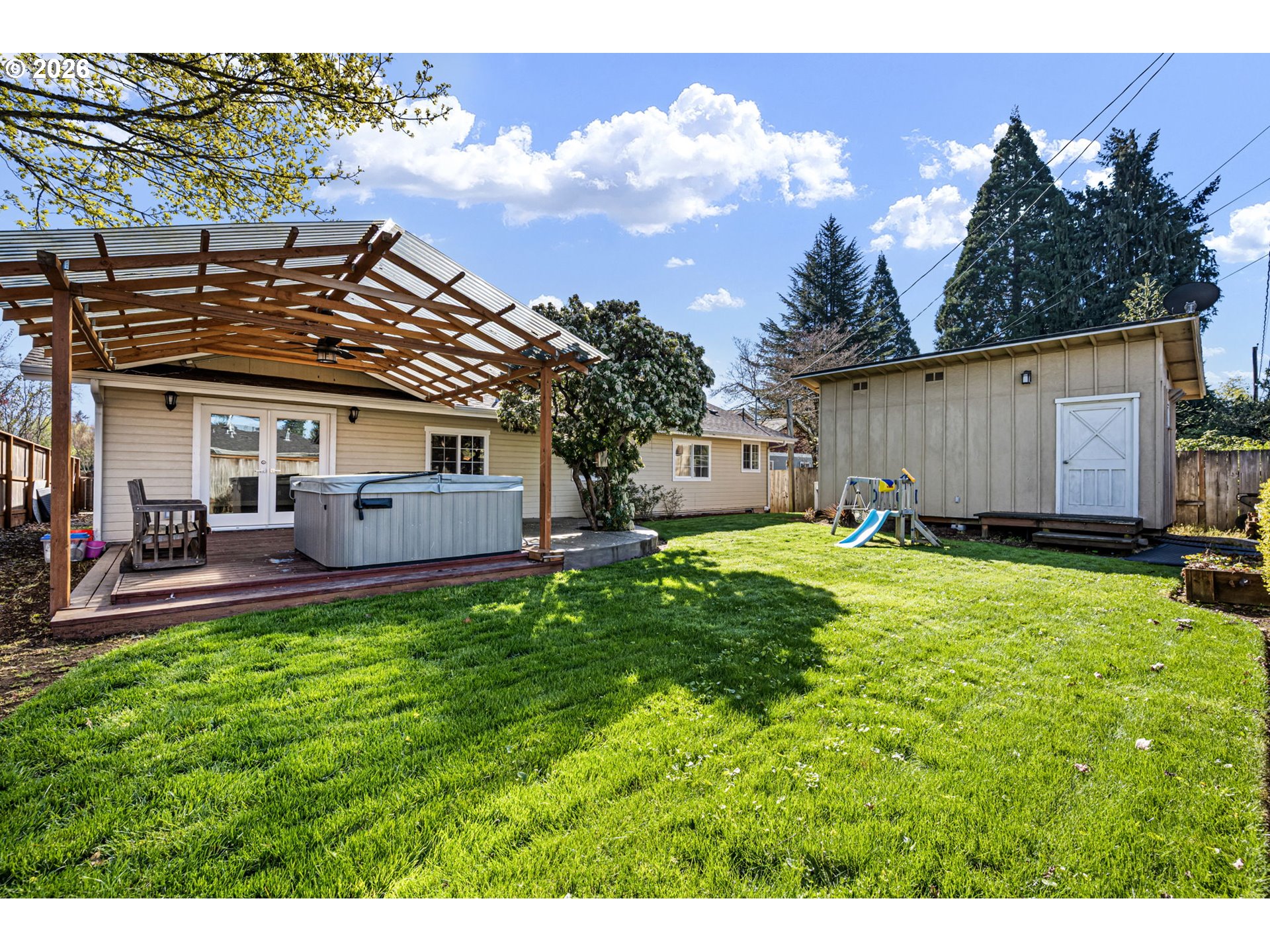 Beautifully updated home in the desirable Ferry Street Bridge neighborhood offering 4 bedrooms (or 3 plus a bonus/flex/office), 2.1 baths, and 1,731 sq ft of living space. A covered front porch welcomes you into bright, vaulted interiors filled with natural light.The main living areas including the living room, family room, dining area, and kitchen, feature durable luxury vinyl plank flooring, while the bedrooms are newly carpeted. The living room showcases an updated gas fireplace and remote-operated blinds.The open kitchen offers oak cabinetry, updated countertops, backsplash, sink, island, and a gas range, perfect for both everyday living and entertaining. French doors lead to a covered deck with hot tub and an expansive concrete patio, creating an ideal indoor-outdoor living space.The mature, landscaped yard includes a sprinkler system for easy maintenance. The primary suite features a walk-in closet and a beautifully updated bathroom.A detached shed/workshop includes its own electrical service and ductless heat pump/AC, providing excellent versatility. The two-car garage is equipped with a 220-amp outlet.Conveniently located just minutes from Oakway Center and Autzen Stadium, this turnkey home offers comfort, style, and functionality in a prime location.