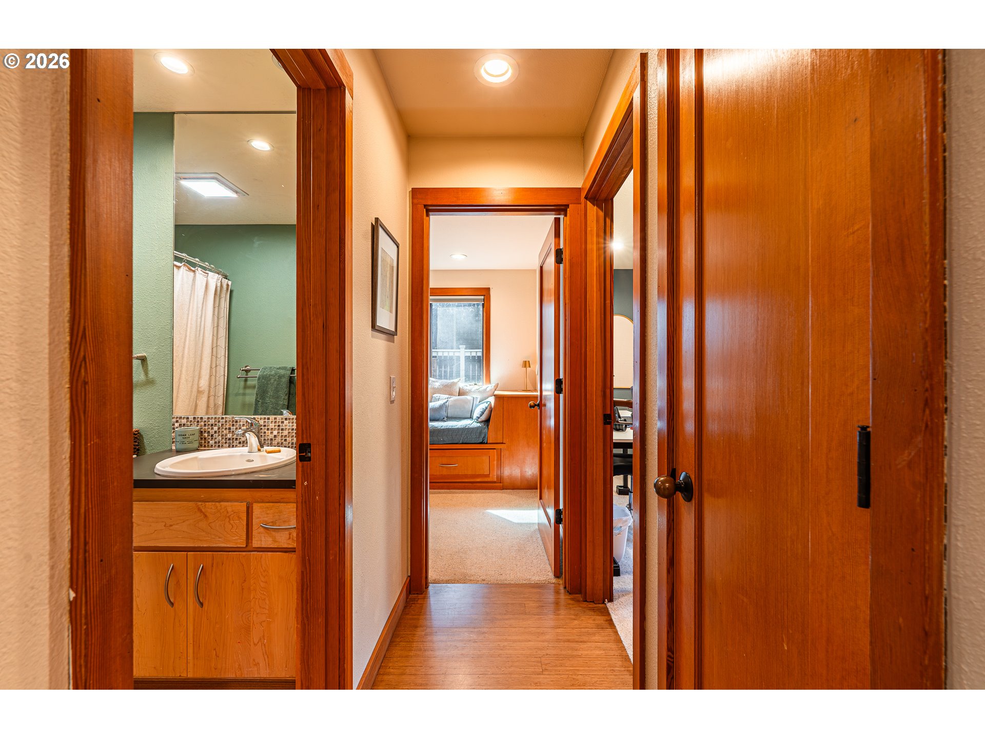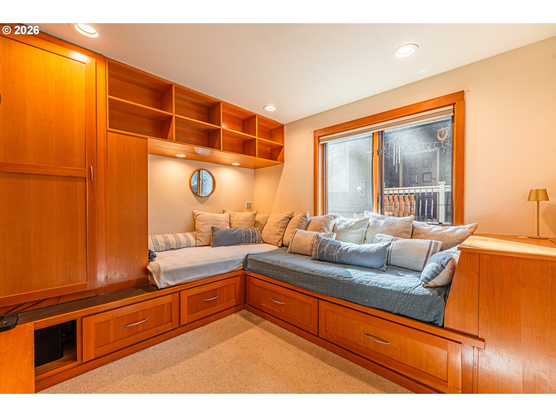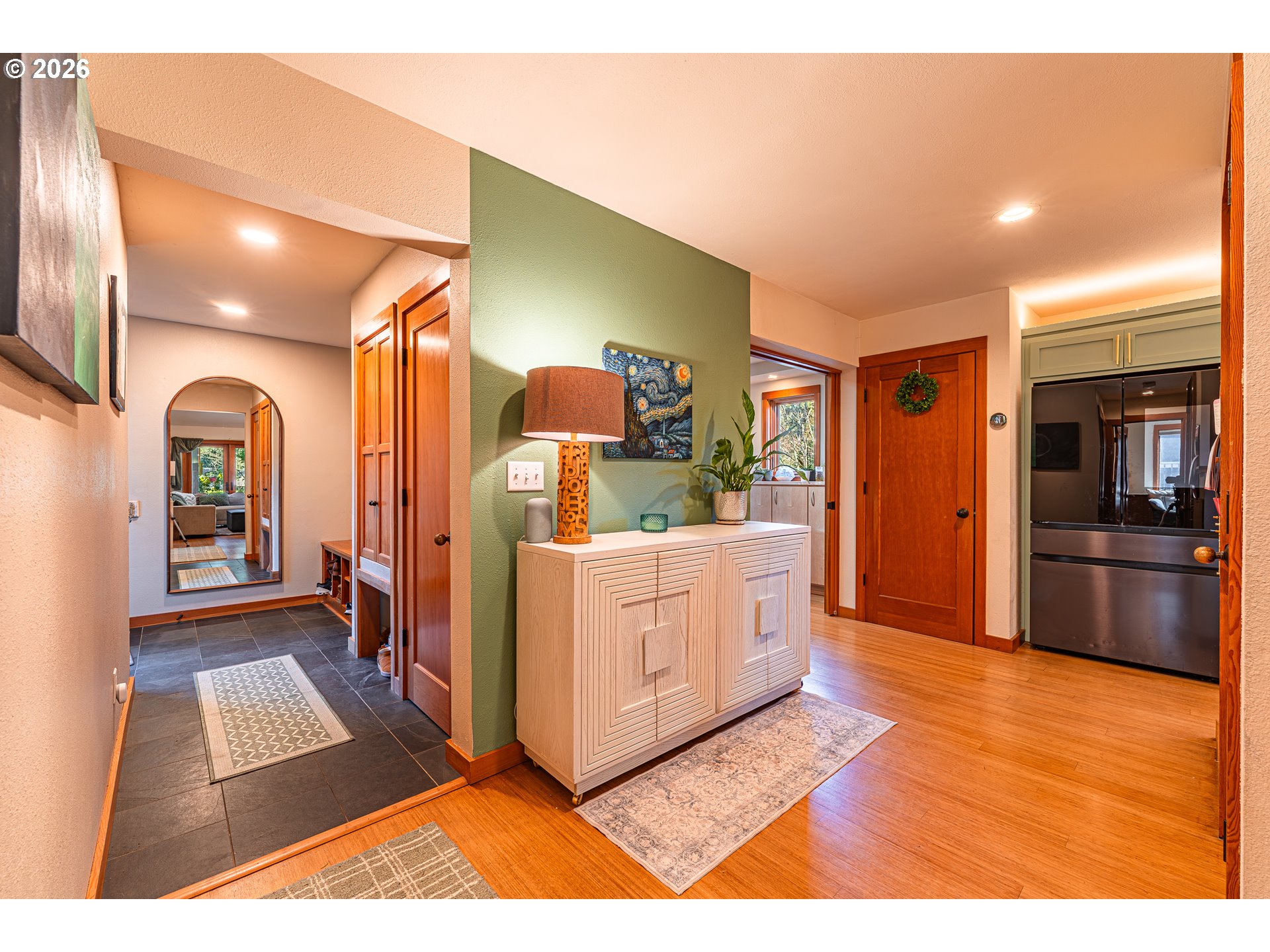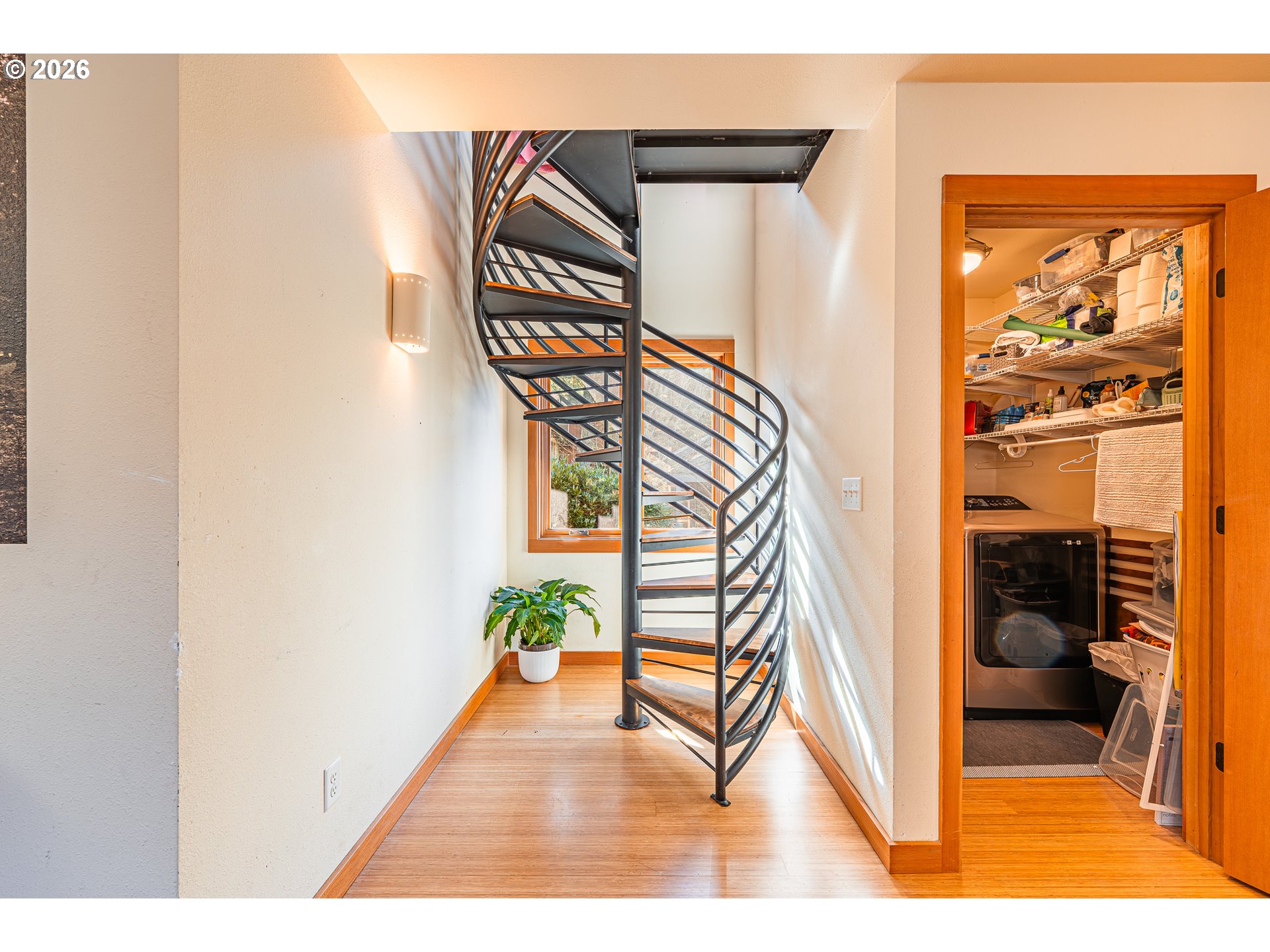 Tucked away in a serene private community surrounded by towering evergreens, this 4-bedroom, 3-bath Midcentury PNW Contemporary home is a true retreat. Clean architectural lines, warm wood tones, vaulted ceilings, and bamboo floors create an inviting blend of style and durability throughout the main living spaces. Skylights flood the home with natural light by day and offer cozy views of the night sky after sunset, enhancing the open, airy feel. A wood stove provides warmth and ambiance in the winter, while air conditioning keeps things comfortable through the summer months. With EV charging capability already in place, this home is thoughtfully equipped for modern living. The updated kitchen combines beauty and function with custom cabinetry, butcher block counters, and smart appliances. Built-in storage throughout the home ensures space for everything you need. From the kitchen, the layout flows seamlessly into the main living and dining areas—ideal for both everyday living and effortless entertaining. Leading up the spiral staircase is the fourth bedroom, offering a private retreat complete with its own full bath and two built in twin beds. It’s a perfect setup for guests, a home office, or multigenerational living. An on-demand water heater adds efficiency and provides endless hot water for daily comfort. Enjoy peaceful seclusion while remaining just minutes from the University of Oregon, downtown Eugene, and downtown Springfield. This home offers timeless design, modern convenience, and the tranquility of true forest living. Open house Sat 3/7/26 Sun 3/8/26 10am-12pm. Come see this unique home.