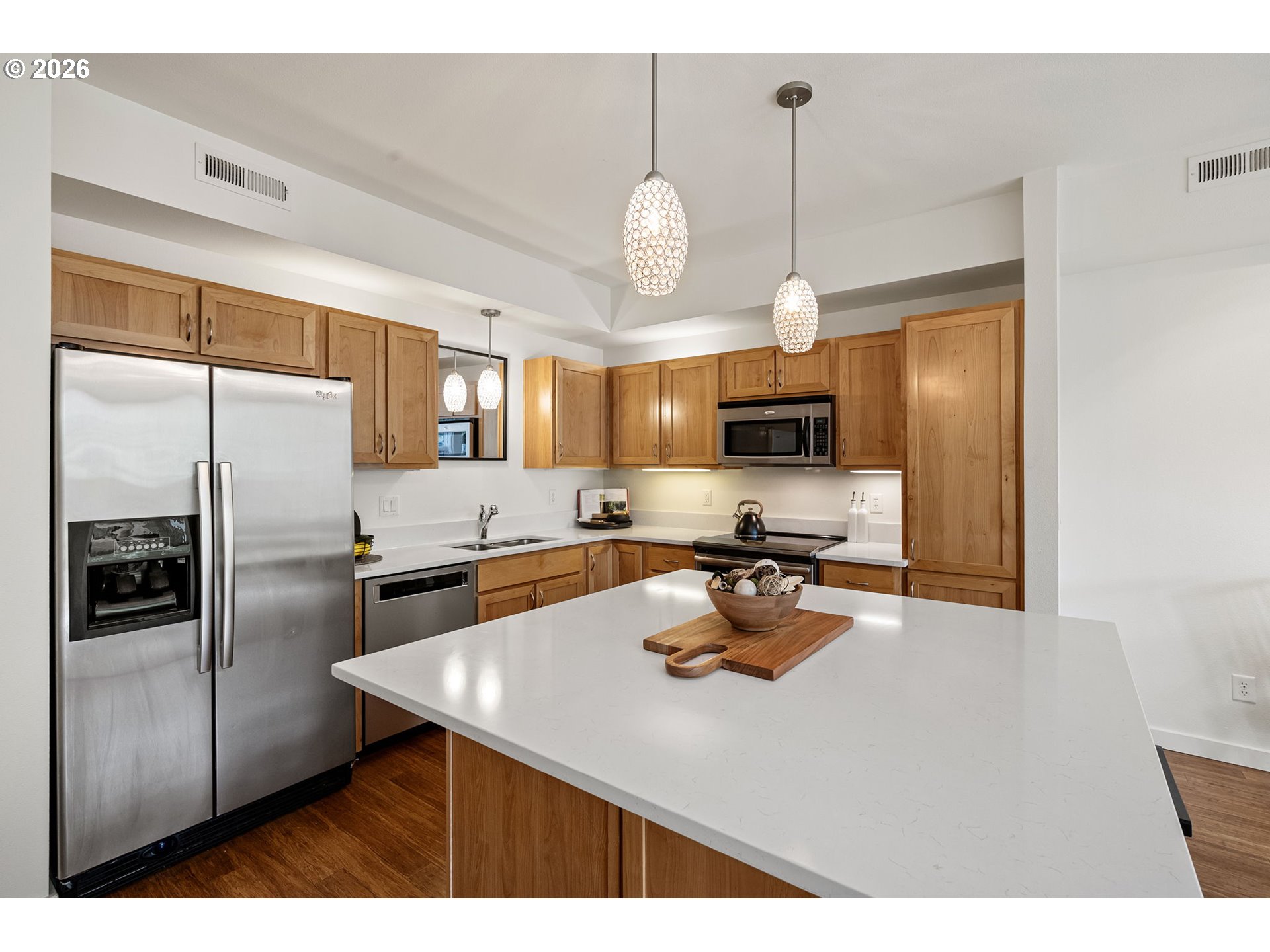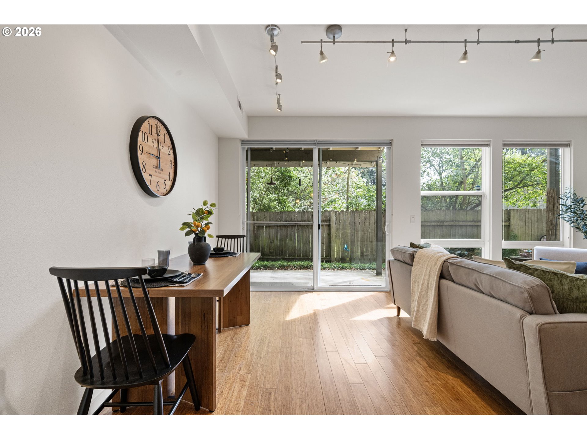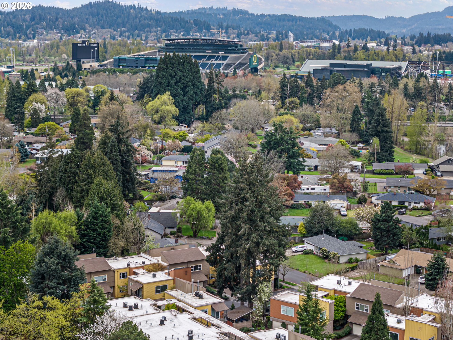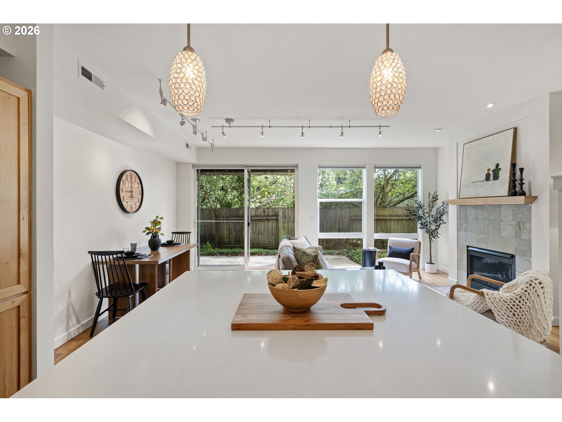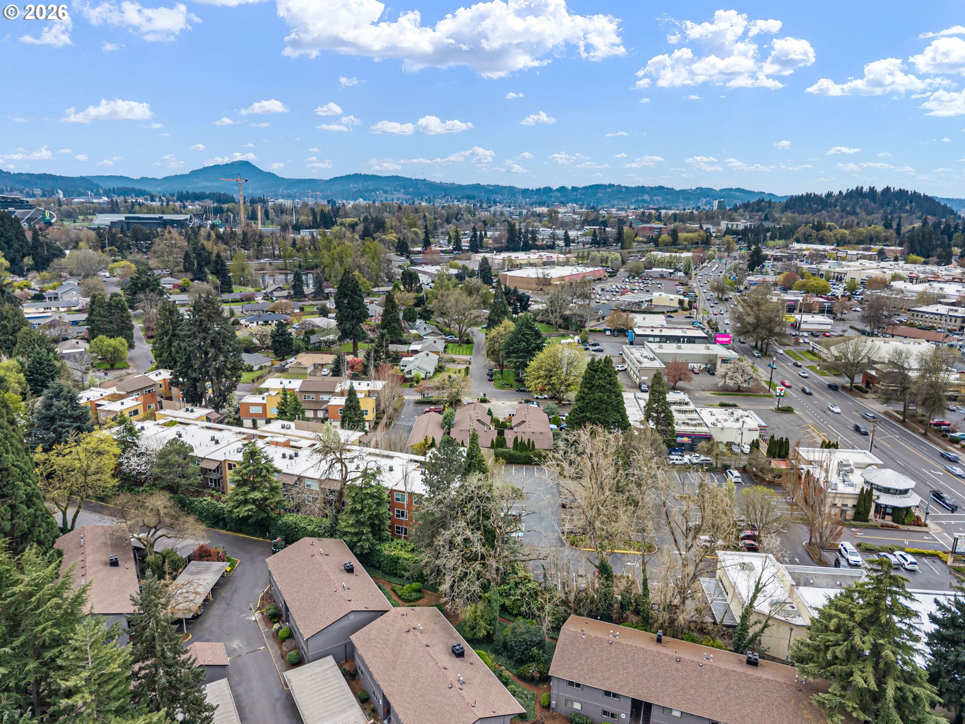Location is key and this stunning two-bedroom contemporary condo delivers. Terraces at the Pavilion is situated in the highly sought after Ferry St Bridge. Step inside to find an open concept space featuring a well-appointed kitchen with brand new quartz counters, large island with eating bar on two sides, under cabinet lighting and stainless-steel appliances ensure this kitchen is functional and welcoming. Sliding door opens from the living room to the patio to create perfect flow for everyday living and entertaining. The gas fireplace and high ceilings provide an inviting ambiance, while large windows ensure the space is filled with natural lighting. The unit also boasts new interior paint throughout. The spacious primary bedroom features a private bath and not one but two walk-in closets great for the fashionista or those who desire additional storage space. This condo offers the convenience of a washer and dryer within the unit and the added benefits of a dedicated parking space and a single car garage. Well, maintained common area complete with a sitting area and fountain. In addition, you're close to shopping, dining and just minutes away from Autzen Stadium, river trails, and the U of O campus. The HOA covers sewer, trash, water, exterior maintenance, landscaping plus cable & internet. This is an exceptional opportunity to create a low maintenance and enjoyable lifestyle! Schedule your showing today.