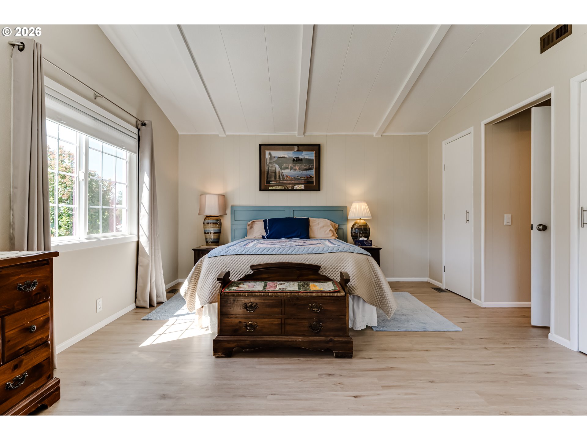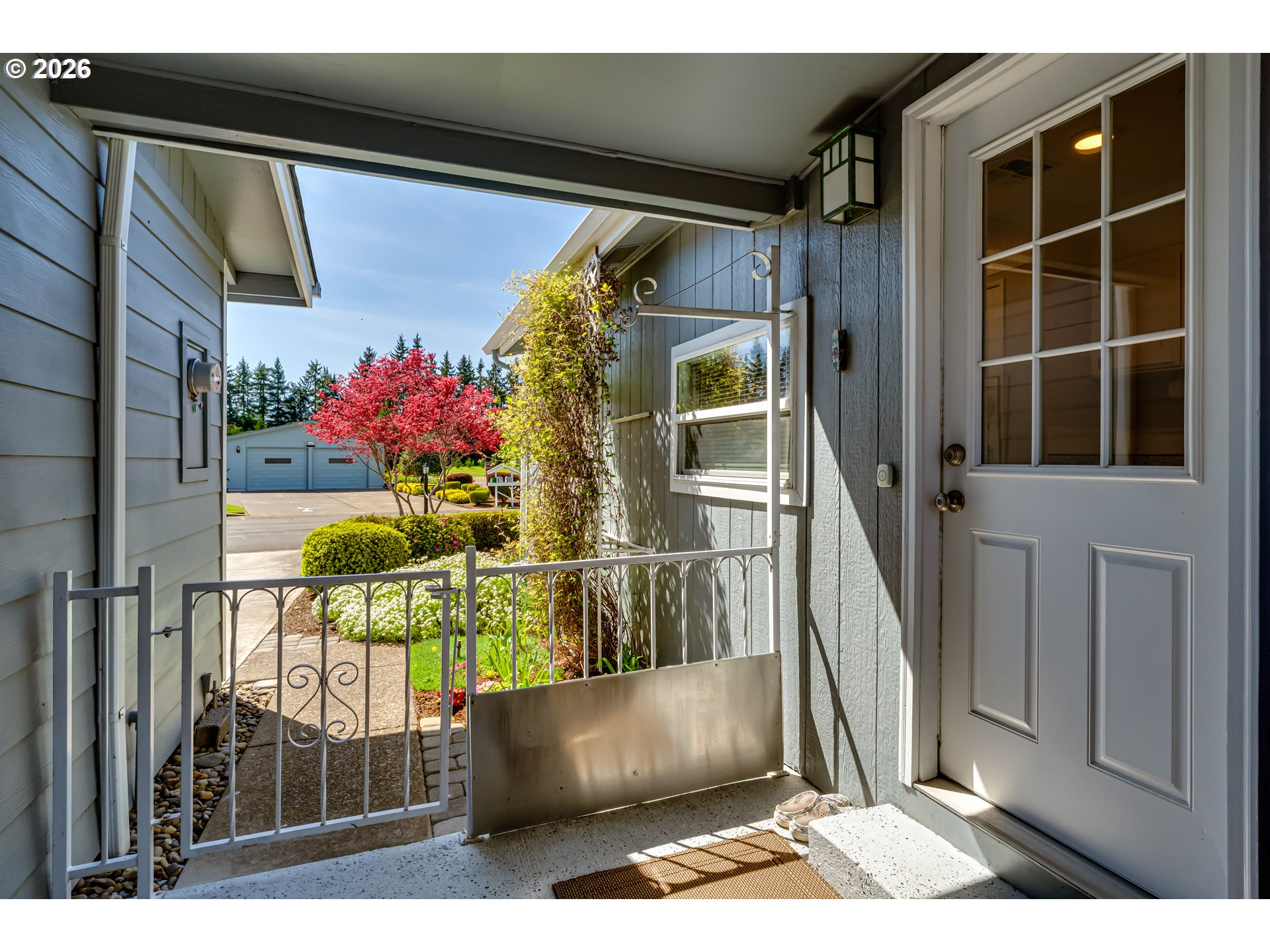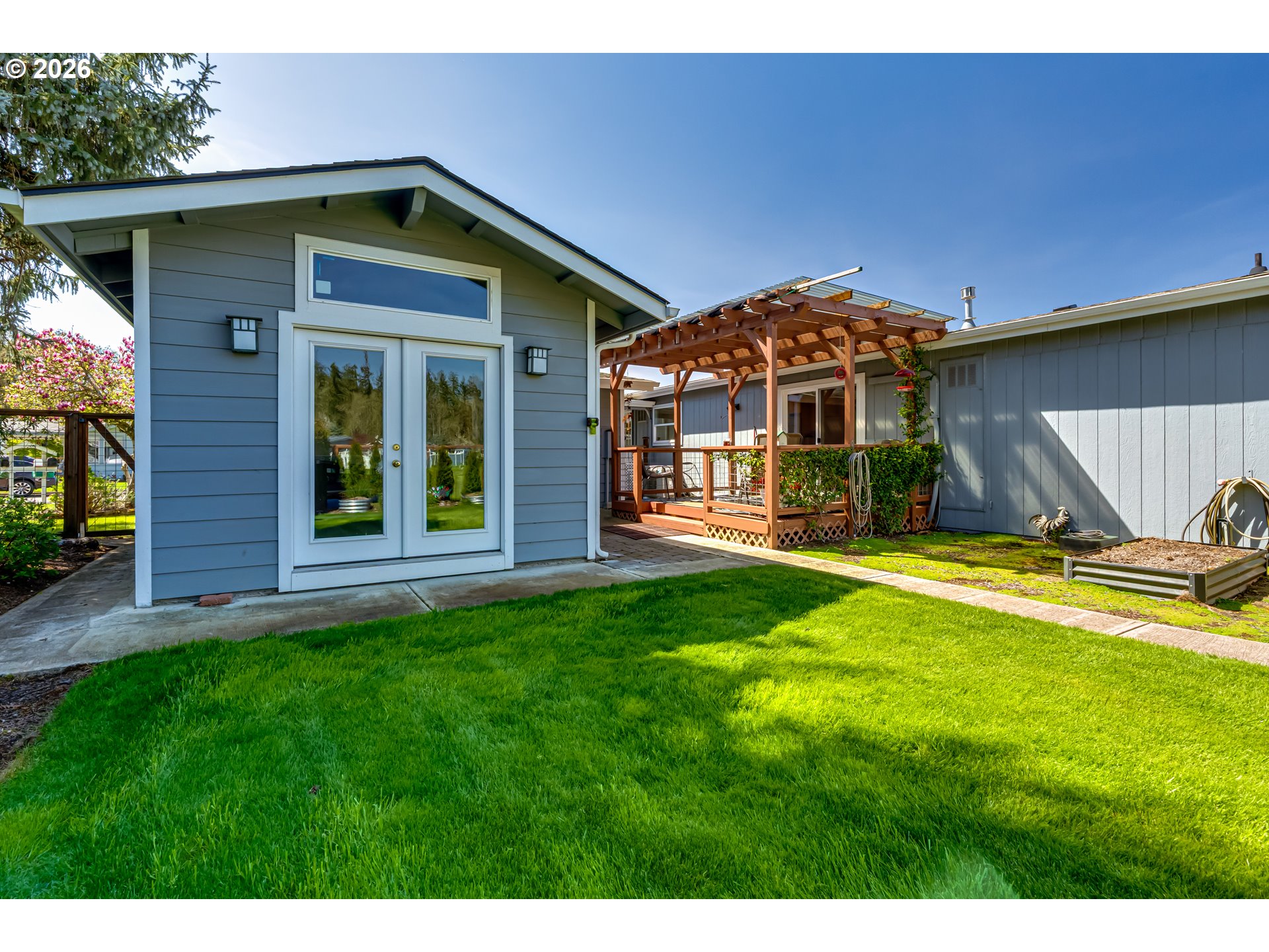 Own your own land in the desirable Staffordshire 55+ gated community and enjoy country living on the edge of Eugene. This spacious triple-wide manufactured home offers 2 bedrooms, 2 bathrooms, gas appliances, and a cozy gas fireplace. Ductless heating and cooling units are installed in the garage, both bedrooms, and the dining room for year-round comfort. A fully finished 15x11 office/craft room provides excellent space for hobbies or work, and the 11x9 shop includes electrical hookups for projects. Outdoor features include raised flower beds, blueberry bushes, a fenced backyard, and covered front and back decks perfect for relaxing or entertaining. From the back deck, enjoy peaceful views of Mount Pisgah and the open common area behind the home. The primary bedroom includes a spacious 14x6 walk-in closet with built-in shelving. The garage is well equipped with built-in metal cabinets, two ceiling fans, and its own ductless unit for year-round usability. HOA dues are $242/month and cover water, septic, garbage, and common area maintenance. Staffordshire offers trails, river access, and community amenities including a pool and hot tub. Enjoy a low maintenance nature rich lifestyle. Come see today.