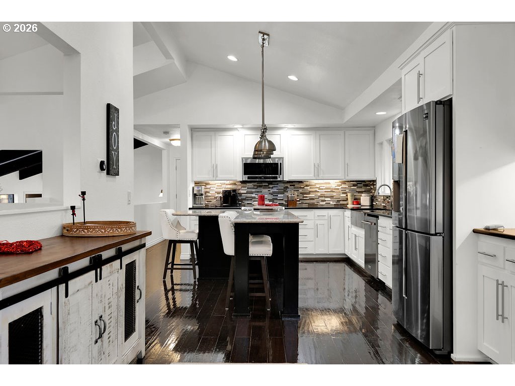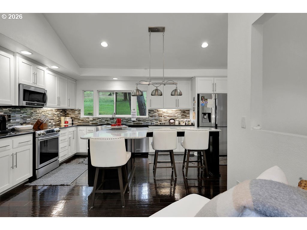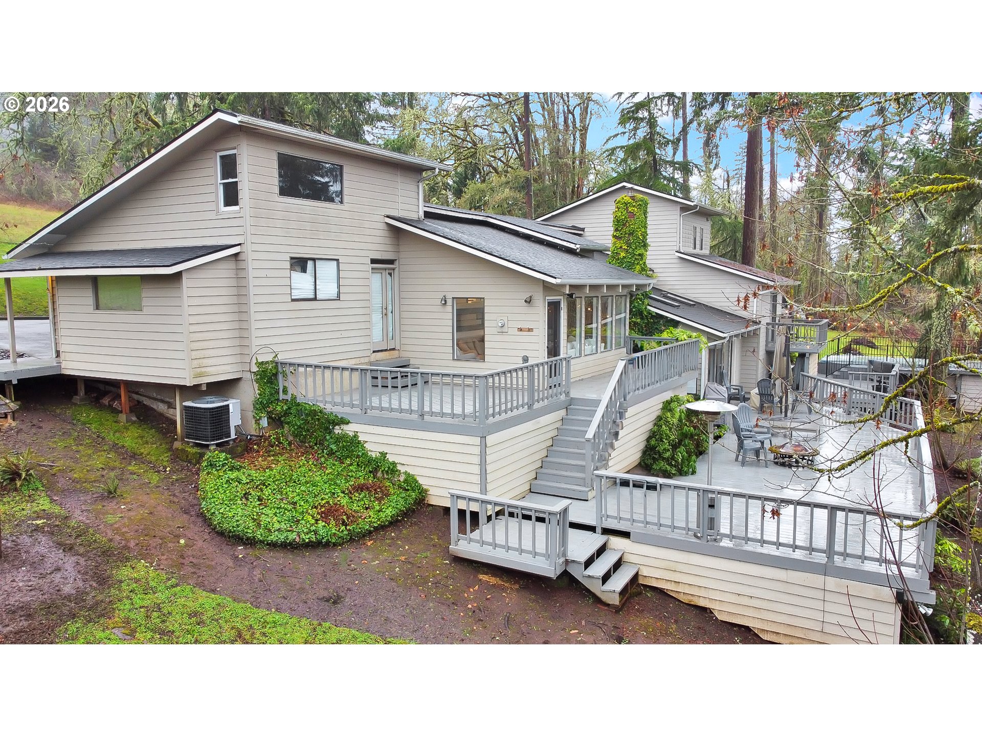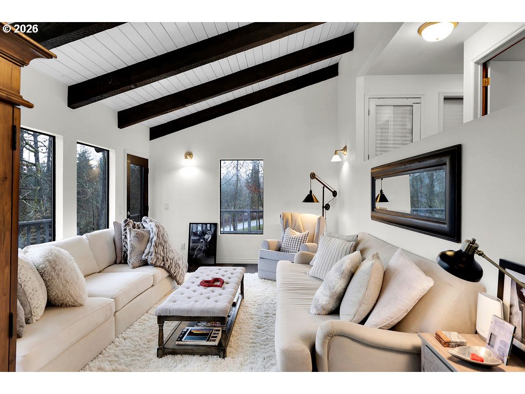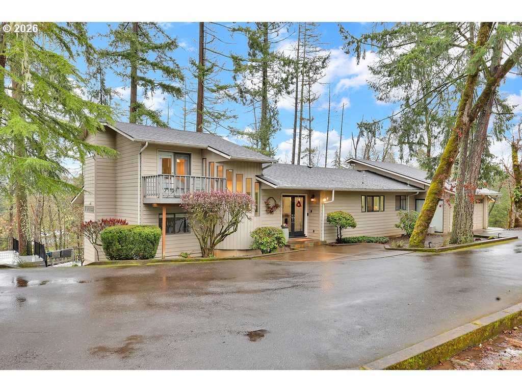 Stunning updated contemporary home set on 4.24 private acres just minutes from Eugene, offering serene wooded surroundings and breathtaking filtered valley and mountain views. This 1977 gem boasts soaring vaulted open-beam ceilings, abundant skylights that flood the interior with natural light, and a cozy wood-burning fireplace in the spacious living area for year-round comfort. The thoughtfully renovated kitchen features modern appliances, an eat-in bar, and a generous walk-in pantry, flowing seamlessly into the dining and living spaces ideal for entertaining or everyday living. The primary suite serves as a peaceful retreat with a private bath, walk-in closet, and private balcony overlooking the treetops, while three additional bedrooms offer flexibility for family, guests, or home office use. Step outside to your expansive 2,600+ square foot deck, a true outdoor oasis complete with swim spa, lap pool, and hot tub for relaxation in any season. Additional highlights include an oversized 4-car shop/garage, gated paved driveway, covered RV parking with hookups, central vacuum system, and forced air/heat pump for efficiency. Nestled in the desirable Pleasant Hill School District, this rare country escape combines modern updates, income potential, abundant space to roam, and easy access to city amenities. A peaceful private retreat that truly has it all—schedule your private showing today before it's gone!