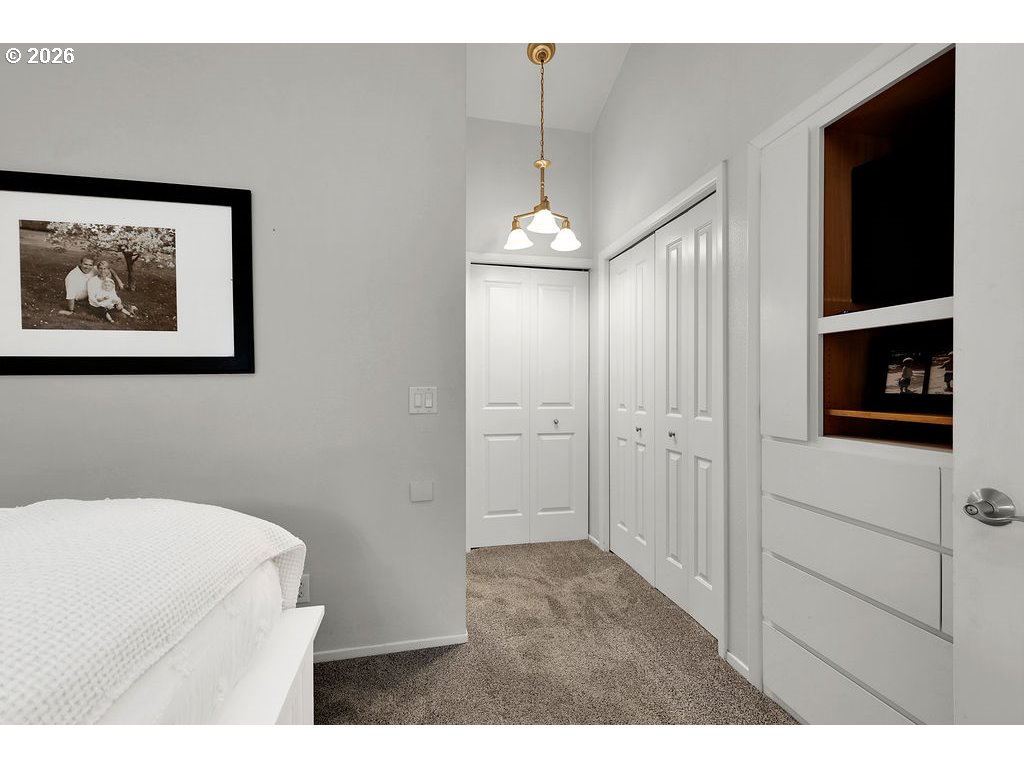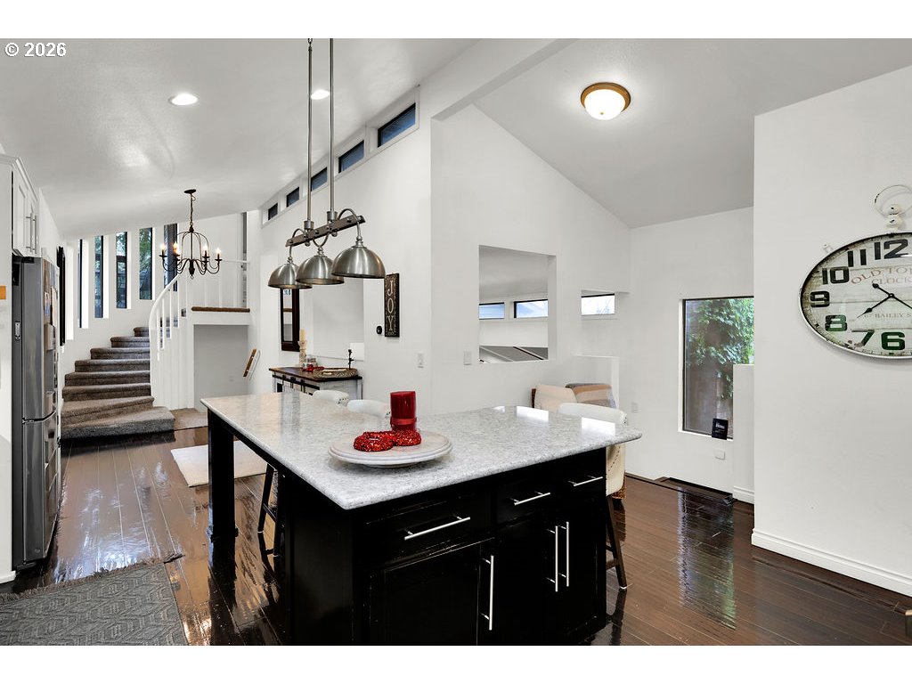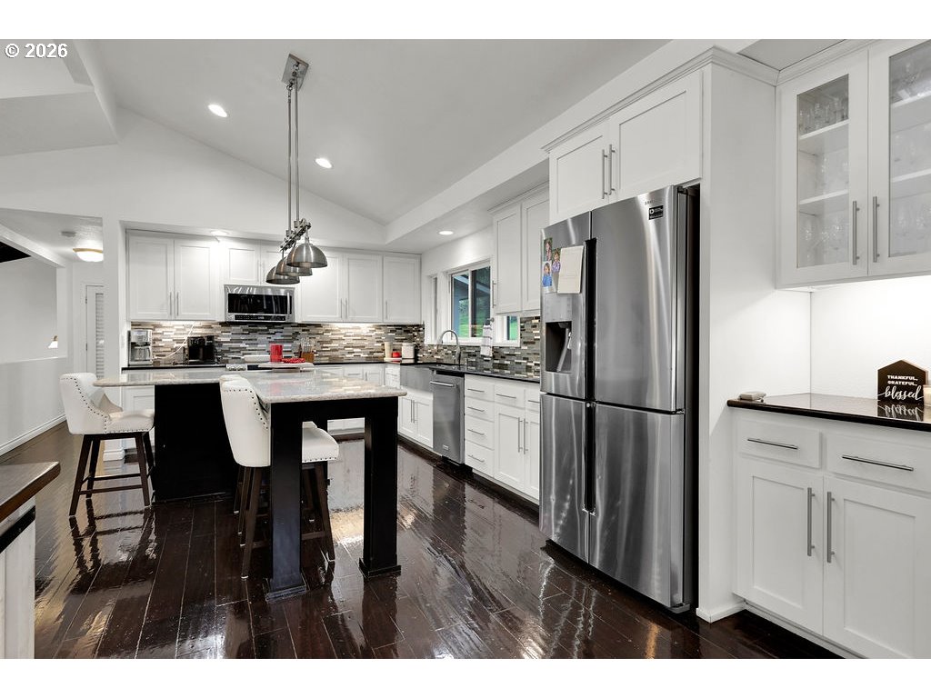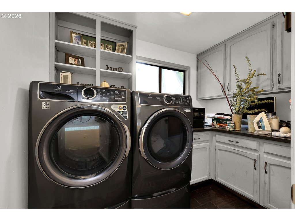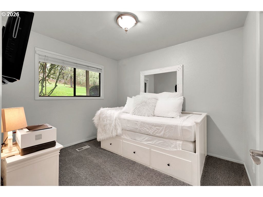 Stunning updated contemporary home set on 4.24 private acres just minutes from Eugene, offering serene wooded surroundings and breathtaking filtered valley and mountain views. This 1977 gem boasts soaring vaulted open-beam ceilings, abundant skylights that flood the interior with natural light, and a cozy wood-burning fireplace in the spacious living area for year-round comfort. The thoughtfully renovated kitchen features modern appliances, an eat-in bar, and a generous walk-in pantry, flowing seamlessly into the dining and living spaces ideal for entertaining or everyday living. The primary suite serves as a peaceful retreat with a private bath, walk-in closet, and private balcony overlooking the treetops, while three additional bedrooms offer flexibility for family, guests, or home office use. Step outside to your expansive 2,600+ square foot deck, a true outdoor oasis complete with swim spa, lap pool, and hot tub for relaxation in any season. Additional highlights include an oversized 4-car shop/garage, gated paved driveway, covered RV parking with hookups, central vacuum system, and forced air/heat pump for efficiency. Nestled in the desirable Pleasant Hill School District, this rare country escape combines modern updates, income potential, abundant space to roam, and easy access to city amenities. A peaceful private retreat that truly has it all—schedule your private showing today before it's gone!