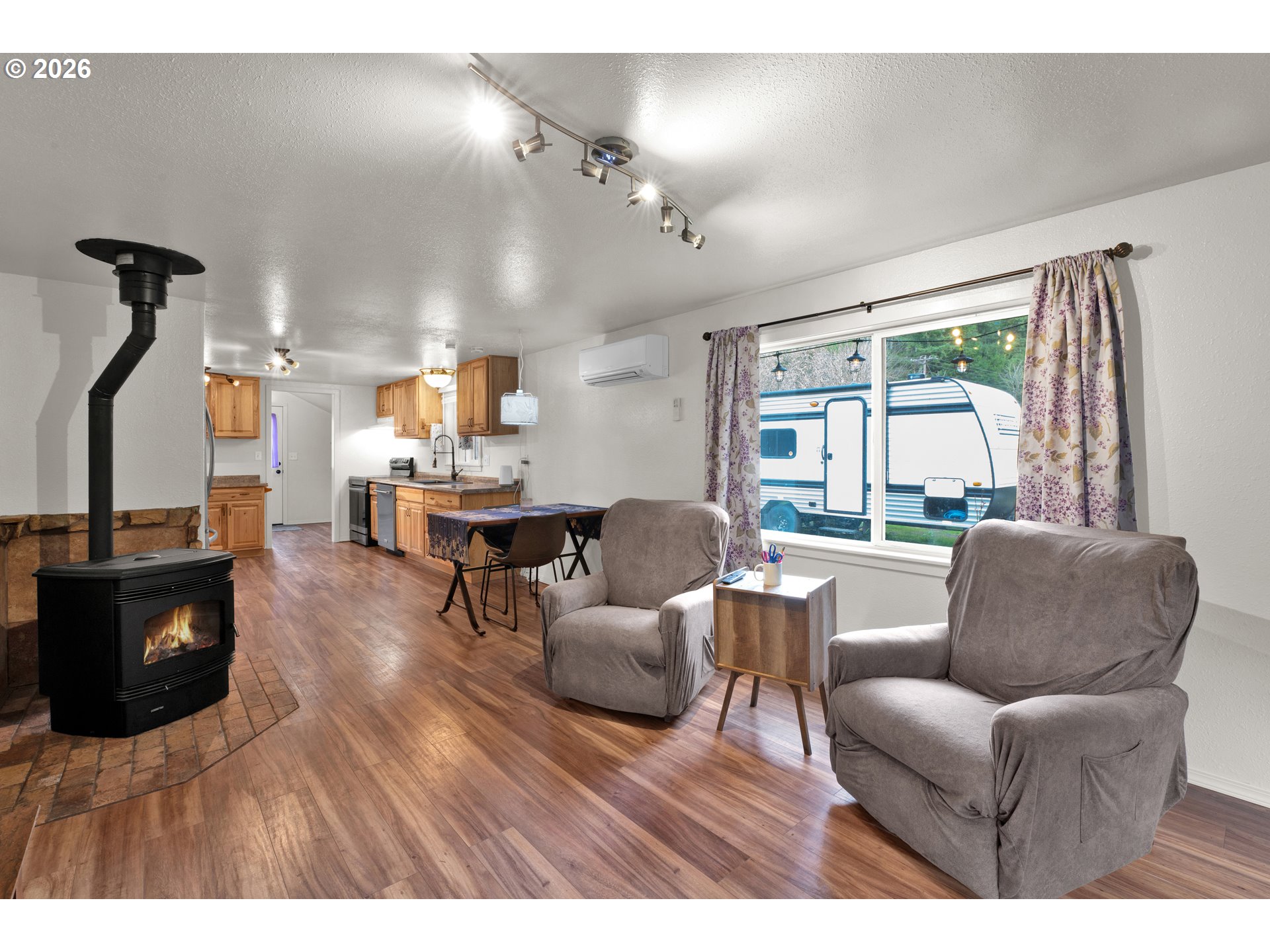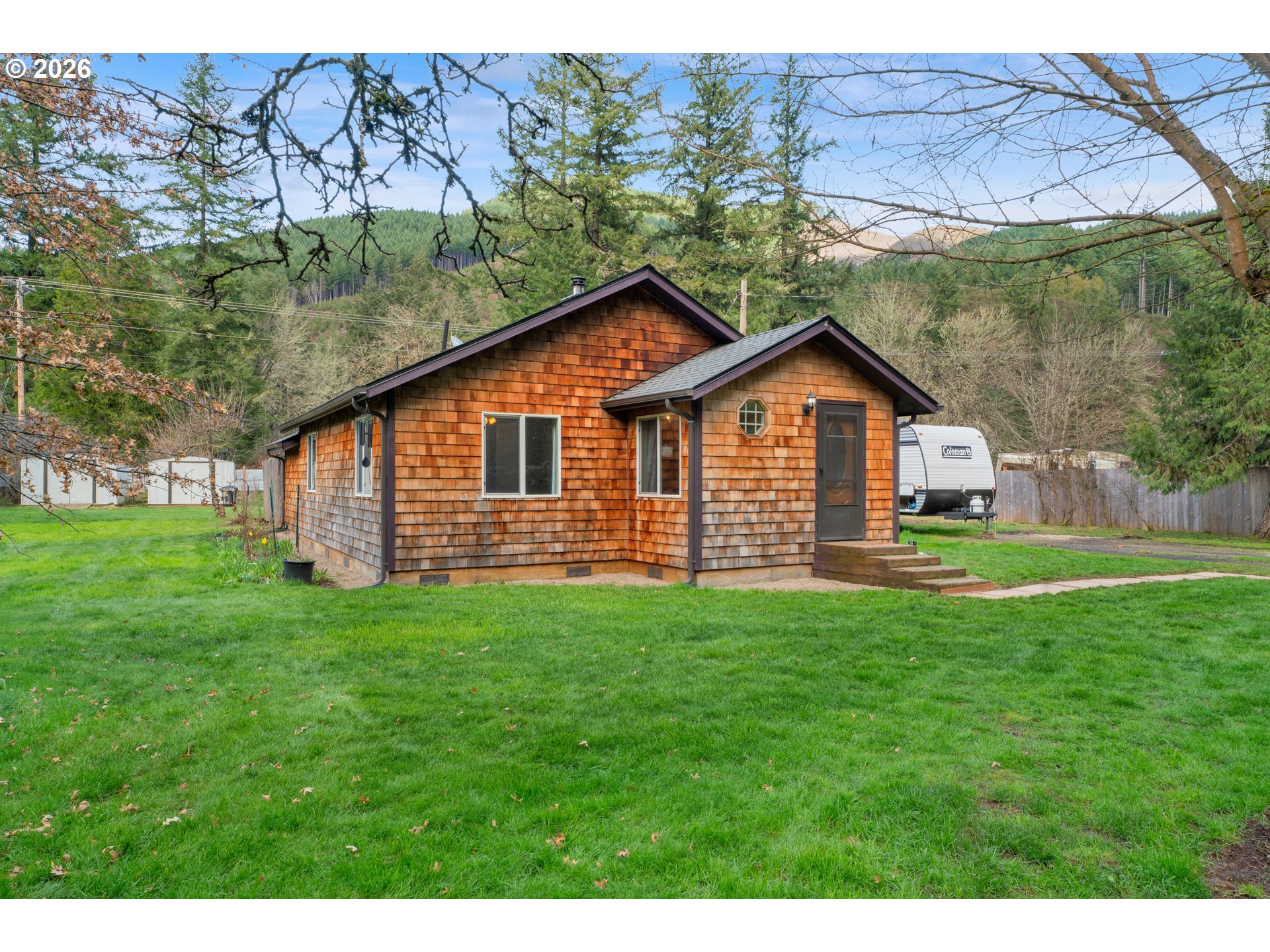 Enjoy this charming property along scenic Row River Rd, where peaceful surroundings and beautiful outdoor space create a truly inviting place to call home. Set on nearly half an acre, this well-maintained cottage offers comfortable living with a wonderful balance of indoor warmth and outdoor enjoyment. Step inside to a thoughtfully arranged living space featuring updated flooring, abundant natural light, and a welcoming layout that feels both open and cozy. The kitchen offers generous cabinet storage, ample counter space, and newer appliances including a stove range and refrigerator, making everyday cooking and entertaining both convenient and enjoyable while remaining connected to the main living area.The living room provides a comfortable gathering space, highlighted by a newer pellet stove that adds warmth and charm during the cooler seasons. Along with a ductless split system provides efficient year-round comfort in the warmer seasons. Two bedrooms and two bathrooms offer flexibility for everyday living, guests, or your home office needs.Several improvements for peace of mind, include a 2-year-old roof and updated hot water heater.Outside, the property truly shines. The spacious yard features mature landscaping and a wonderful variety of fruit trees including cherry, apple, plum, fig, mulberry, and walnut, along with blueberry plants. Garden beds and a greenhouse provide excellent opportunities for gardening, while open lawn areas offer space to relax, entertain, or expand outdoor living.Additional highlights include multiple outbuildings, RV parking, and a fenced yard offering privacy and versatility. Located just steps from the Row River Bike Trail, the property provides a peaceful setting while remaining a bike ride away to Dorena Lake and the convenient amenities in Cottage Grove, all a scenic drive away. Buyer to verify any and all information