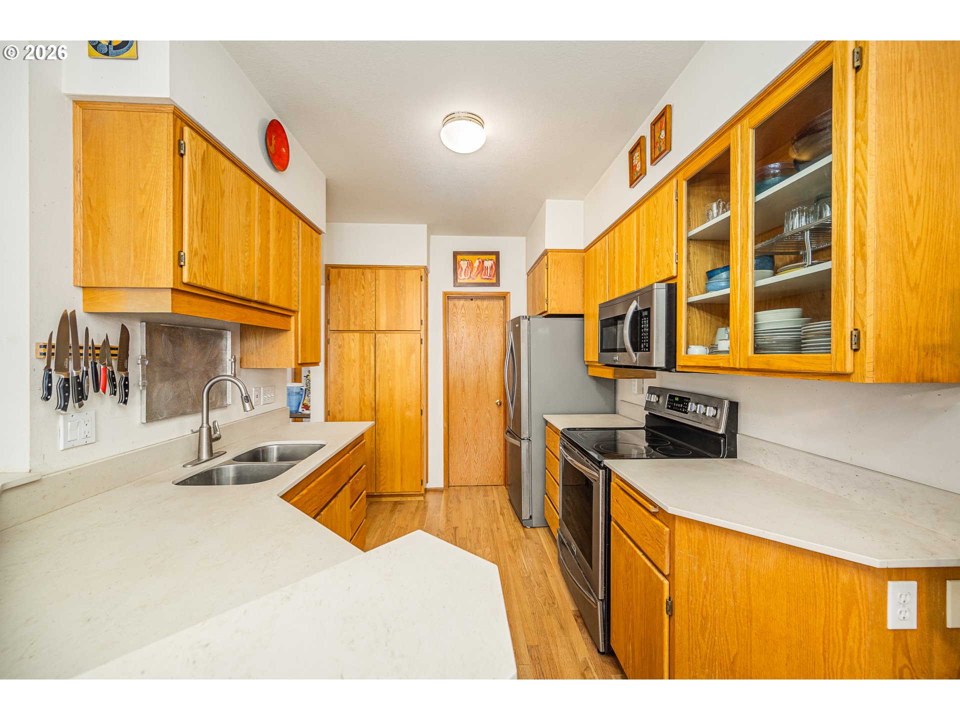 Experience elevated living in the highly desireable South Eugene hills, where modern comfort meets a serene natural backdrop. This beautifully maintained condo boasts several upgrades for total peace of mind, including a brand-new roof (2024) and stylishly upgraded flooring. The light-filled interior is kept perfectly temperate year-round with efficient heating and cooling and gas fire place, while a large sliding glass door creates a seamless transition to your private outdoor oasis. Step out onto the balcony to soak in the fresh air and enjoy stunning sunset views.