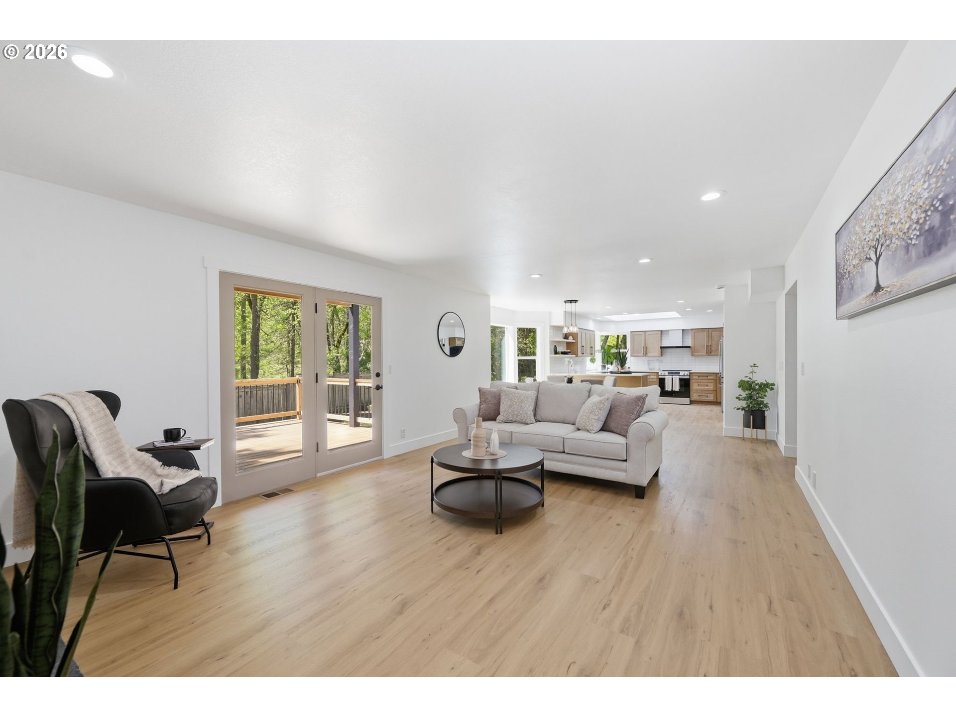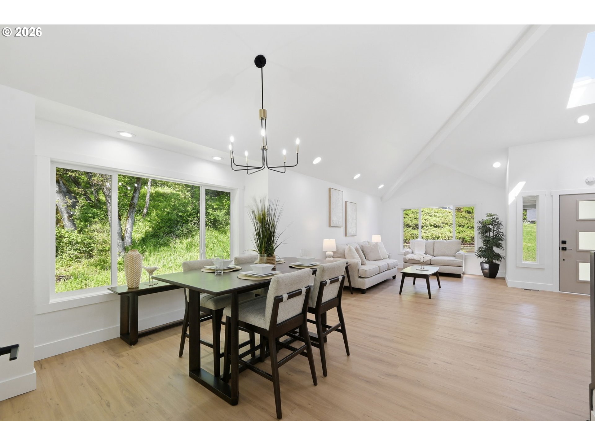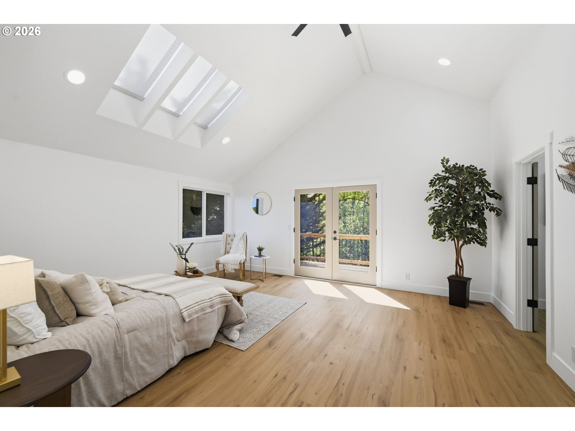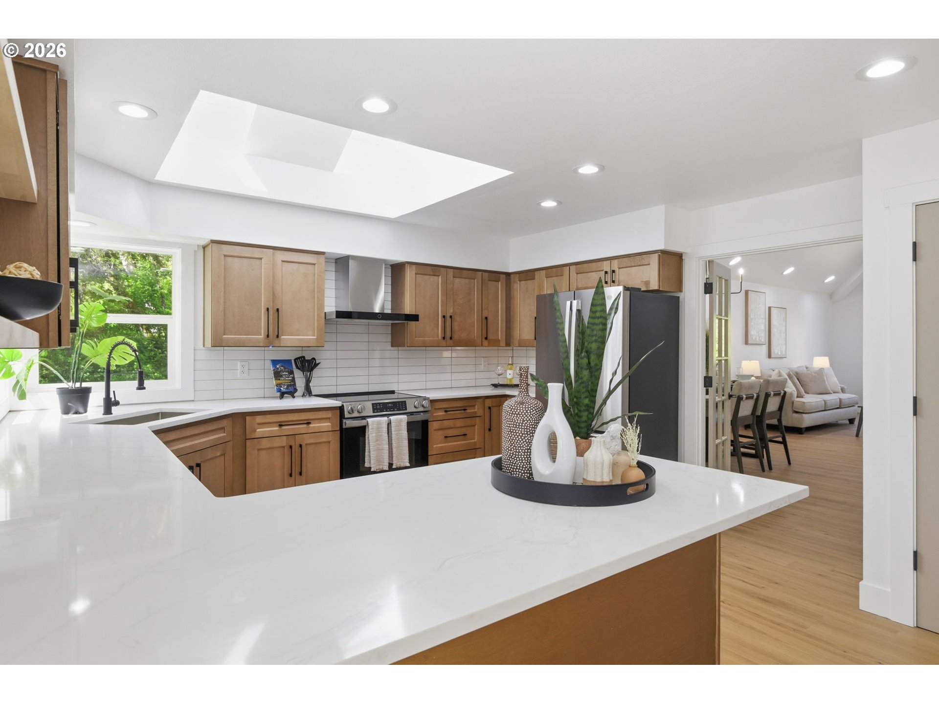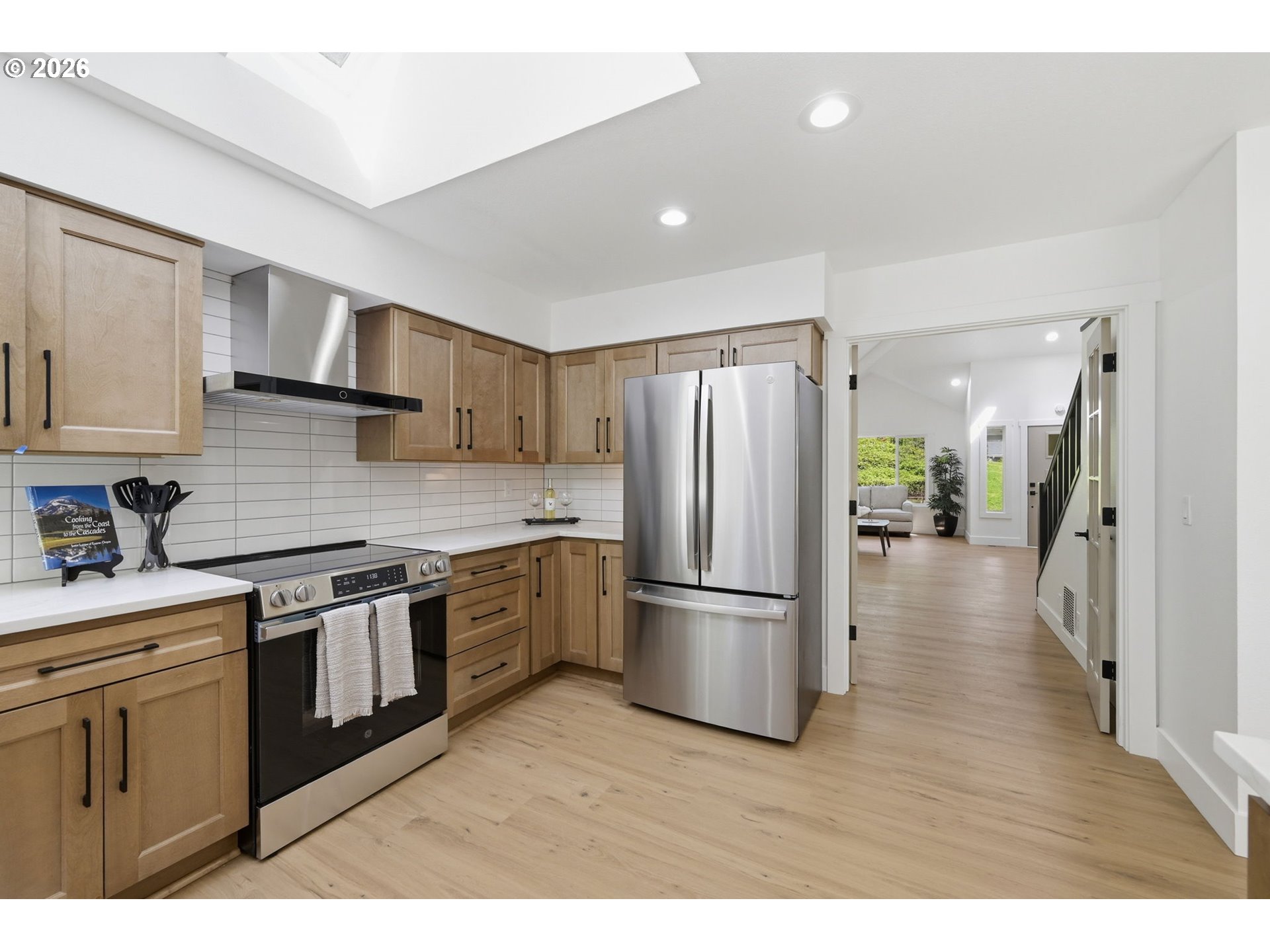 Welcome to this beautifully updated 4-bedroom, 3-bathroom home, ideally situated in one of South Eugene’s most sought-after neighborhoods. Thoughtfully updated with tasteful, high-quality finishes, this home blends elevated design with everyday livability. From the moment you step inside, you’re greeted by soaring vaulted ceilings, skylights, and an open, airy floor plan that fills the home with natural light and an immediate sense of space and warmth. The light-filled kitchen serves as the heart of the home, enhanced by skylights that bathe the space in natural light. Featuring quartz countertops, stainless steel appliances, and a seamless flow into the family room and breakfast nook, it’s perfectly suited for both relaxed mornings and effortless entertaining. The adjoining family room opens to a spacious deck overlooking the backyard—an inviting setting for indoor-outdoor living. The primary suite offers a true retreat, complete with vaulted ceilings, skylights, and a private deck with peaceful backyard views. Upstairs laundry adds convenience, while the home’s layout provides both comfort and thoughtful separation of space. On the main level, the dedicated office offers a quiet and private environment—ideal for working from home, meeting clients, or creating a focused study space, tucked away from the main living areas for added privacy and productivity. Additional highlights include a 3-car garage, central vacuum plumbing, and a new HVAC system ensuring year-round comfort and efficiency. The backyard is designed for enjoyment, featuring a basketball court and plenty of room to relax or play. Set in a peaceful, well-established neighborhood close to schools, shopping, and everyday amenities, this home offers a rare combination of sophistication, space, and location.