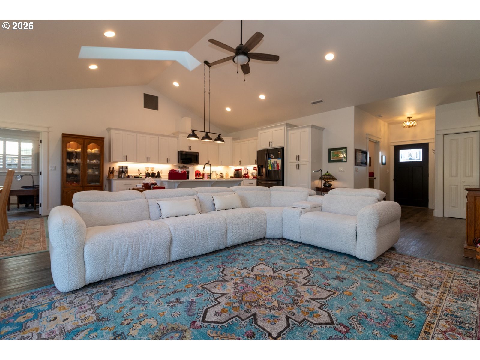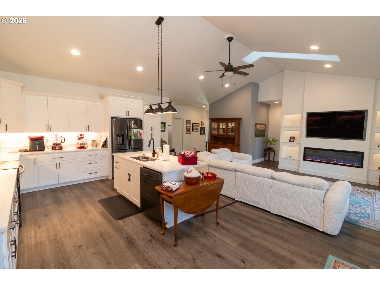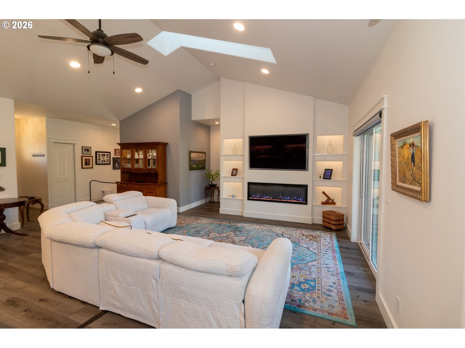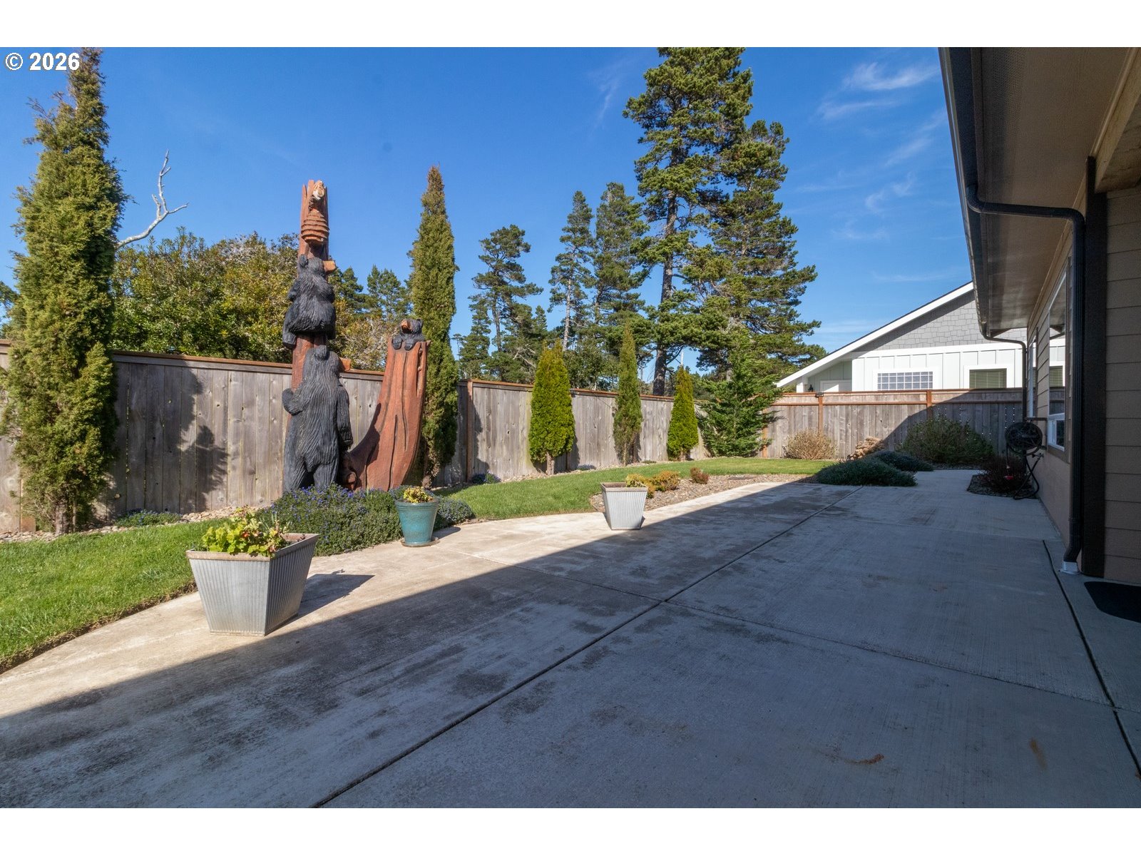 Welcome to this beautifully appointed home at Fairway Estates in Florence! Offering 2,016 sq. ft. of thoughtfully designed living space, this 3-bedroom, 2-bath home plus den sits on a spacious corner lot with both front and rear patio perfect for enjoying coastal living indoors and out. The fenced backyard features underground sprinklers, making maintenance a breeze while providing a private setting for relaxation or entertainment. Step inside to discover soaring vaulted ceilings that enhance the open, airy/feel of the home. The kitchen is standout with sleek quartz countertops, under-cabinet lighting, and quality finishes throughout. Plantation shutters add timeless style and privacy to every room, while the stunning new fireplace feature wall creates a warm and inviting focal point in the living area. Additional highlights include a generous 768 sq. ft. garage offering ample storage and workspace, along with a fully fenced RV pad - ideal for all your recreational needs. Wired for 220 V generator. Built-in electric air cleaner. This home combines comfort, style, and functionality in a prime location--don't miss your opportunity to make it yours!