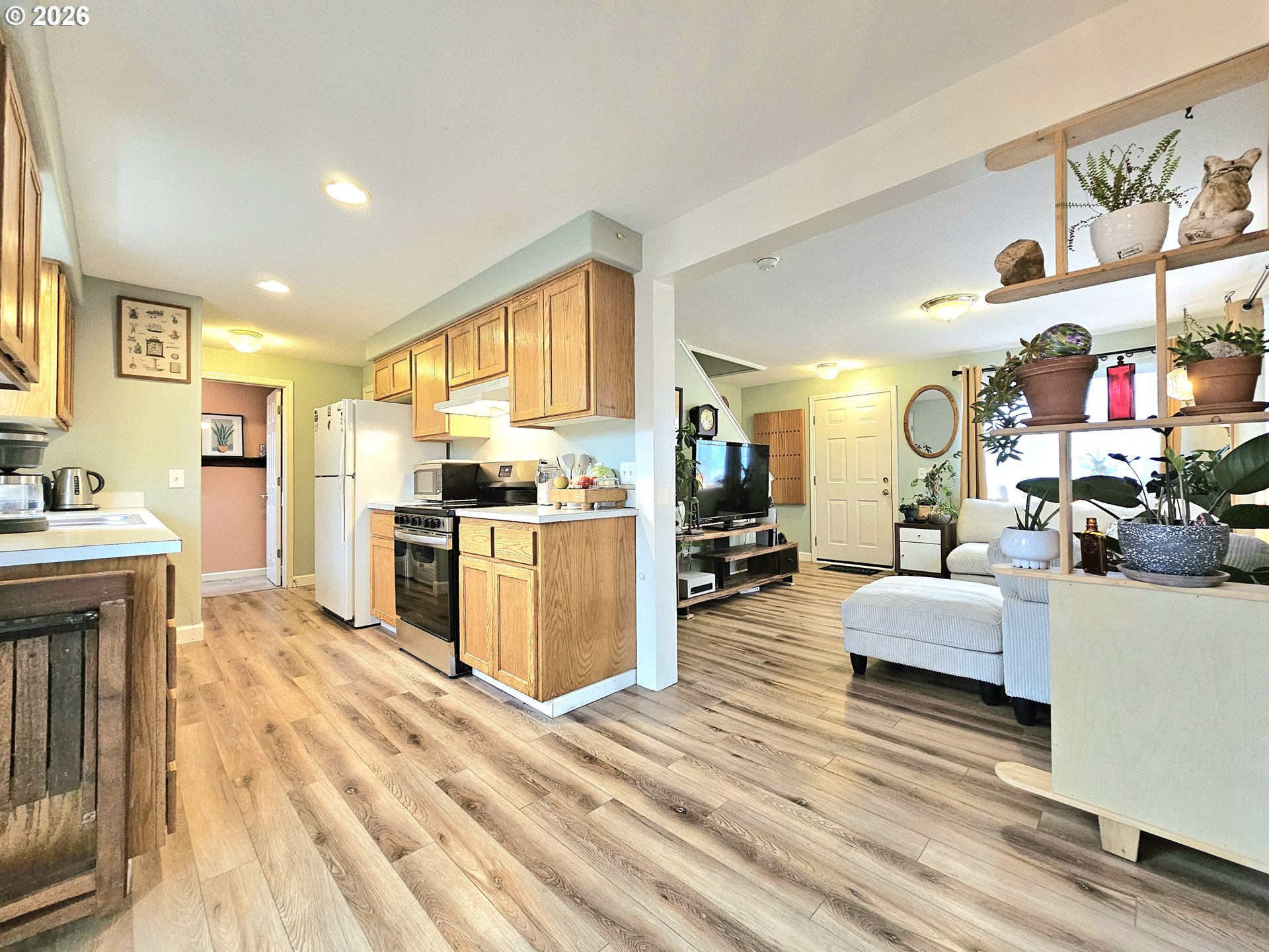 This three bedroom one and a half bath tandem home in a cul-de-sac has so many updates and low taxes, it's a must see!! Special features include hickory look luxury vinyl plank flooring throughout, even on the stairs and travertine style luxury vinyl tile in the bathrooms. Upgraded baseboards downstairs and a beam and built-in shelving feature between the living room and dining room. Low maintenance yard with raised garden boxes in front and back. Surround sound via Bluetooth connected lighting in hallway, kitchen, and upstairs bathroom. Deep closets in all the bedrooms and a walk-in closet in the upstairs hallway. Remodeled bathrooms that had lighting, mirrors, counters, sinks, plumbing, dual flush toilets, faucets, paint, and flooring redone. Newer roof, interior and exterior paint, & so much more! All three bedrooms and the full bath are upstairs with nice separation of space between the primary suite and the other two bedrooms. Downstairs the living room flows into the dining room. The dining room slips seamlessly into the kitchen with the laundry area, half bath, and garage access beyond that. Thru the slider off the dining room, you'll find a lovely metal gazebo with curtains creating a private entertaining space, dog wood and red willow trees, plus garden boxes galore all within a private fully fenced piece of birdwatching heaven. A short 3 minute walk around the block to Hanover St. will lead you to the hidden and peaceful Rainbow Lake with walking trails, seating, and scenic views. Whether you're an investor looking for a deal on a low maintenance rental property, first time buyer ready to find your own affordable home to begin earning equity in, or someone looking to downsize without HOA rules and regulations, this is the home for you! Call your favorite Realtor for a tour today before it's gone!!