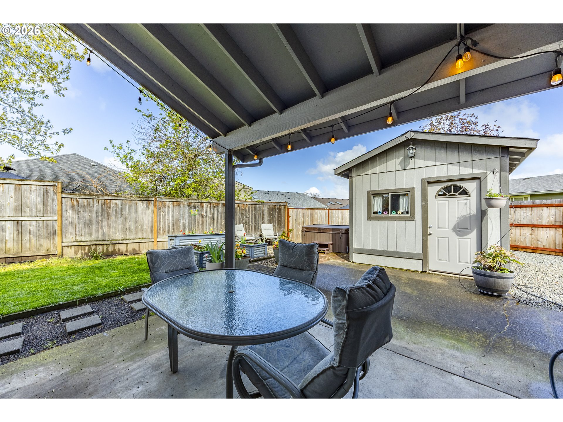 This lovely 1 level home lives much larger than the square footage. Vaulted ceilings in the main living area make for gracious enjoyment of the space. French doors lead to a covered patio area complete with a powered garden workshop, a hot tub & darling raised bed garden area. The oversized double car garage is insulated, heated & equipped with a big utility sink which makes it wonderful bonus flex space for work or play. There is plenty of auxiliary parking for your recreation vehicles, boat & trailer alongside the garage & additional fenced parking.