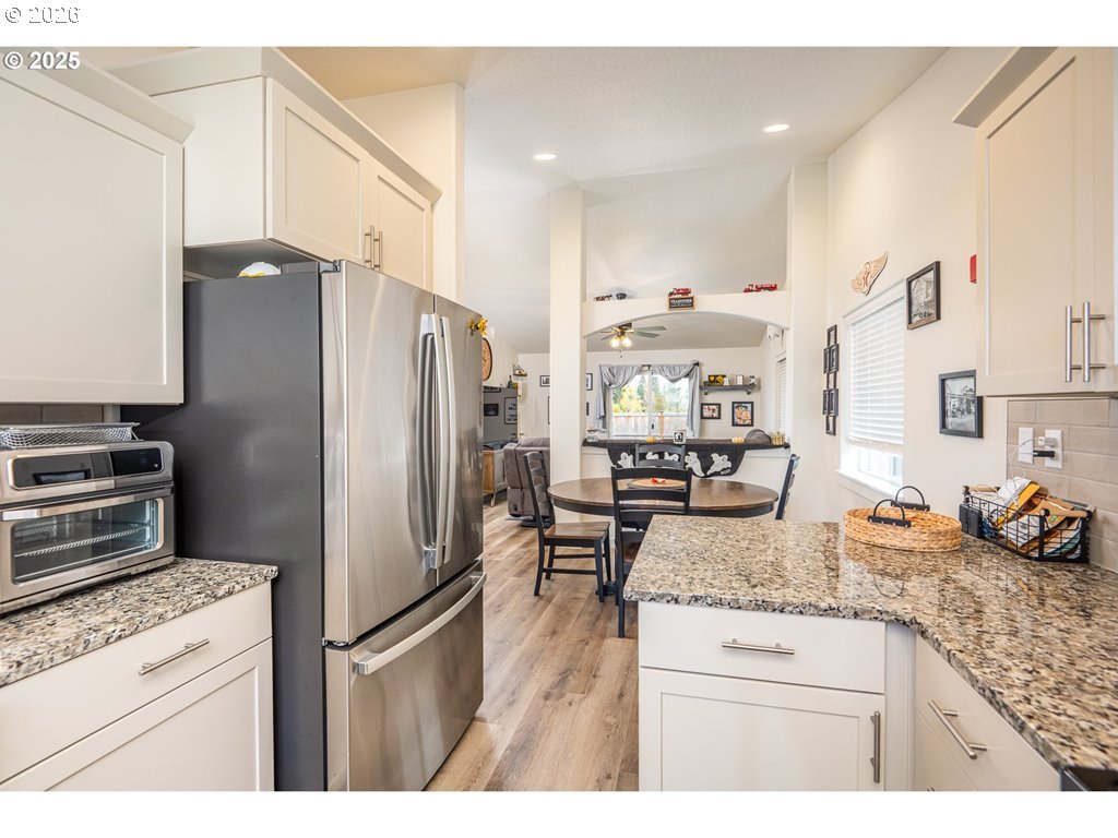 Wake up to breathtaking mountain and tree views from this beautifully designed, single level contemporary home nestled in the sought after Woodland Ridge community in the Thurston area of Springfield. This home delivers 1,235 square feet of thoughtfully designed living space with 3 bedrooms, 2 full bathrooms, and a 2 car attached garage. Soaring vaulted ceilings in the living and dining areas create an open, airy atmosphere that feels larger than the square footage suggests. The front facing kitchen is loaded with granite countertops, stainless steel appliances including a built in range, microwave, and dishwasher, and generous counter and cabinet space. Luxury vinyl plank flooring flows throughout the main living area, kitchen, dining room, bathrooms, and laundry room, while plush carpet adds comfort to the bedrooms. The primary suite is a true retreat, offering two closets and a private ensuite with dual vanity. Two additional bedrooms share a well appointed second full bathroom. Step outside to a covered patio where you can take in the stunning mountain and wooded views that make this location truly special. Additional highlights include central air conditioning, forced air heating, double pane vinyl windows, large front and back yard with an irrigation system. Situated just minutes from Highway 126, grocery stores, restaurants, and top rated Thurston area schools, this home combines the tranquility of a newer community with the convenience of everything Springfield and Eugene have to offer. Outdoor enthusiasts will love being a short drive from Mt. Pisgah Arboretum and the McKenzie River. This one checks Every Box. Schedule your Showing Today.