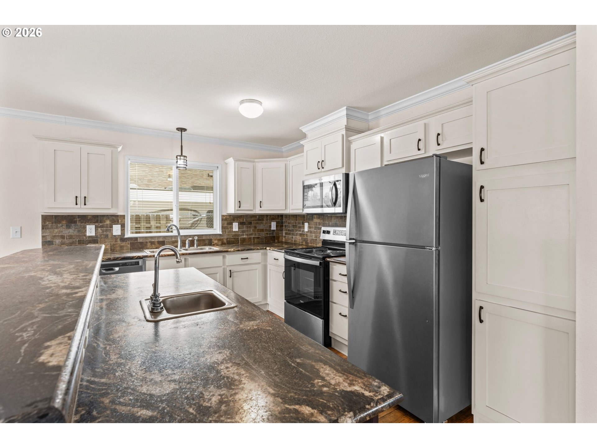 This 2020-built single-level home delivers new construction quality with genuine craftsman character. A cedar-decked covered front porch with white railings and stacked stone skirt sets the tone before you step inside.The open great room flows seamlessly from warm laminate floors into a well-appointed kitchen featuring white shaker cabinets, a large espresso island with prep sink, slate tile backsplash, and a full stainless appliance package. A dedicated dining area with pendant lighting completes the space.The primary suite offers a true walk-in closet with dual shelving, ceiling fan, and a private en suite with glass-door shower. Two additional bedrooms with sliding closets share a second full bath with tub/shower combo. Dedicated laundry room with washer and dryer included. Step outside to a fully fenced yard with a barn-style storage shed. Come see it in person!