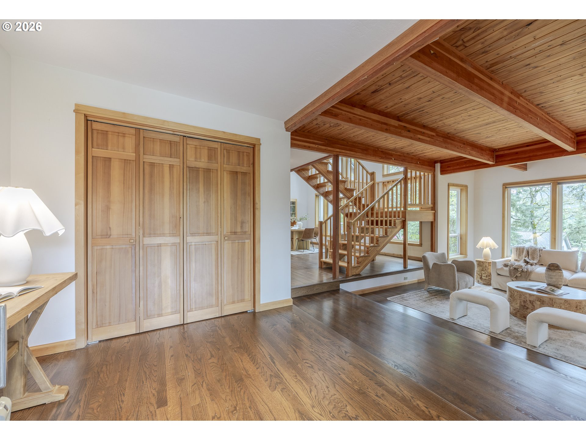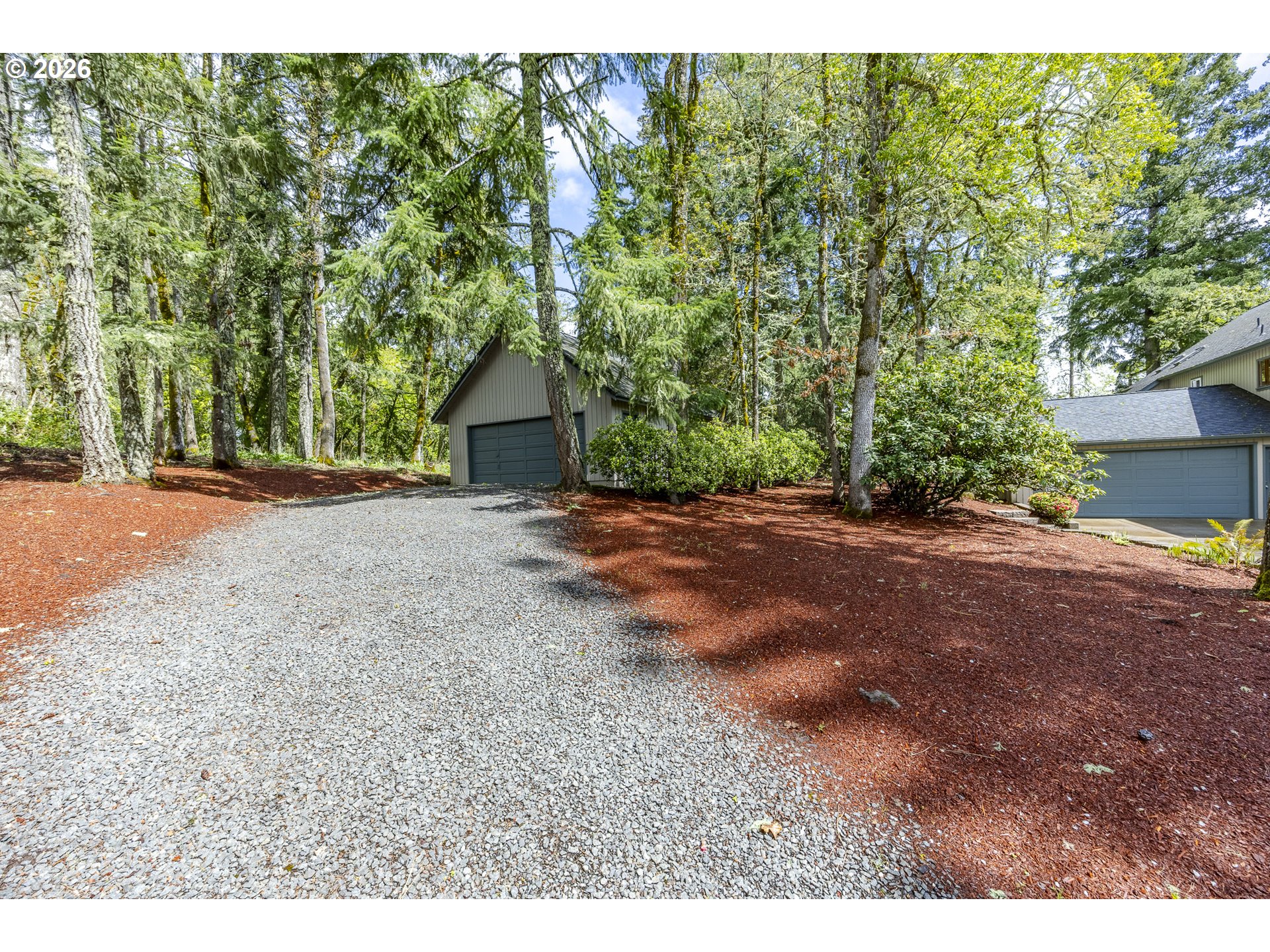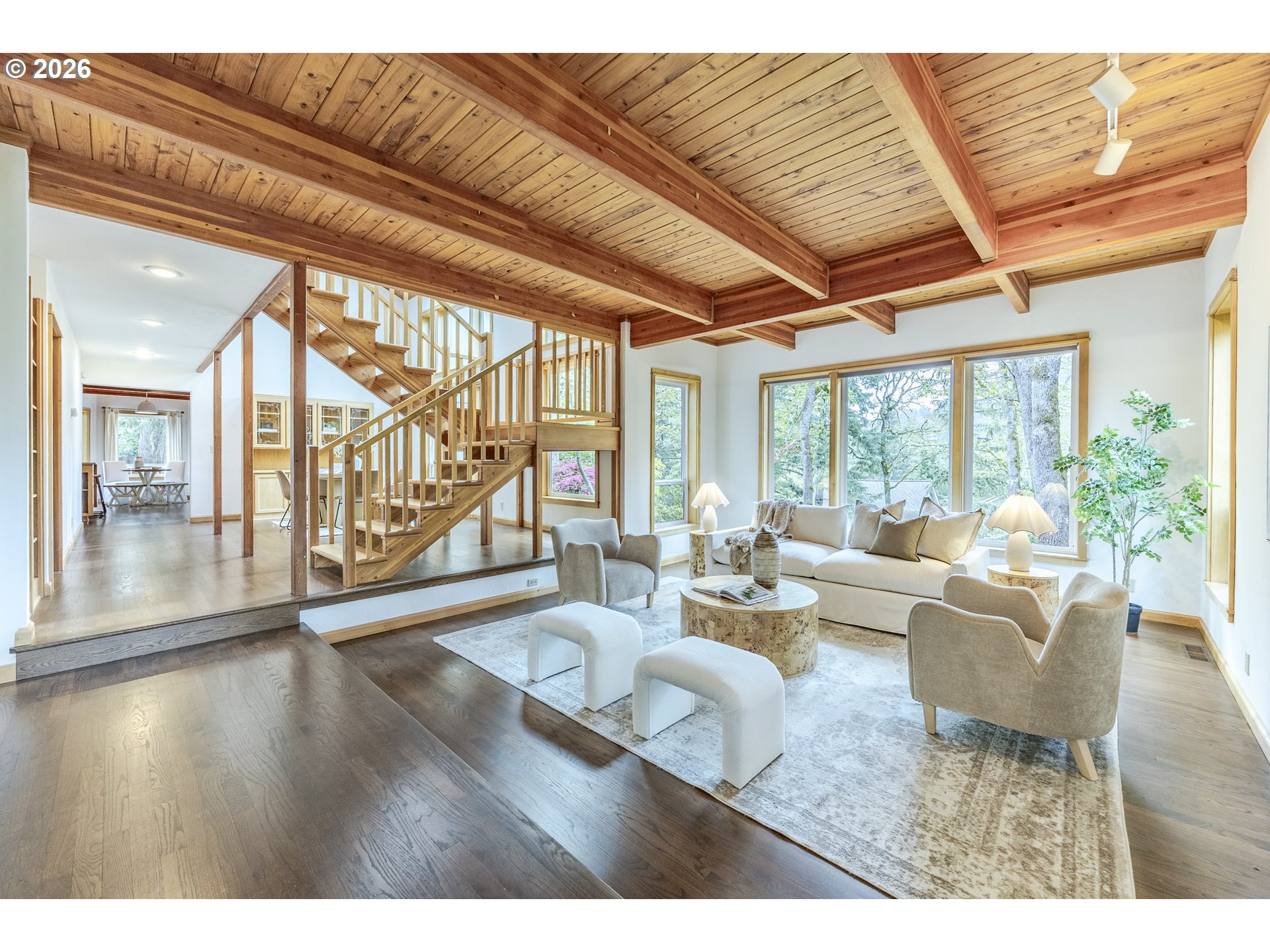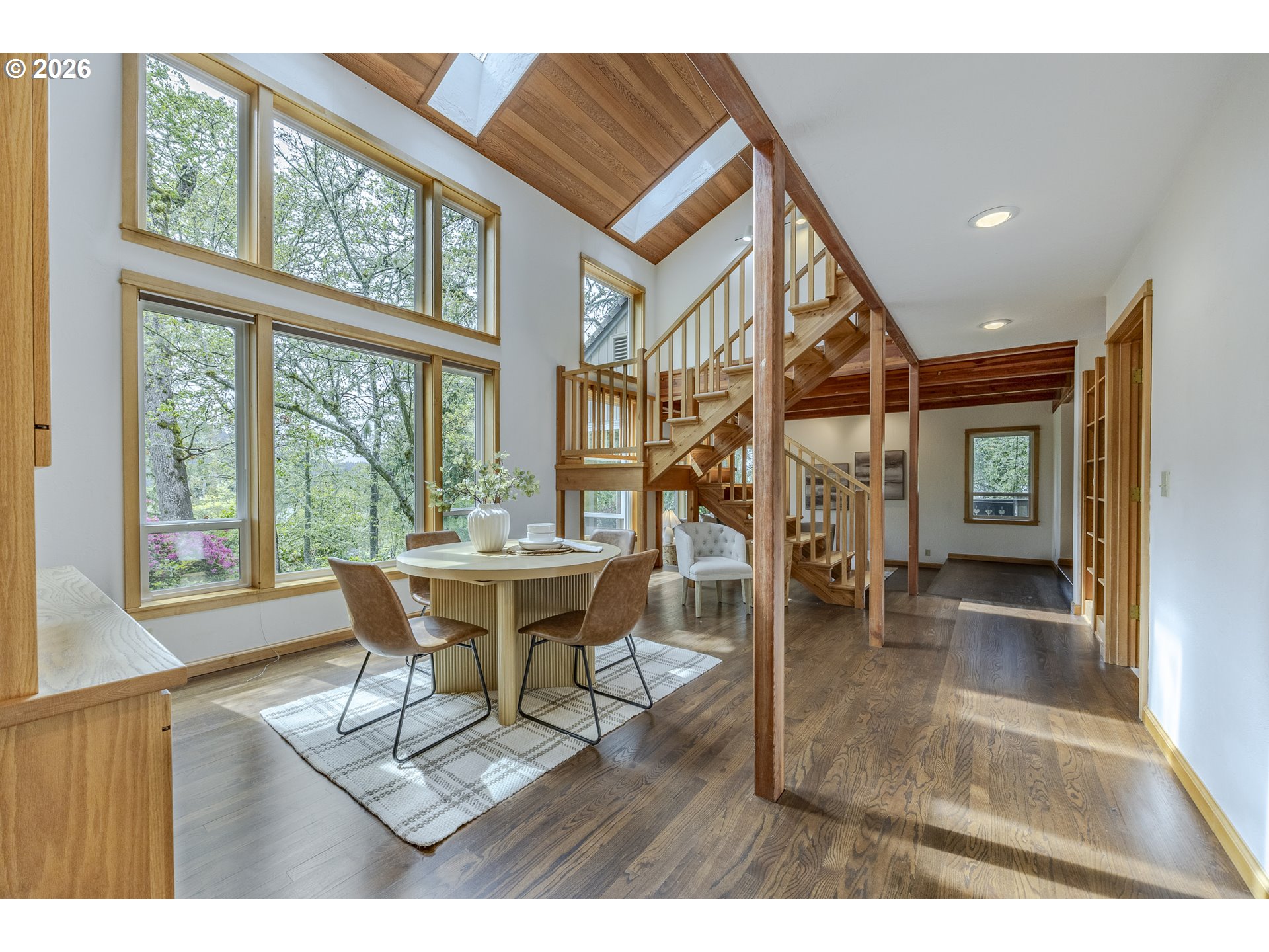 Tucked away on a private driveway and set on .71 acres, this inviting property offers a rare blend of privacy, space, and natural beauty—all within town and with views of Spencer Butte. Surrounded by a park-like setting, the home welcomes you with a charming front porch complete with a swing. Inside, distinctive architectural details shine throughout. The home opens to a stunning living room featuring a wall of windows, exposed beamed ceilings, and rich hardwood floors that bring warmth and character to the space. The formal dining room flows into a thoughtfully designed kitchen with an eat-at island, as well as a cozy bay window dining nook. The family room, anchored by a fireplace, opens into a spacious sunroom with tile flooring and direct access to the deck—ideal for entertaining or enjoying indoor-outdoor living year-round. A convenient main-level laundry room offers built-in desk space and abundant storage. Upstairs, a versatile loft with built-in bookcases and desk provides the perfect space for a home office, reading retreat, or workout area. The ensuite primary bedroom features vaulted ceilings and a walk-in closet, while two additional bedrooms each offer their own unique charm with built-ins, skylights, vaulted ceilings, and walk-in closets. Outdoors, the expansive property invites exploration and boarders the Ridgeline Trail system. Not only do you have an attached two car garage there is an additional detached two-car garage that includes a dedicated workspace, adding flexibility for hobbies or storage. Carefully updated while preserving its original character, this home beautifully blends timeless design with modern comfort—truly welcoming the outdoors in.