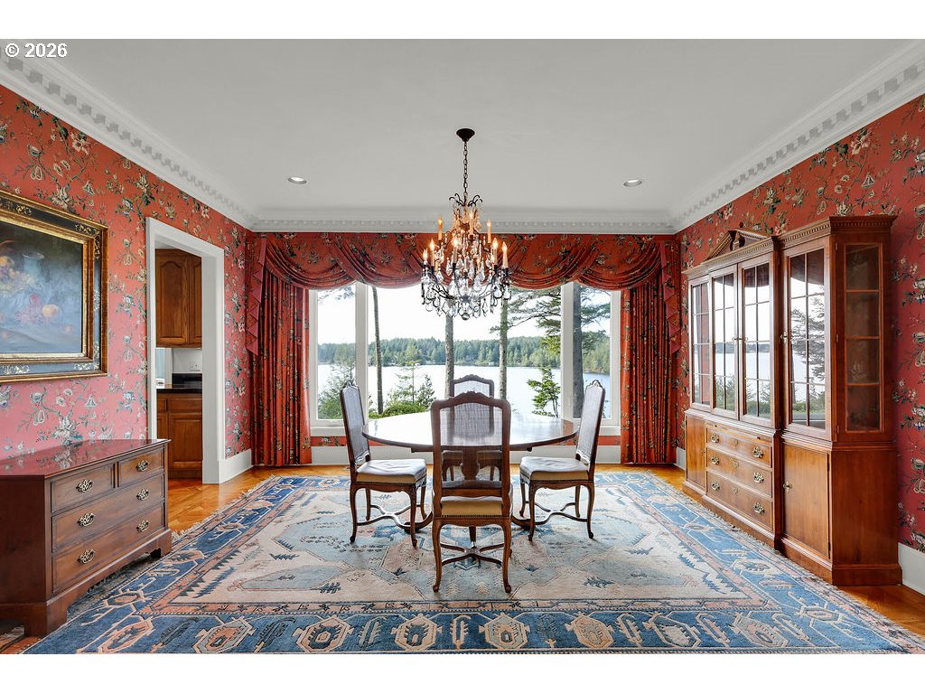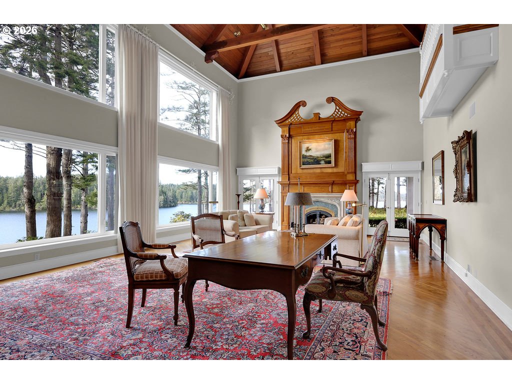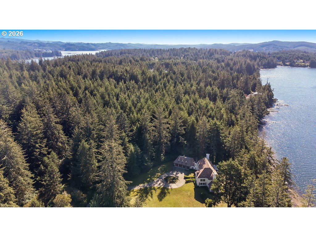 (503) 893-8874Tucked away on 20.29 lush waterfront acres with 1,358 feet of pristine lake frontage, this extraordinary fairytale castle estate offers a rare opportunity to own one of the most exceptional properties on the Oregon Coast. As you arrive, a sense of grandeur and privacy unfolds, and breathtaking panoramic lake views greet you from nearly every vantage point. Inspired by the timeless elegance of the luxury villas of Lake Como, this remarkable residence transports you to an era of refined craftsmanship, relaxed sophistication, and understated luxury. Every detail has been curated to evoke old-world charm while offering modern comfort.Handcrafted wood floors flow throughout in exquisite herringbone, Versailles, and chevron patterns, showcasing artistry and attention to detail. A dramatic two-story foyer welcomes you with sweeping sightlines through the formal dining room and out to the shimmering lake beyond. The grand library is a true showpiece—an architectural masterpiece of custom woodworking. Featuring a spiral wood staircase, built-in shelving, and a mezzanine wraparound balcony connecting to the second floor, this inspiring space is filled with natural light from abundant windows, including stunning stained-glass accents.The magnificent living room soars two stories high, highlighted by open wood beam ceilings and a balcony overlook above. A handcrafted fireplace rises nearly from floor to ceiling, serving as both focal point and gathering place. Expansive windows frame the lake, offering tranquil water views and ever-changing light throughout the day.Designed for entertaining and everyday enjoyment, the chef’s kitchen is equipped with stainless steel appliances, a gas range, and generous workspace. A cozy dining nook with its own fireplace creates the perfect setting for intimate meals, while sliding doors open to a covered patio for spectacular sunset views. This is more than a home—it is a private lakeside sanctuary.