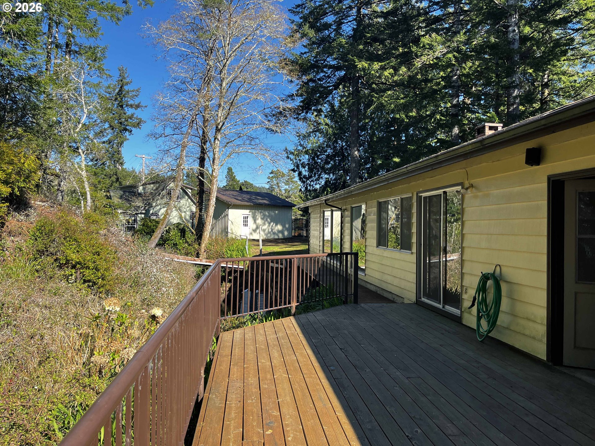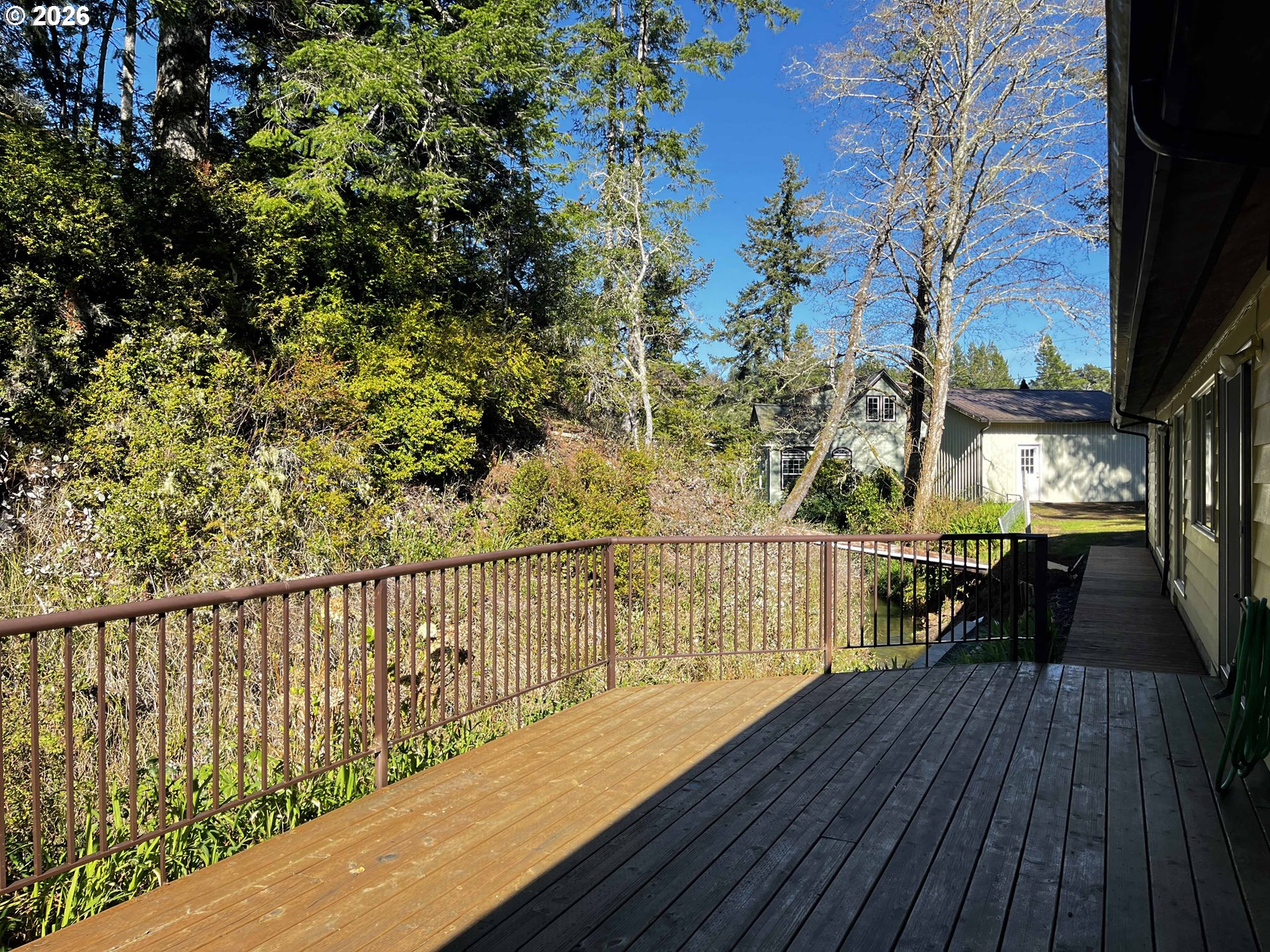 Welcome to this charming 3-bedroom, 2-bathroom home that perfectly blends comfort, functionality, and natural beauty. The spacious living room is filled with natural light thanks to a stunning wall of windows, and features a cozy wood-burning fireplace—ideal for relaxing evenings. Pocket doors provide a seamless transition into the kitchen, which is thoughtfully designed with built-in appliances including a dishwasher, range, and oven, along with a corner sink and a bright eat-in area. The dining room offers direct access to the outdoors through sliding glass doors, opening onto a large deck and walkway that overlook a peaceful creek, surrounded by trees for added privacy. It’s a perfect setting for entertaining or enjoying quiet mornings in nature. Additional highlights include a bonus room off living room (not included in sq footage), side yard with a convenient storage shed equipped with a roll-up door, as well as an attached 2-car garage with built-in storage solutions. This home offers both practical features and a serene setting—an ideal place to call your own.
